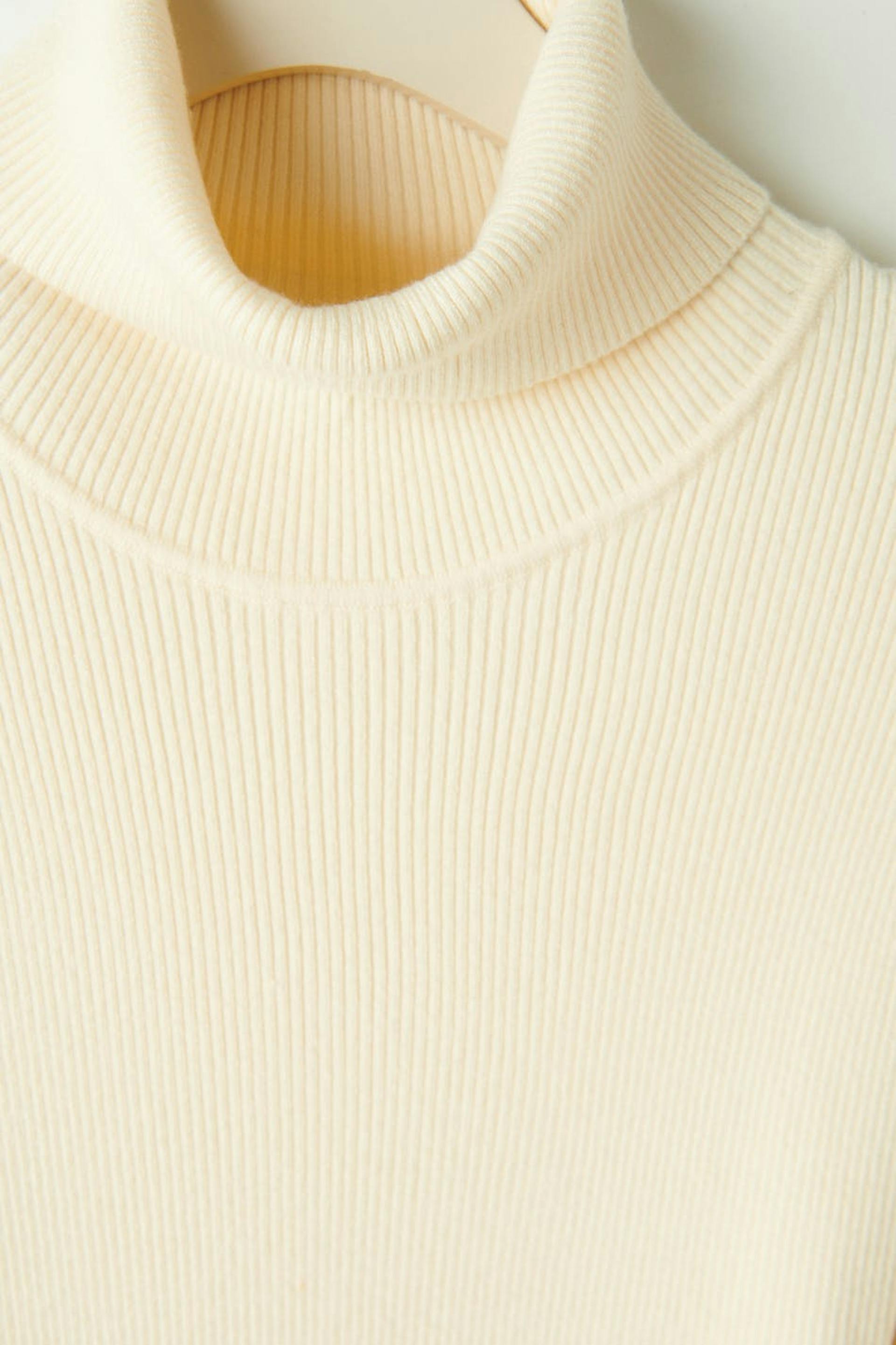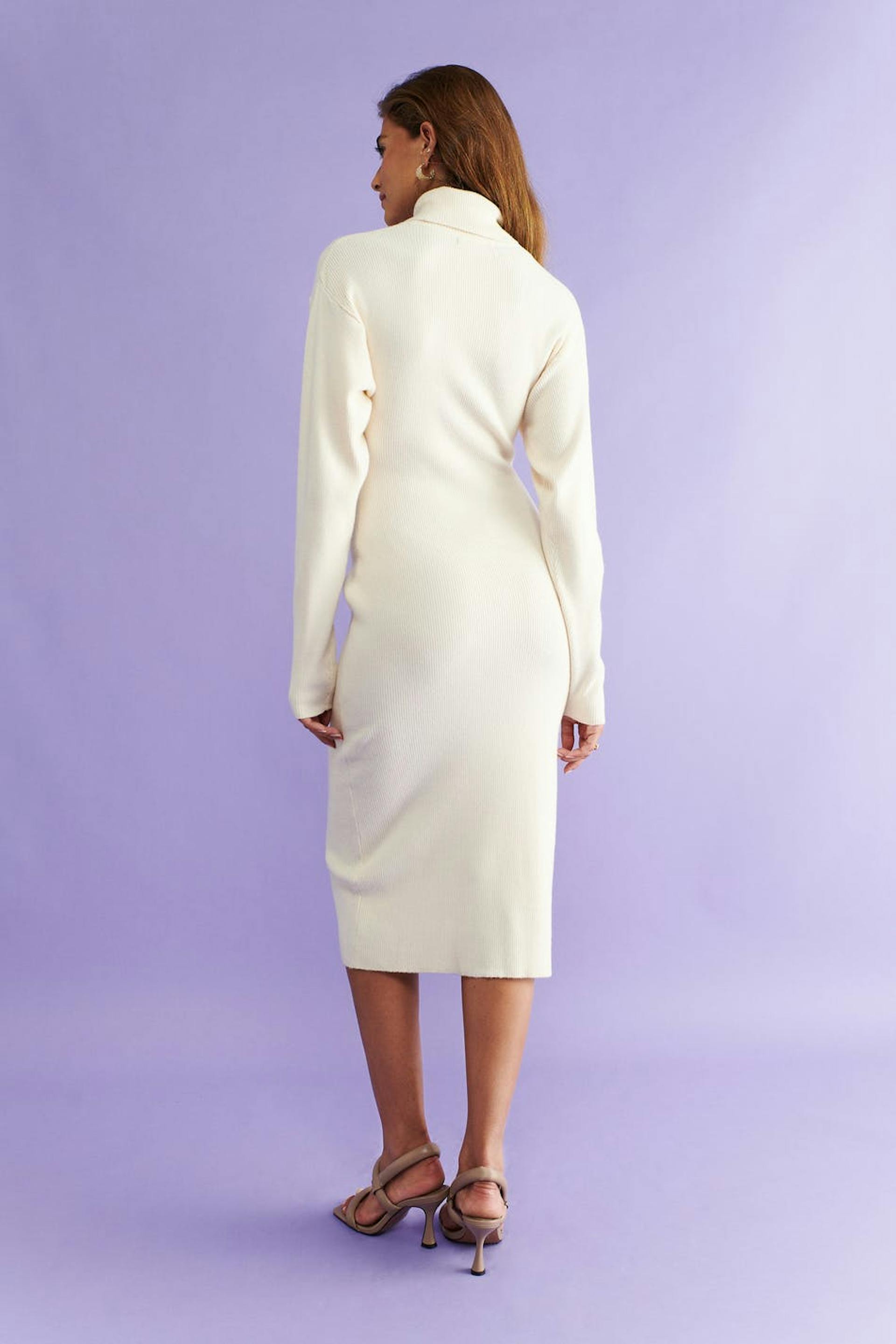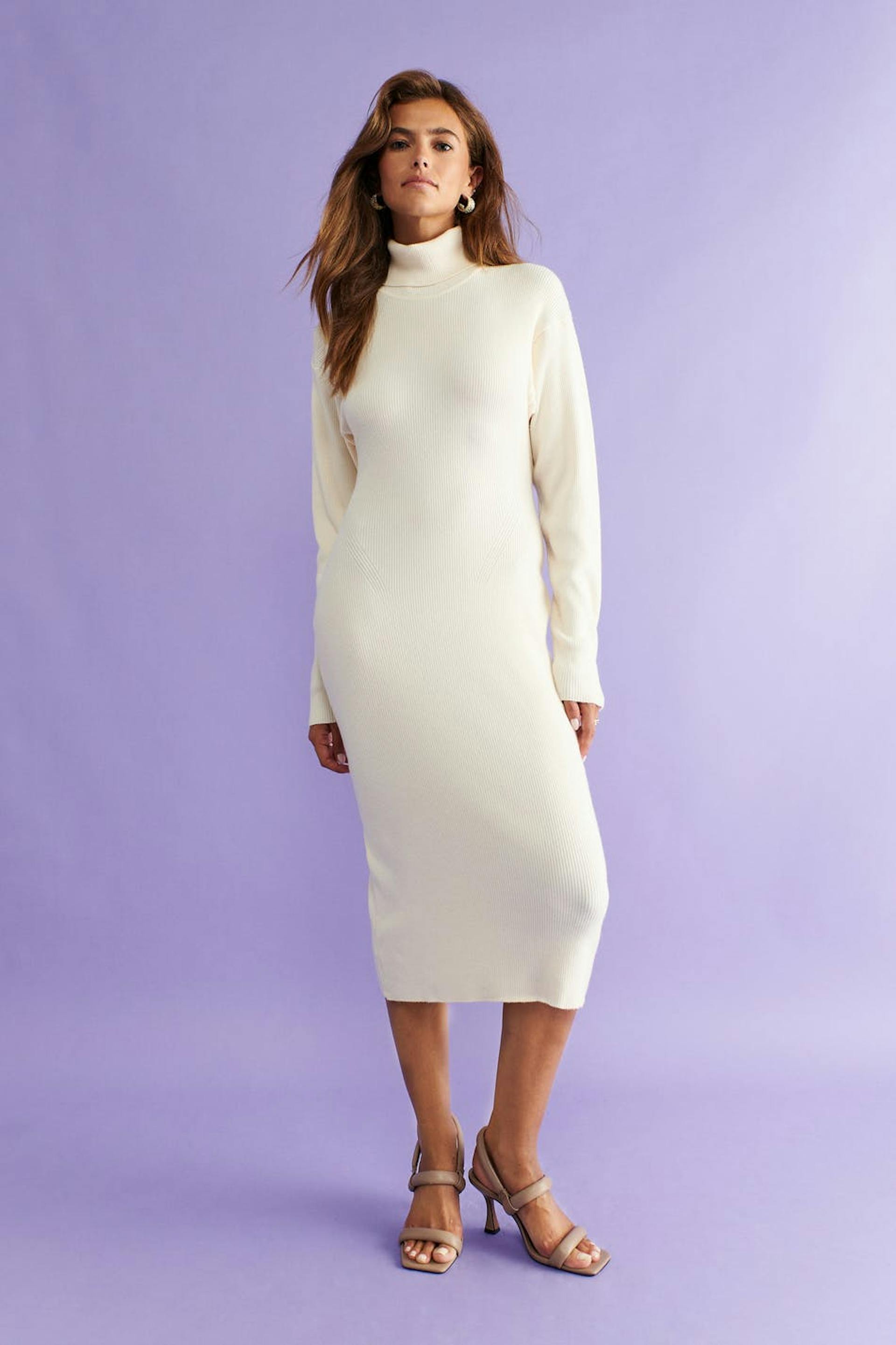 Långärmad stickad klänning med polokrage. Klänningen är vit och har figurnära passform. Den har en midilängd och formstickade partier i sidorna.