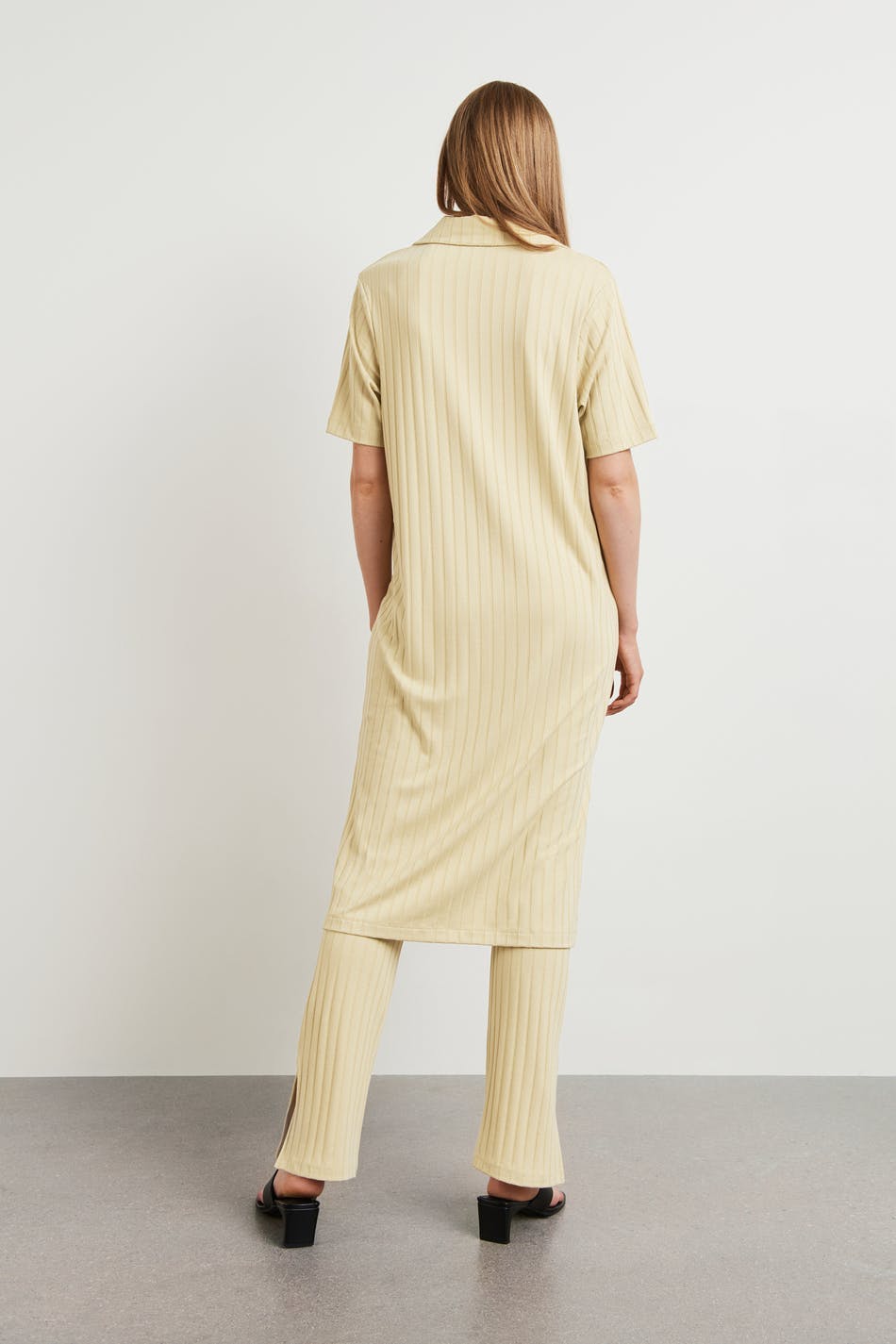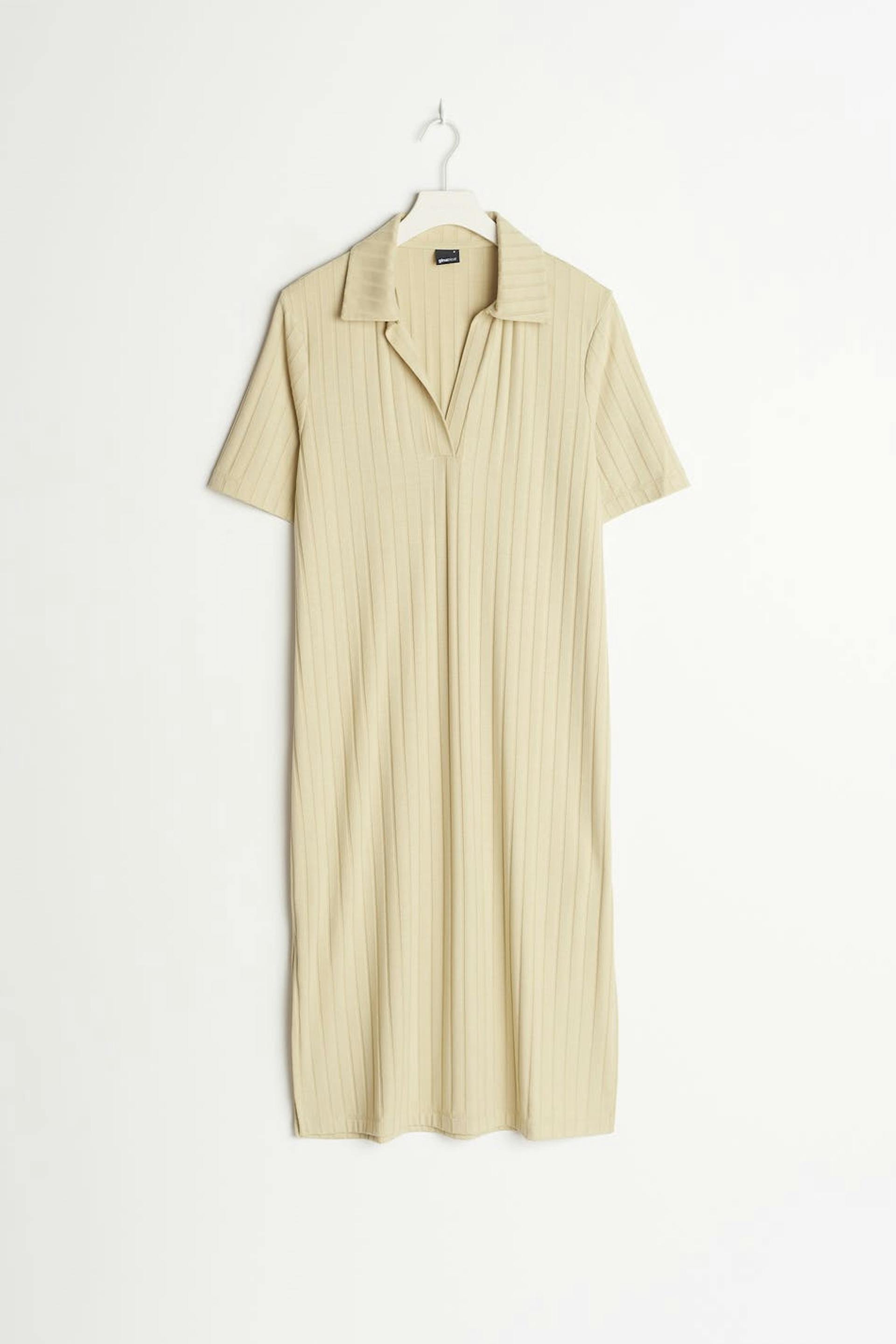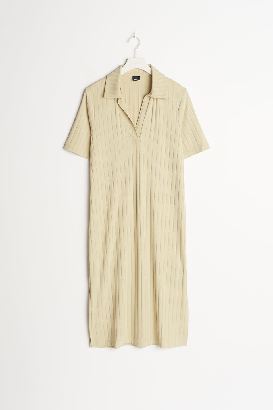 Ribbad klänning med oversize fit. Klänningen är beige och har en slits på sidorna. Den har en midilängd, korta ärmar, en v-ringning och en krage.