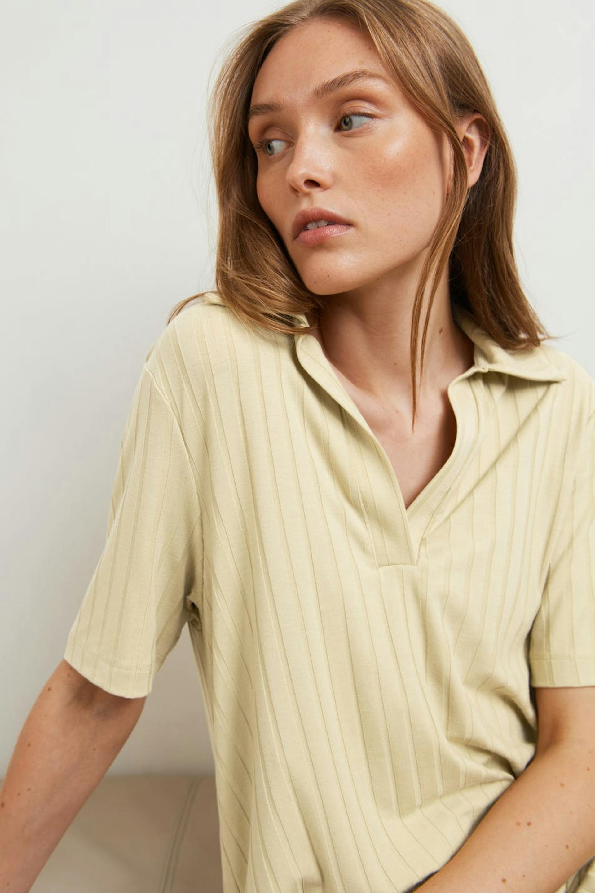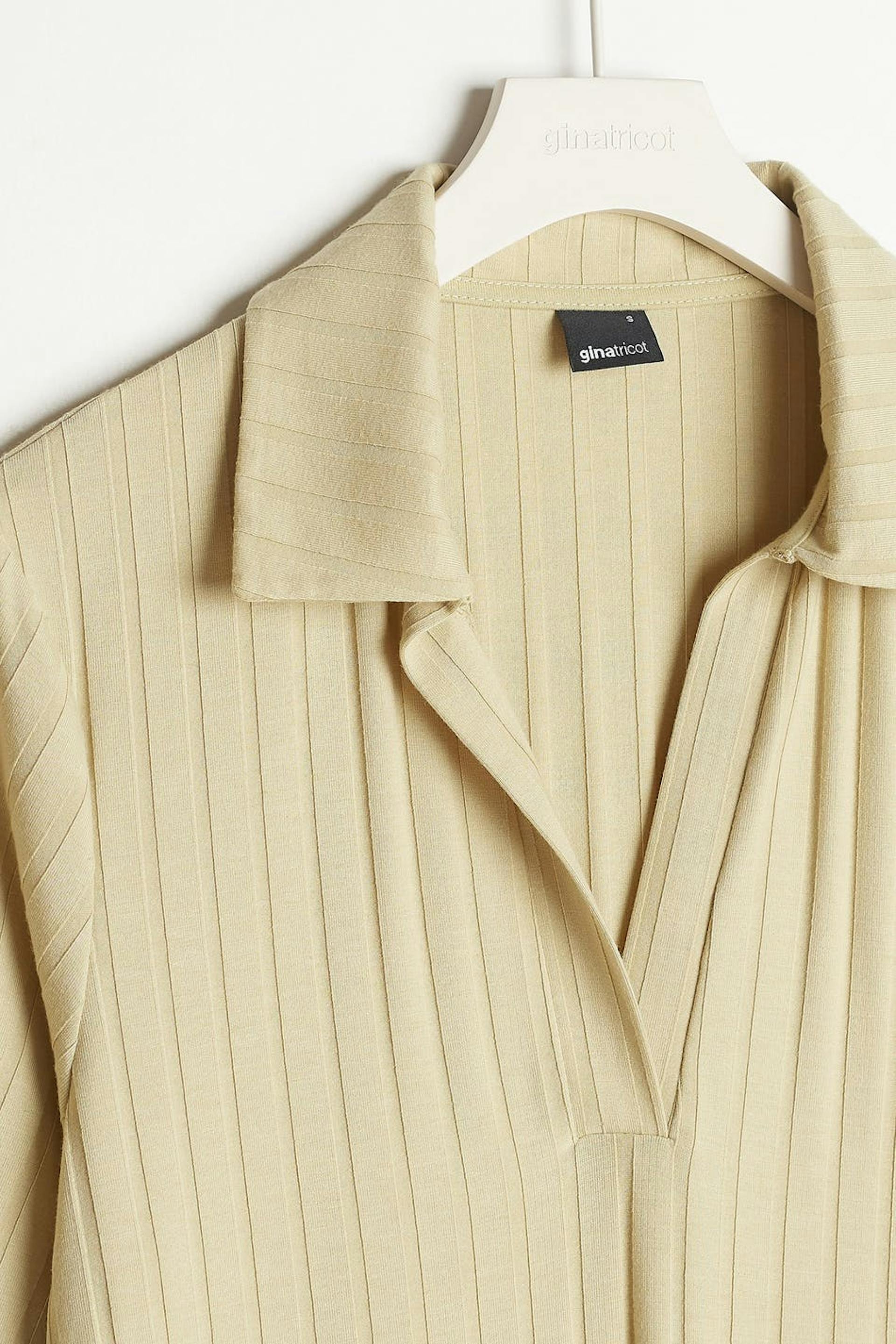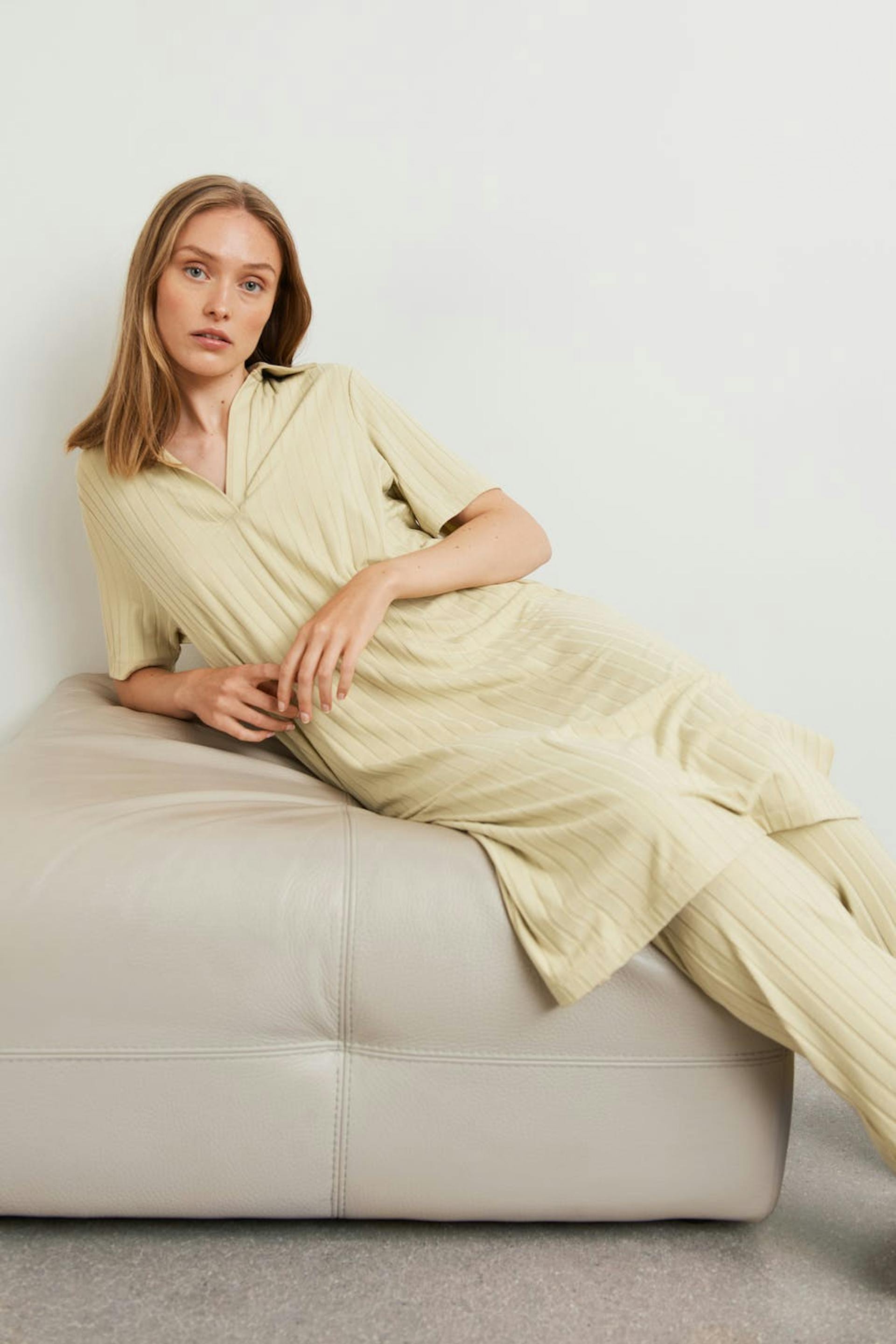 Ribbad klänning med oversize fit. Klänningen är beige och har en slits på sidorna. Den har en midilängd, korta ärmar, en v-ringning och en krage.