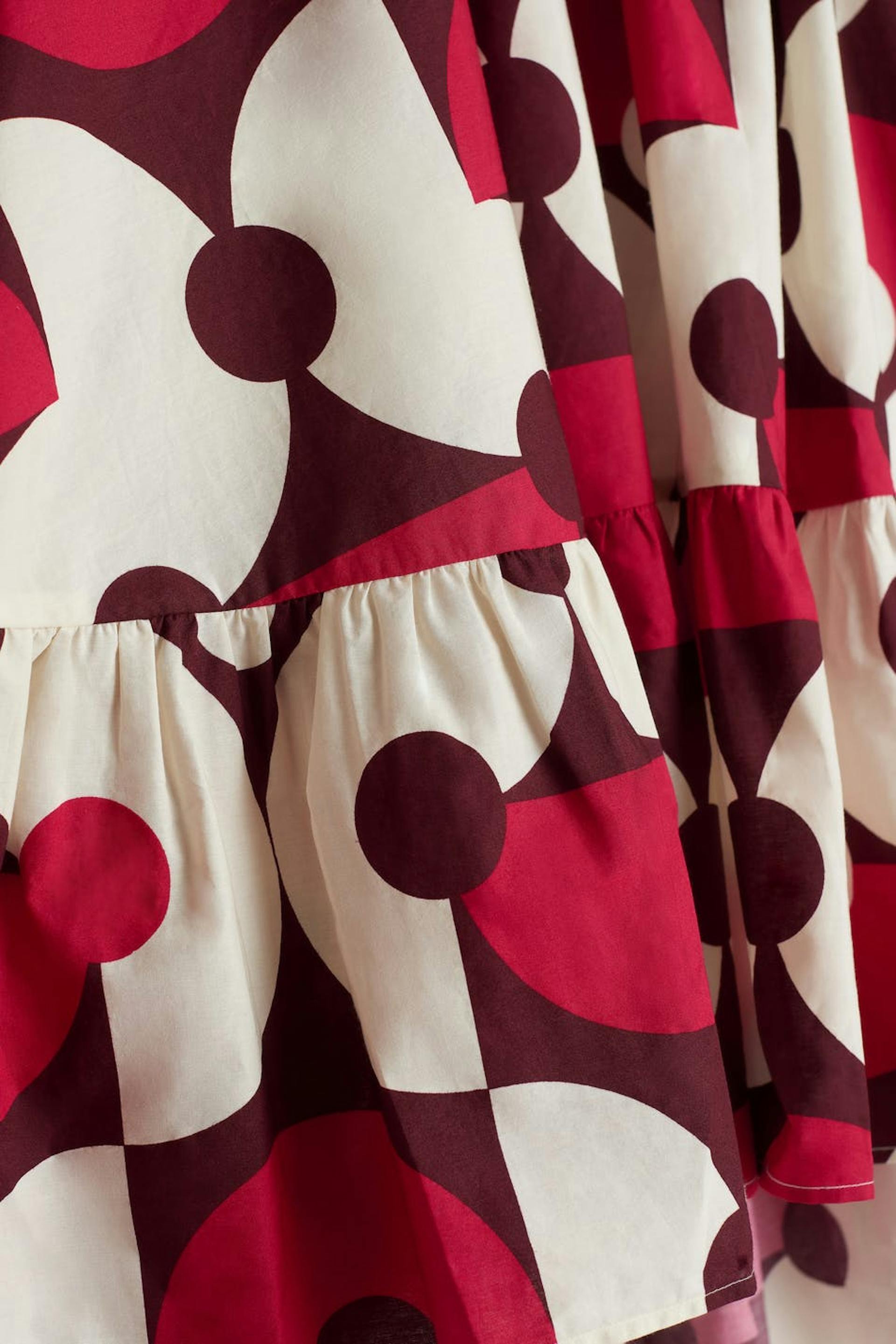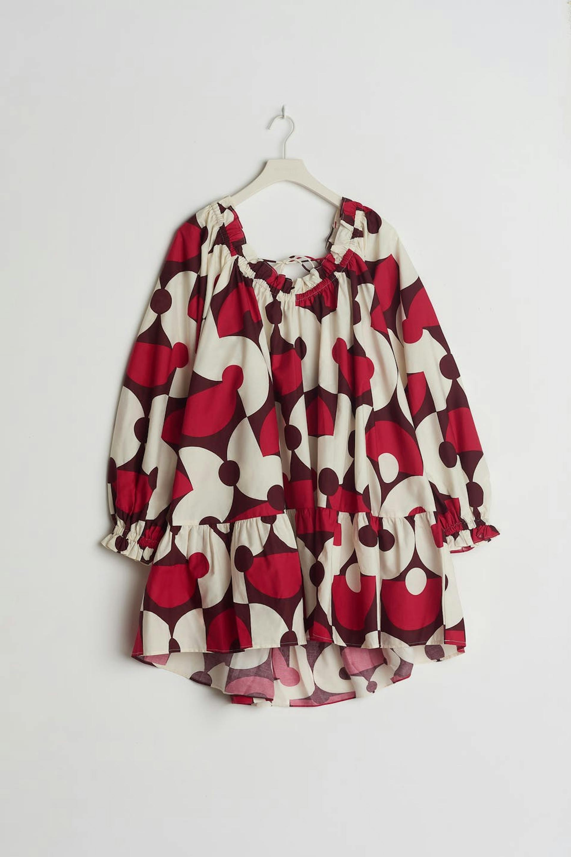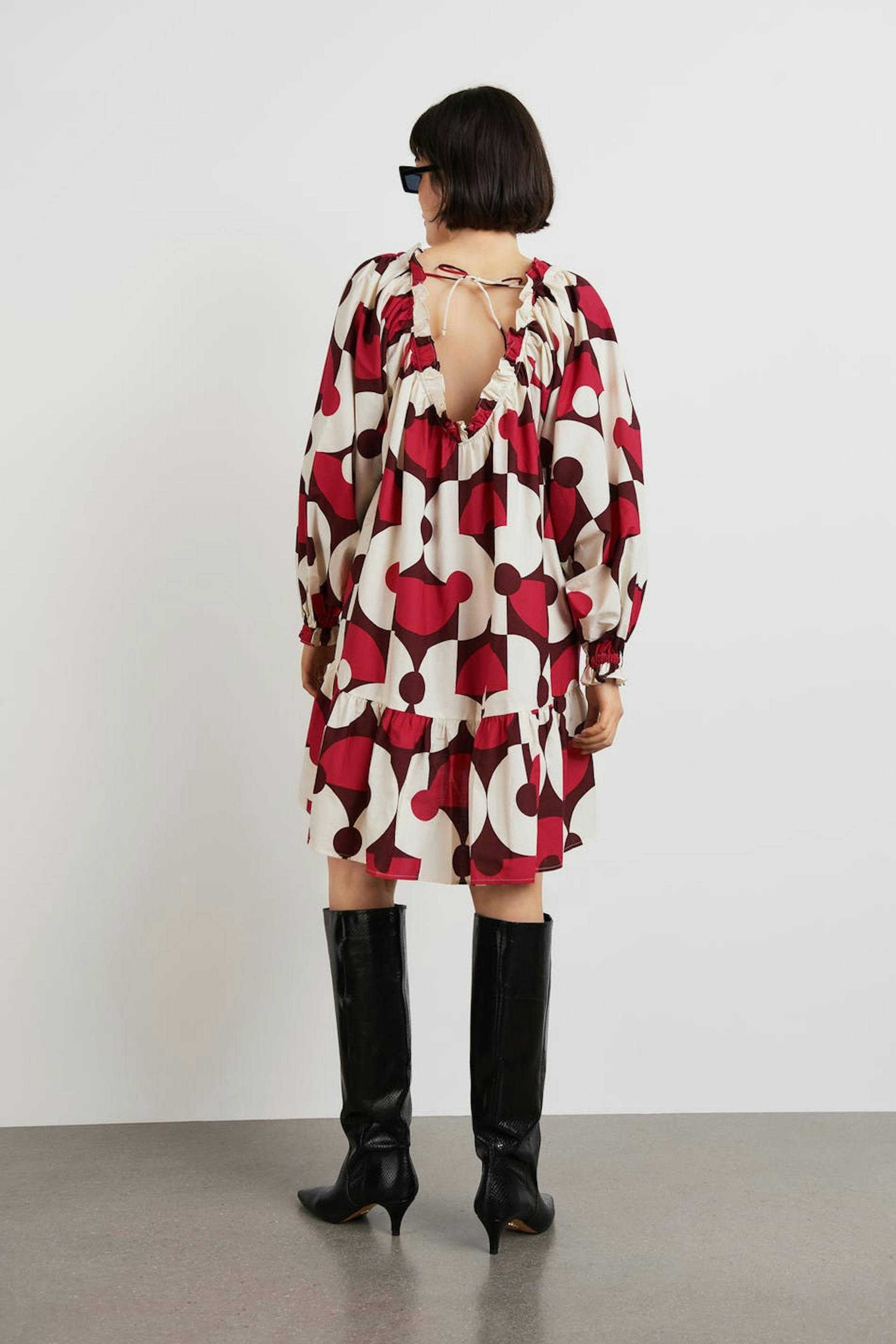 Mönstrad klänning med en v-ringning fram och bak. Klänningen är röd, vit och kort. Den har en vävd kvalitet, voluminösa ärmar, en knytning baktill och volangdetaljer vid halsringningen och på nederfållen.