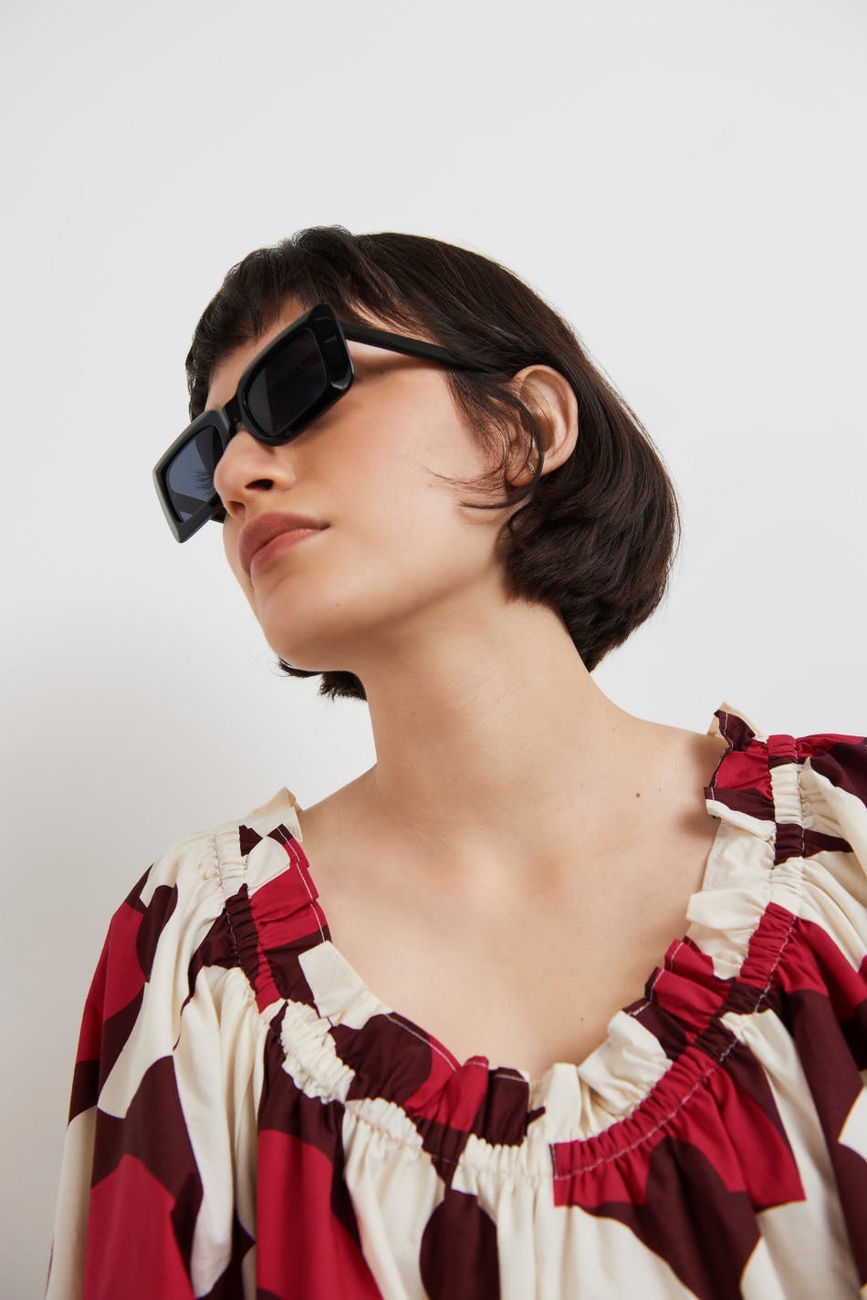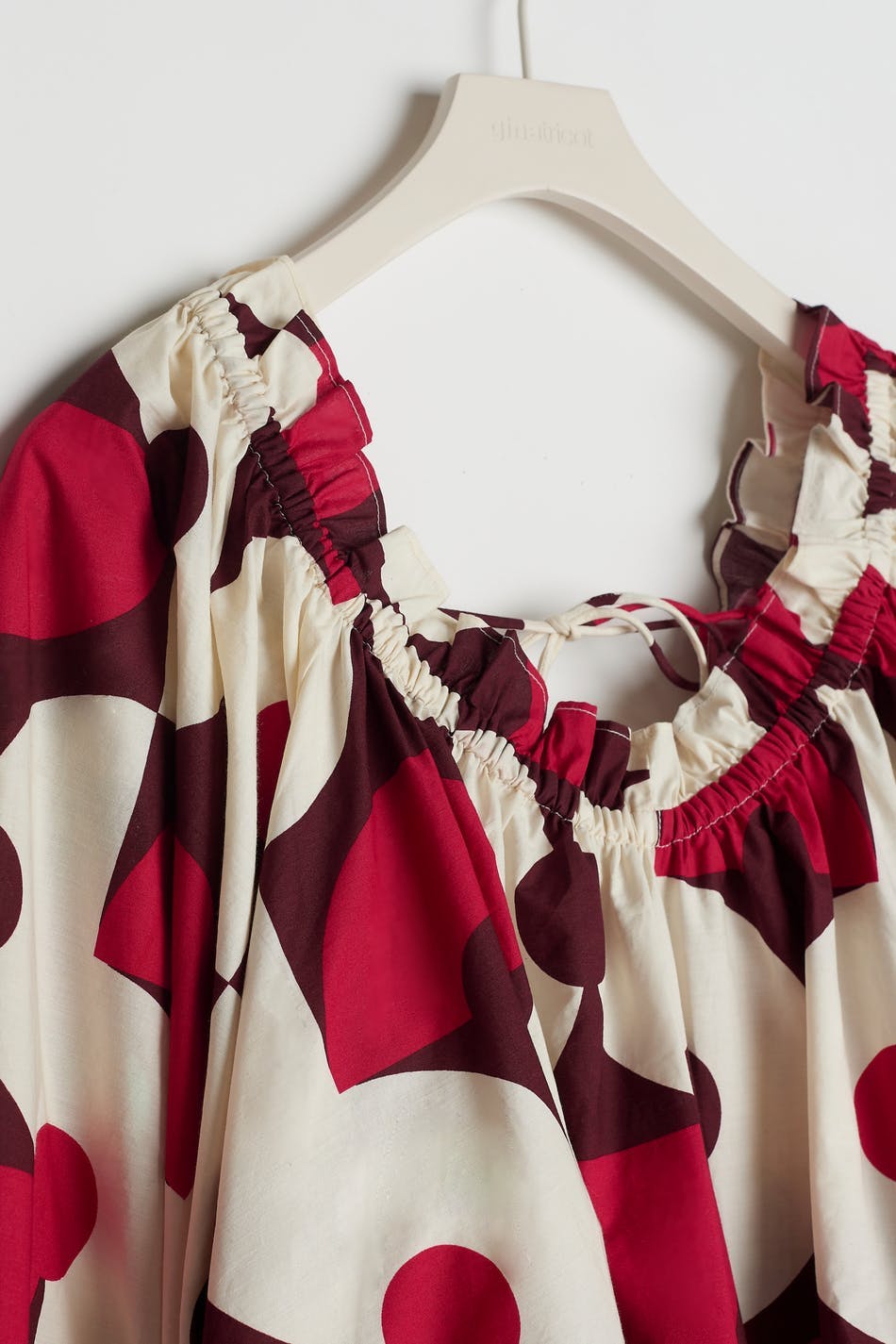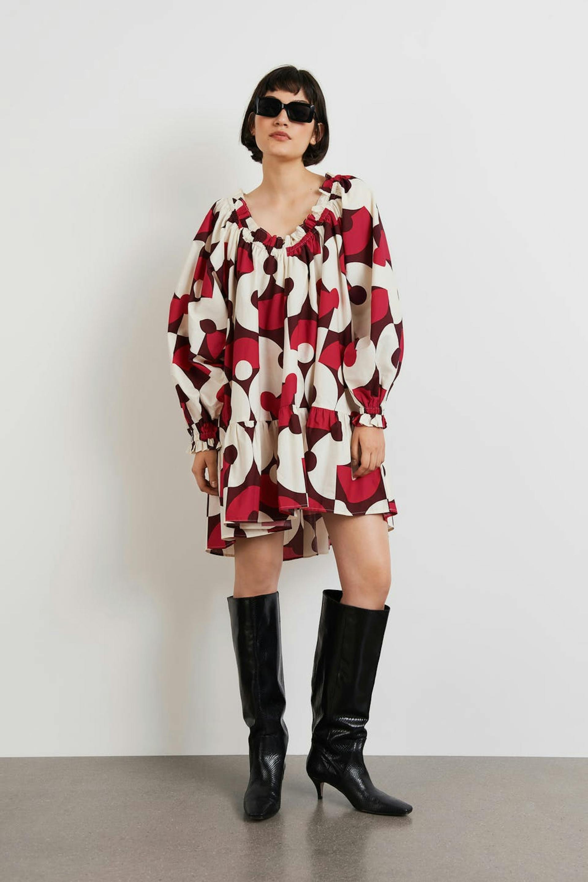 Mönstrad klänning med en v-ringning fram och bak. Klänningen är röd, vit och kort. Den har en vävd kvalitet, voluminösa ärmar, en knytning baktill och volangdetaljer vid halsringningen och på nederfållen.