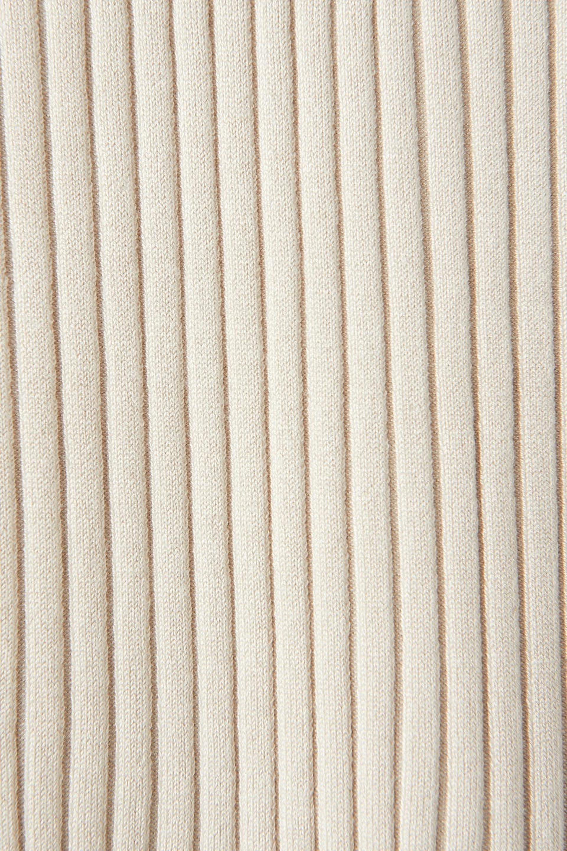 Finstickad midiklänning med ribbad effekt. Klänningen är beige och har en figurnära passform. Den har v-ringning, tunna axelband och slits i sidan.