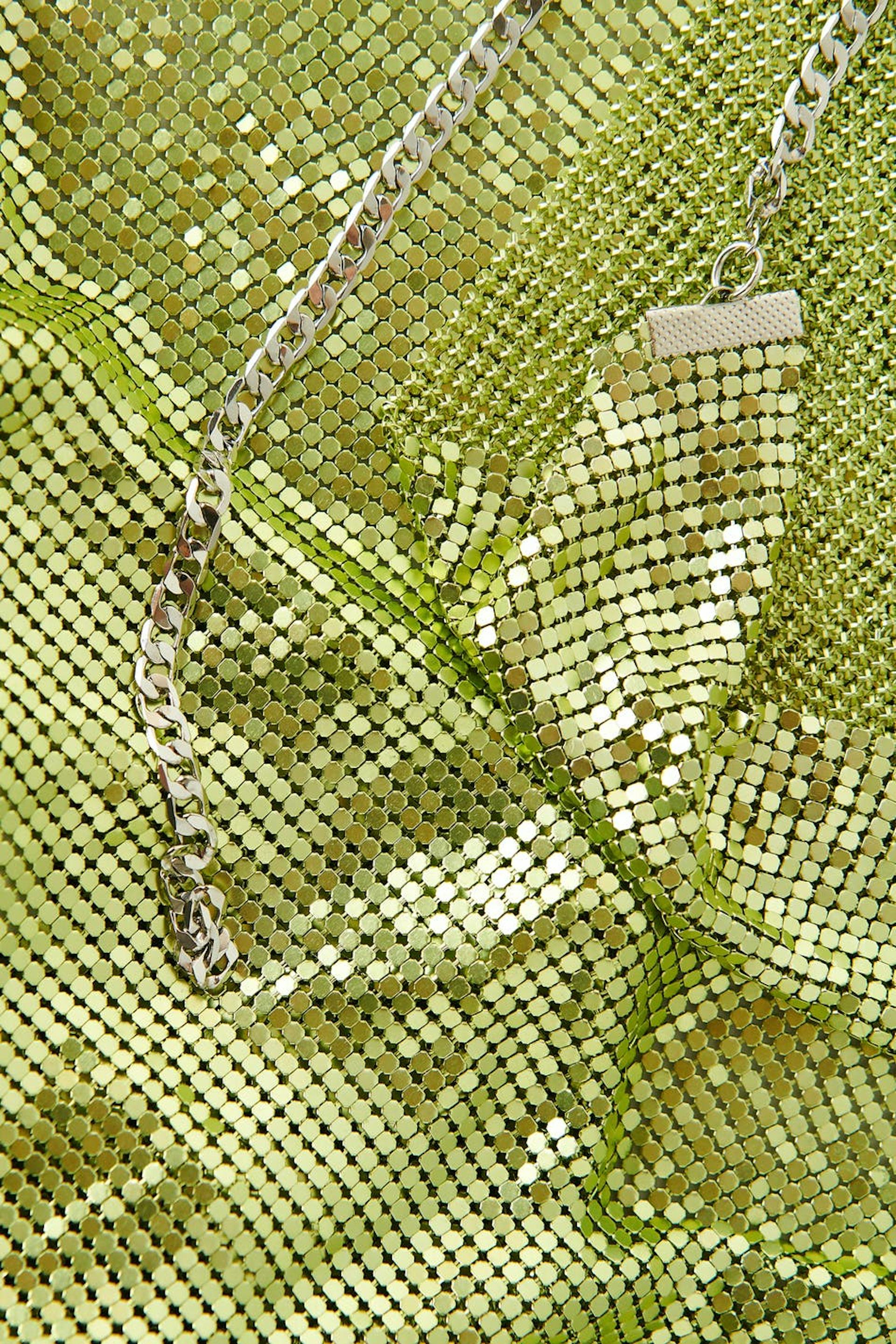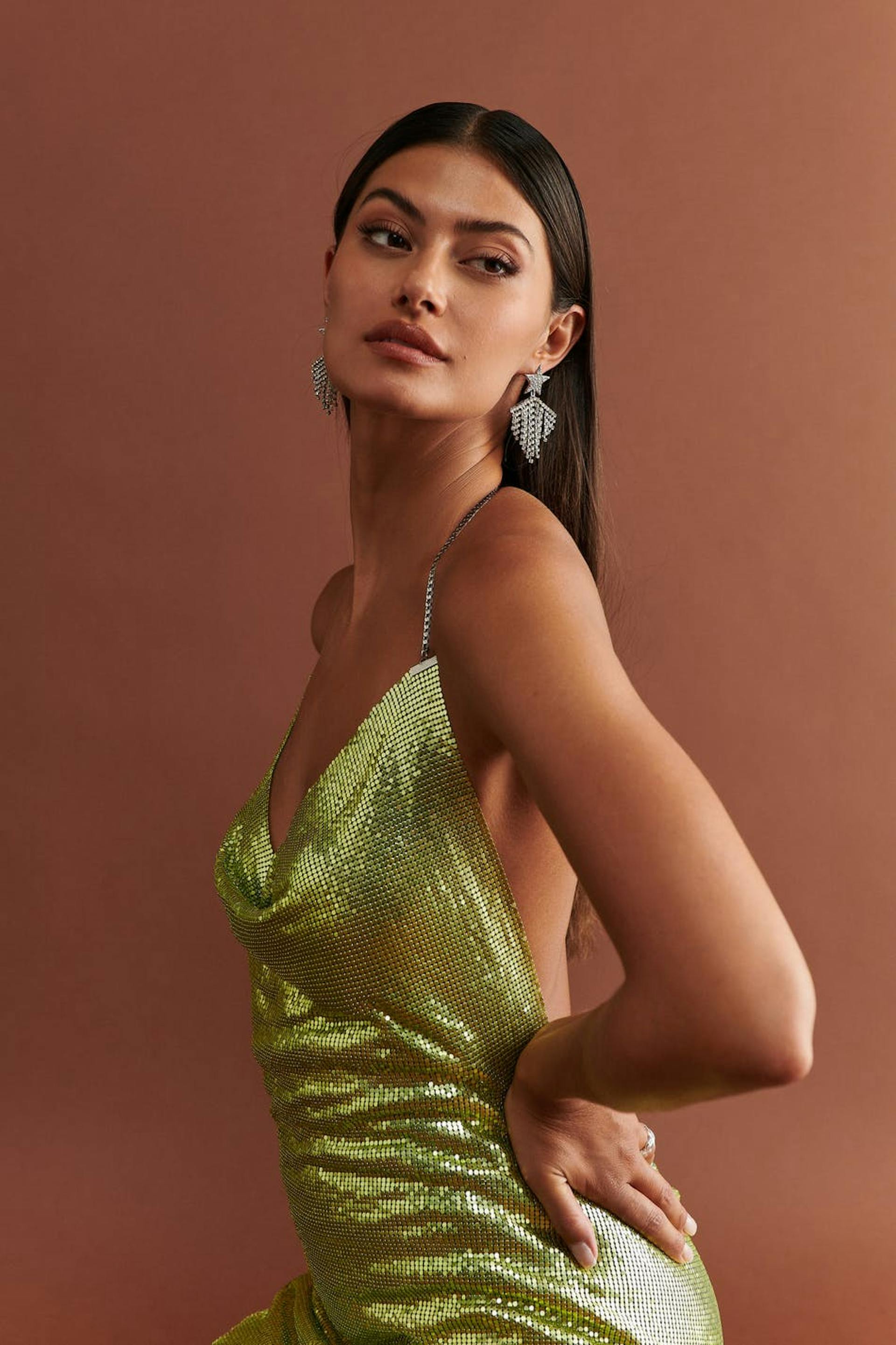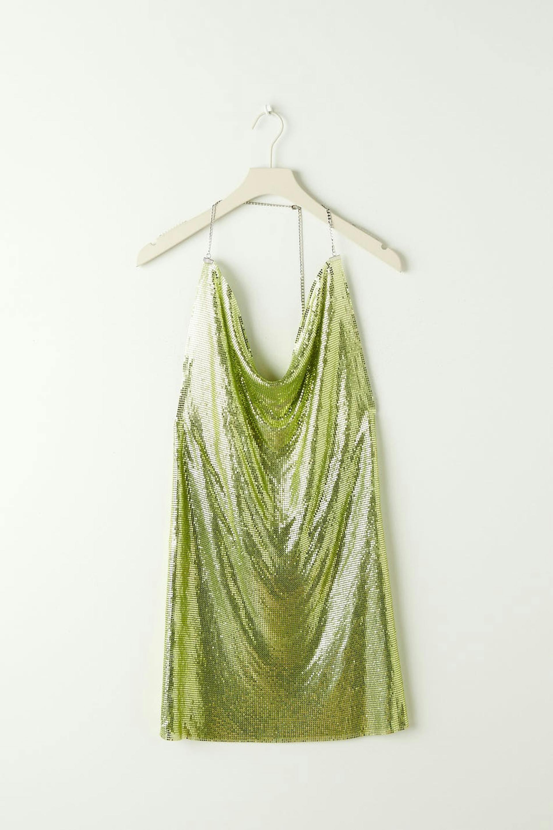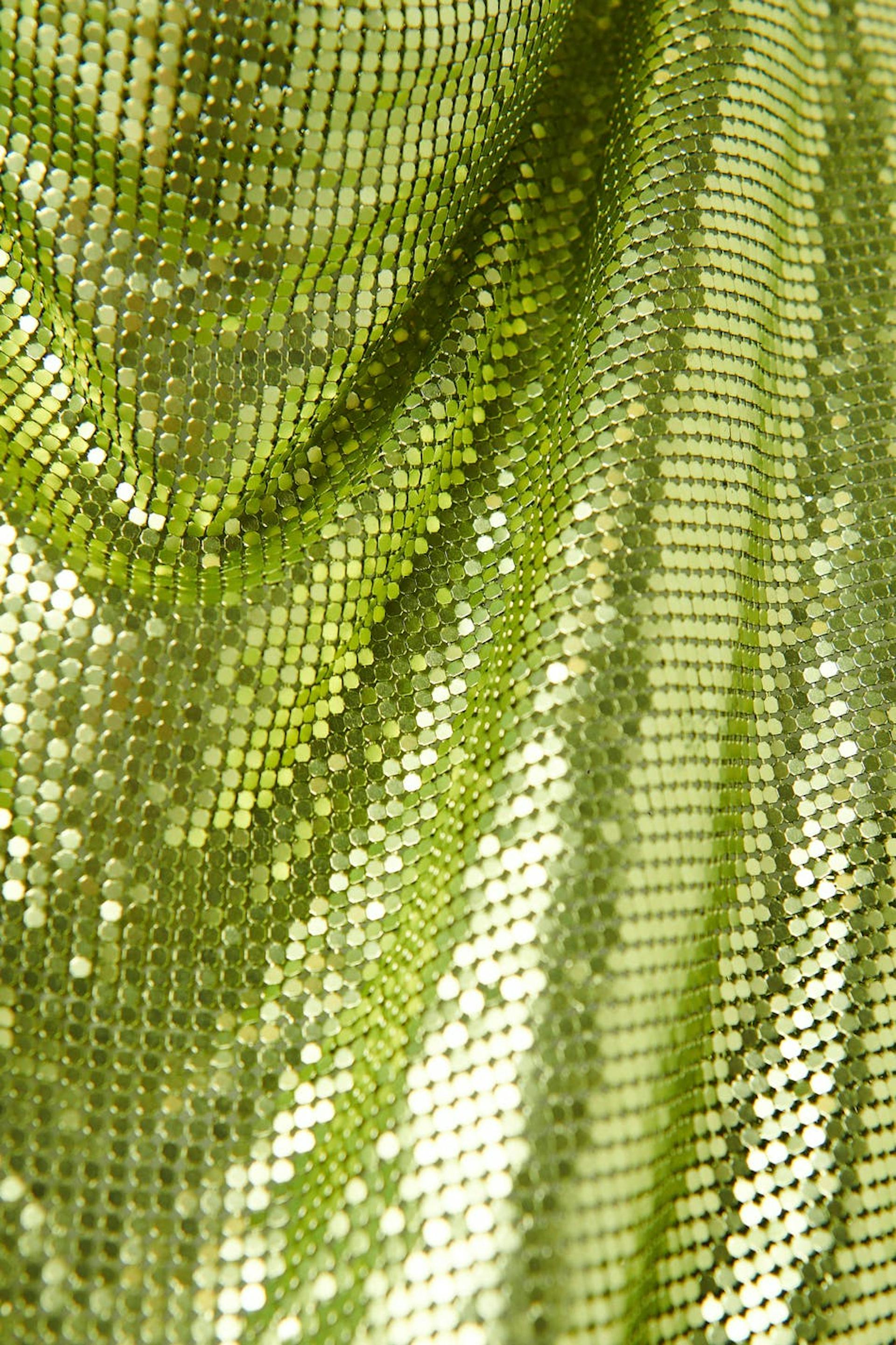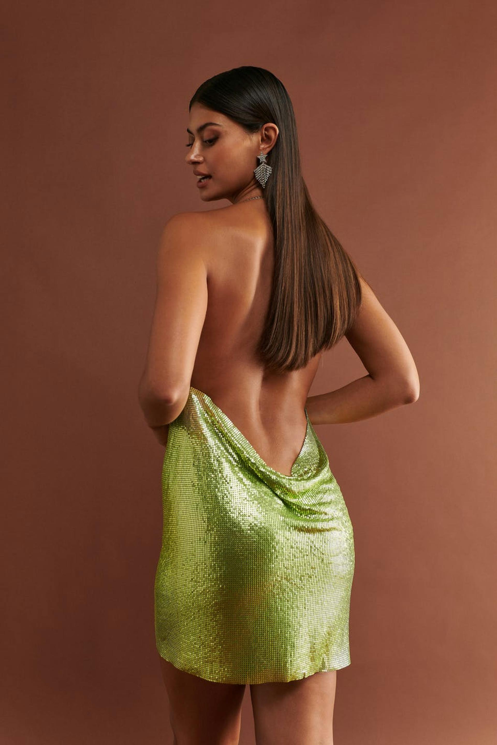 Kort festklänning i metall med öppen rygg. Klänningen är grön och utan stretch och har draperad halsringning.