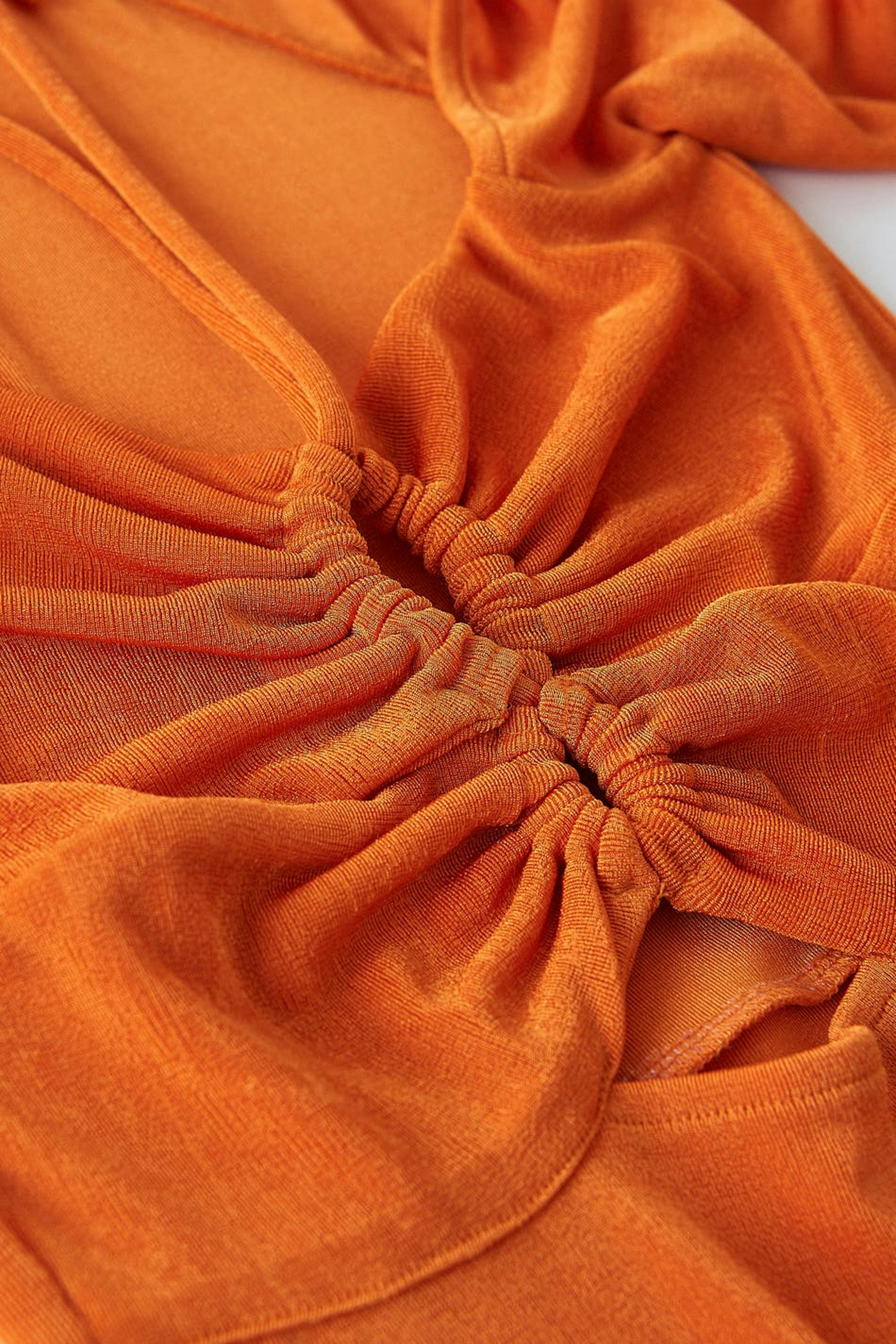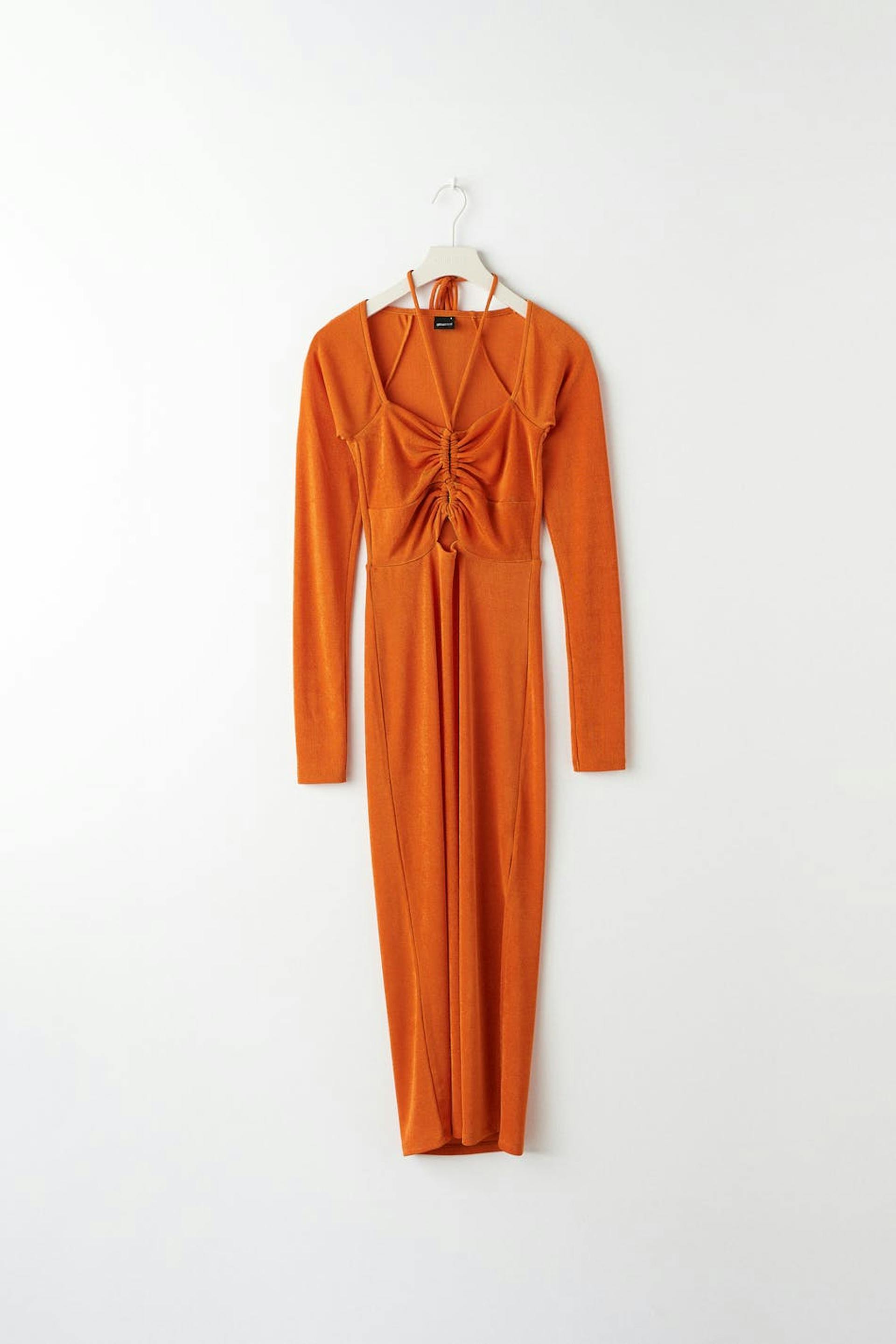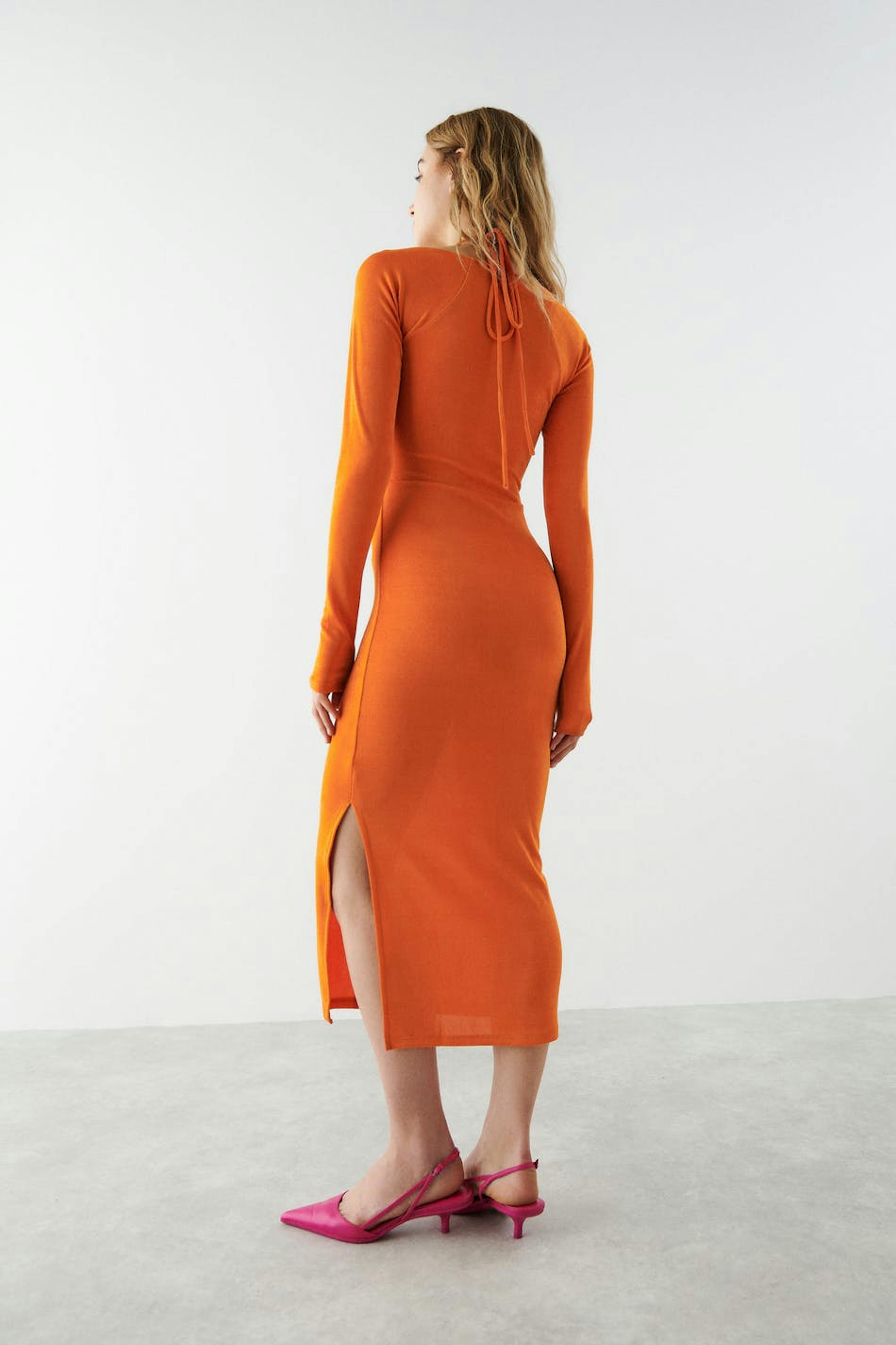Långärmad midiklänning med figurnära passform. Klänningen är perfekt för festen och orange och har en slits nedtill. Den har en cut out-detalj framtill och fyrkantig halsringning med halterneckband.