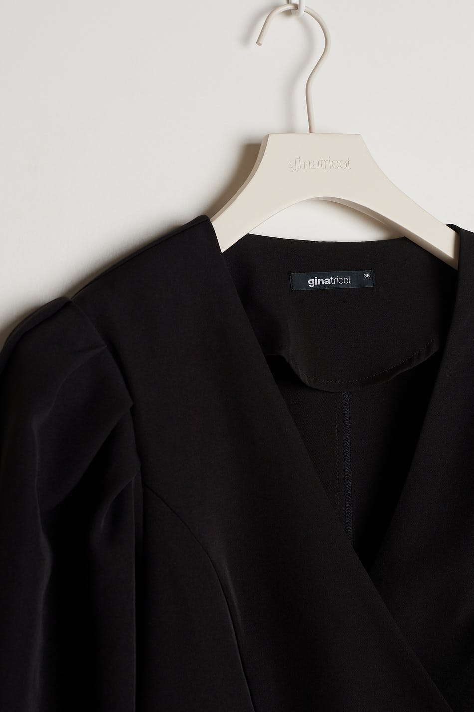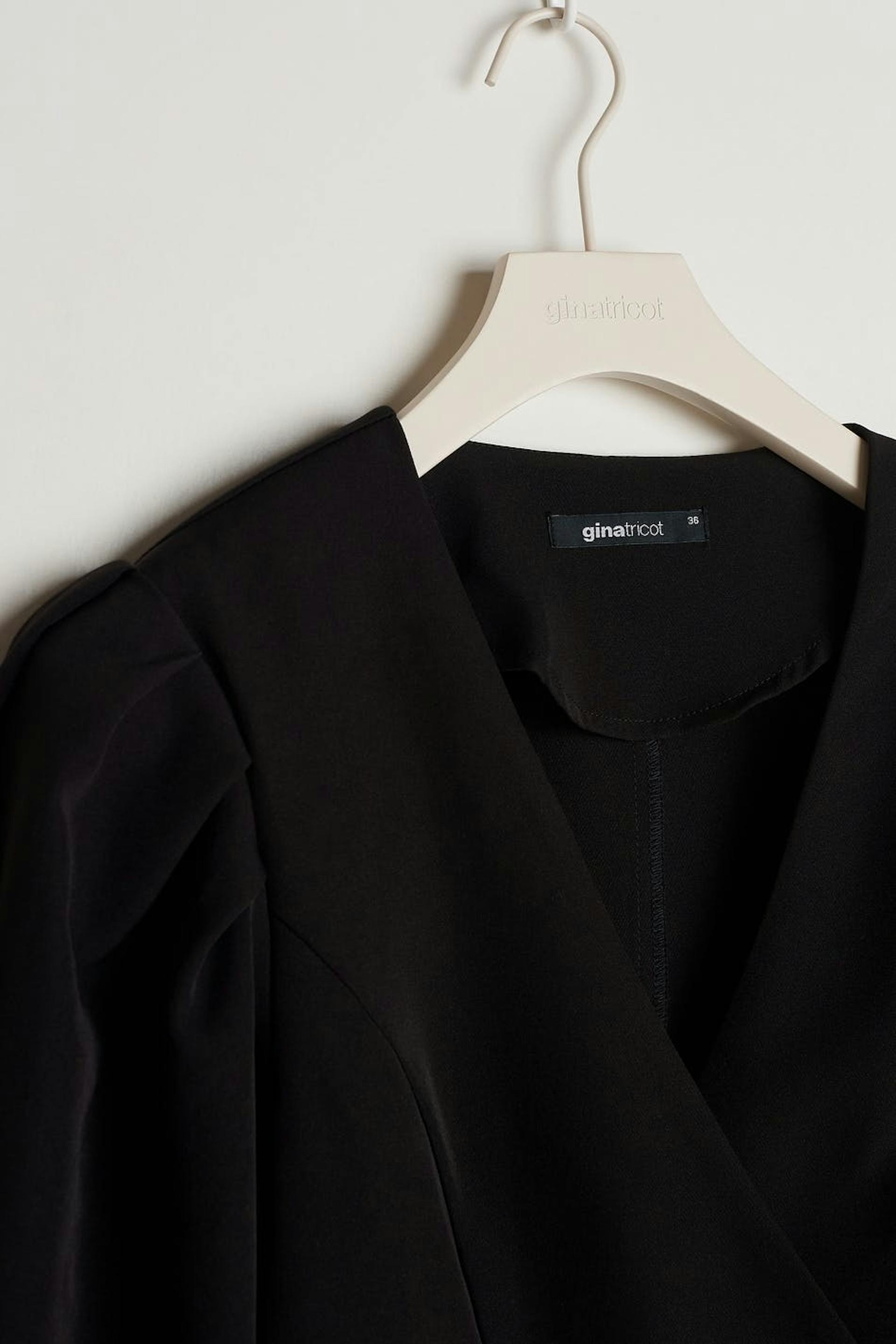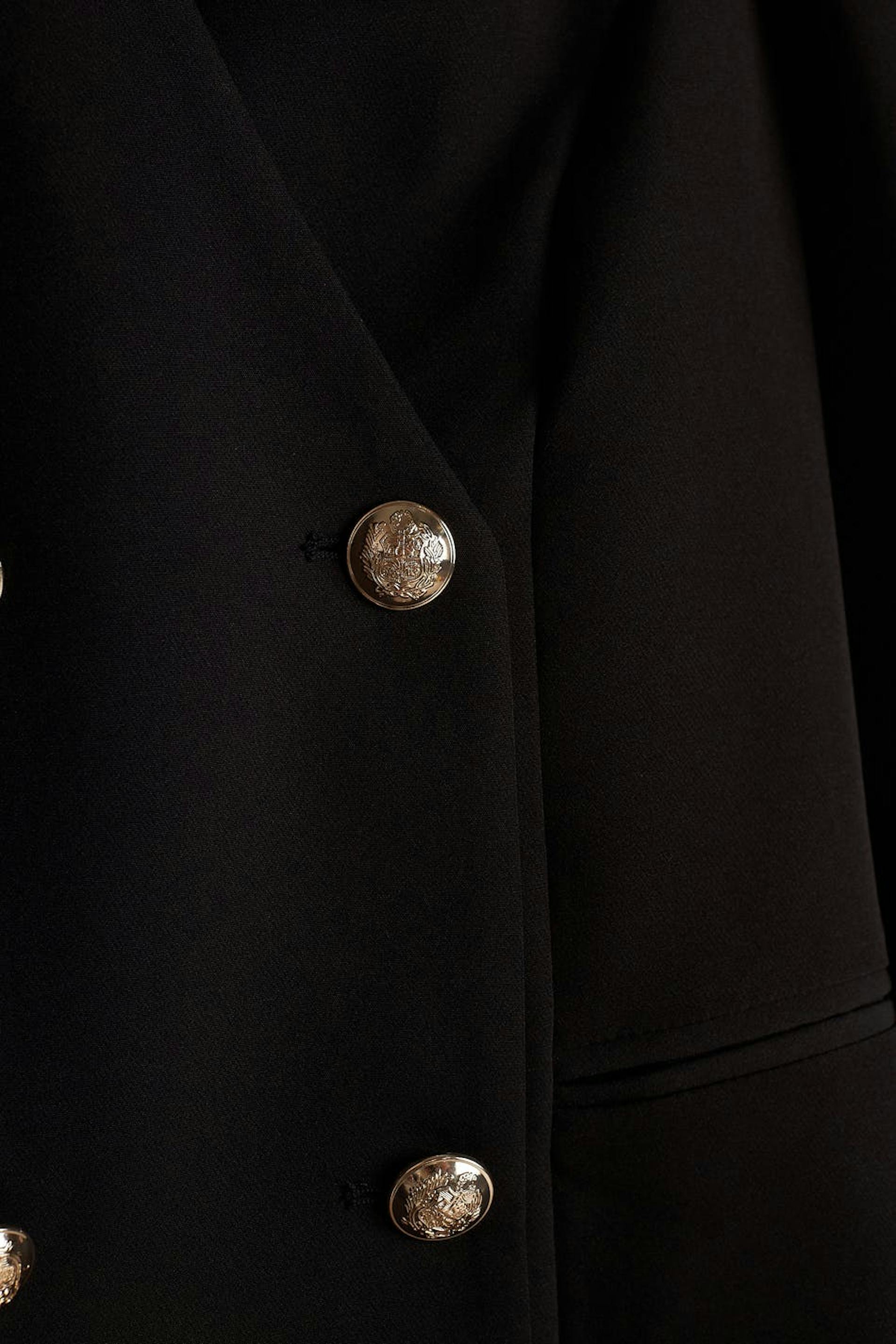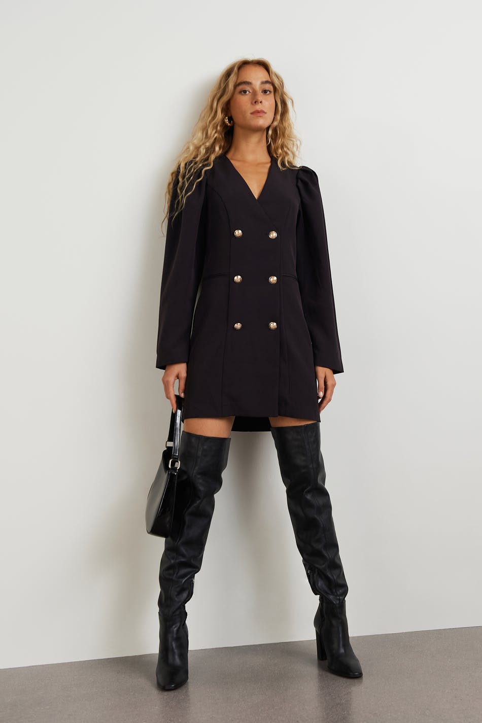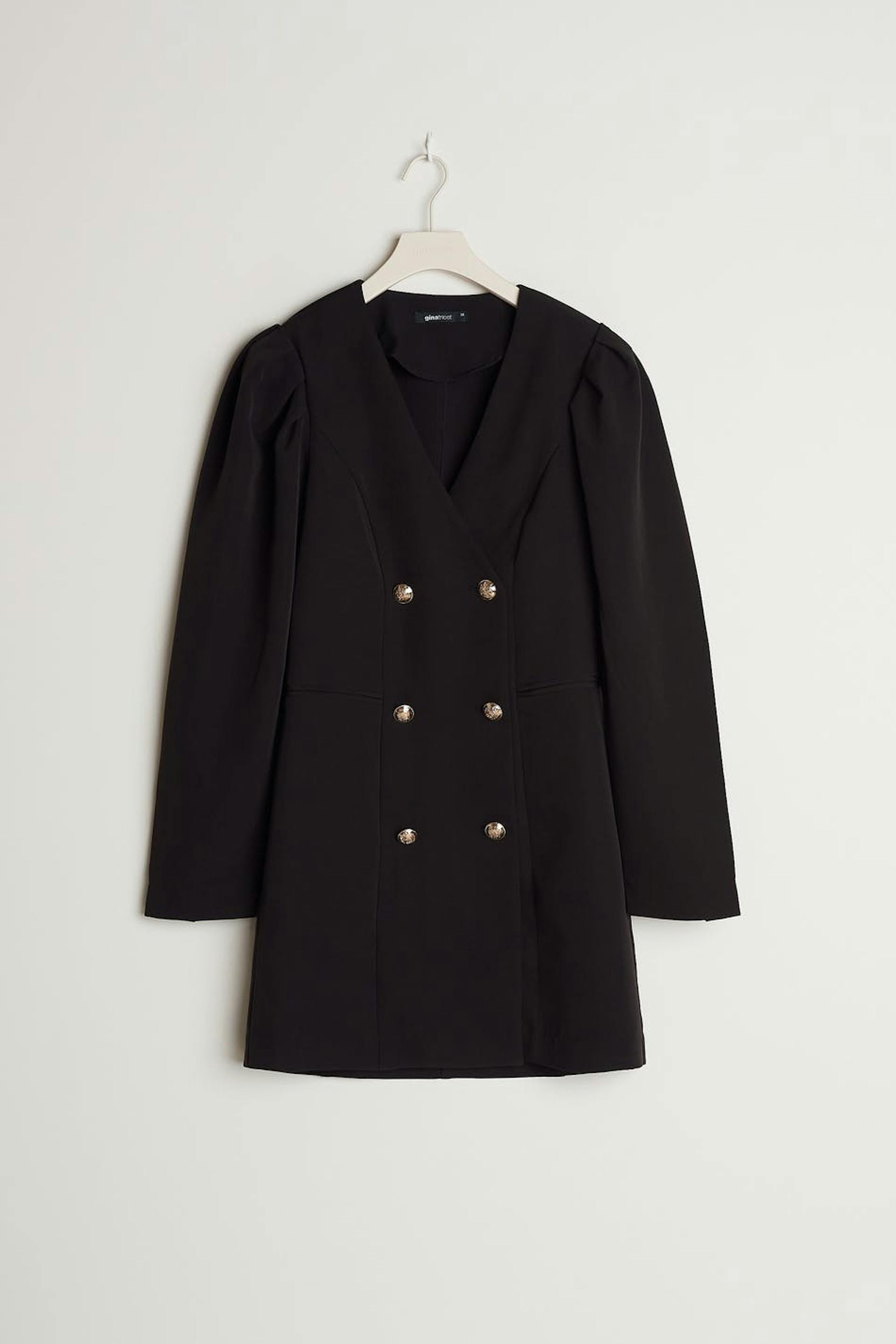 Dubbelknäppt kavajklänning med puffärmar. Klänningen är perfekt för festen, svart och kort. Den har en v-ringning och guldfärgade knappar framtill och vid ärmsluten.