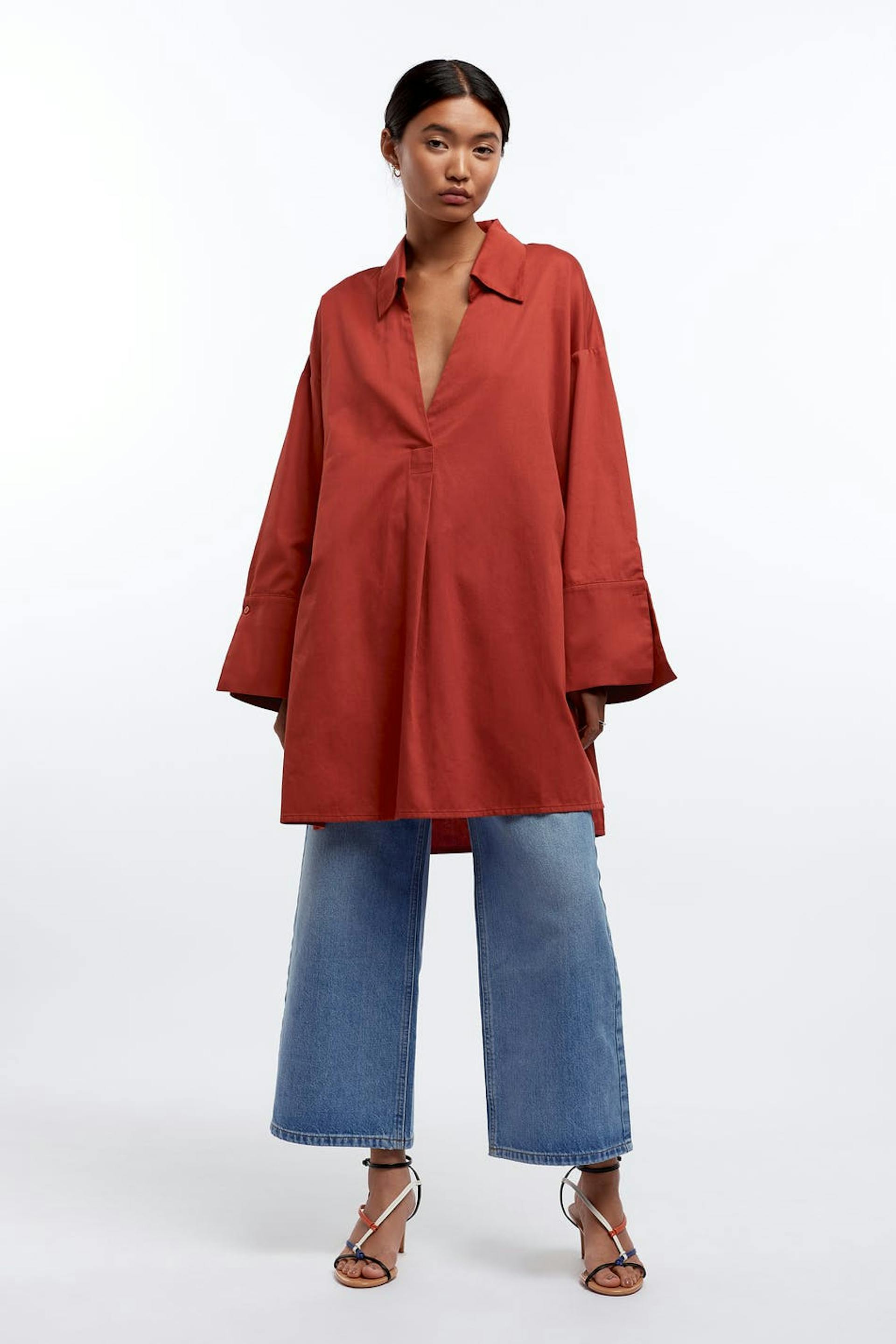 Klänning med oversize fit. Klänningen är orange och har långa, rymliga ärmar. Den har en v-ringning och långa sprund på sidorna.