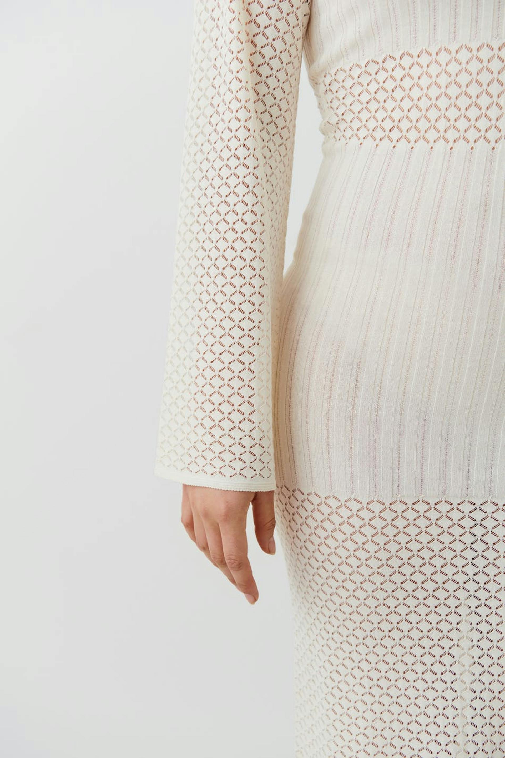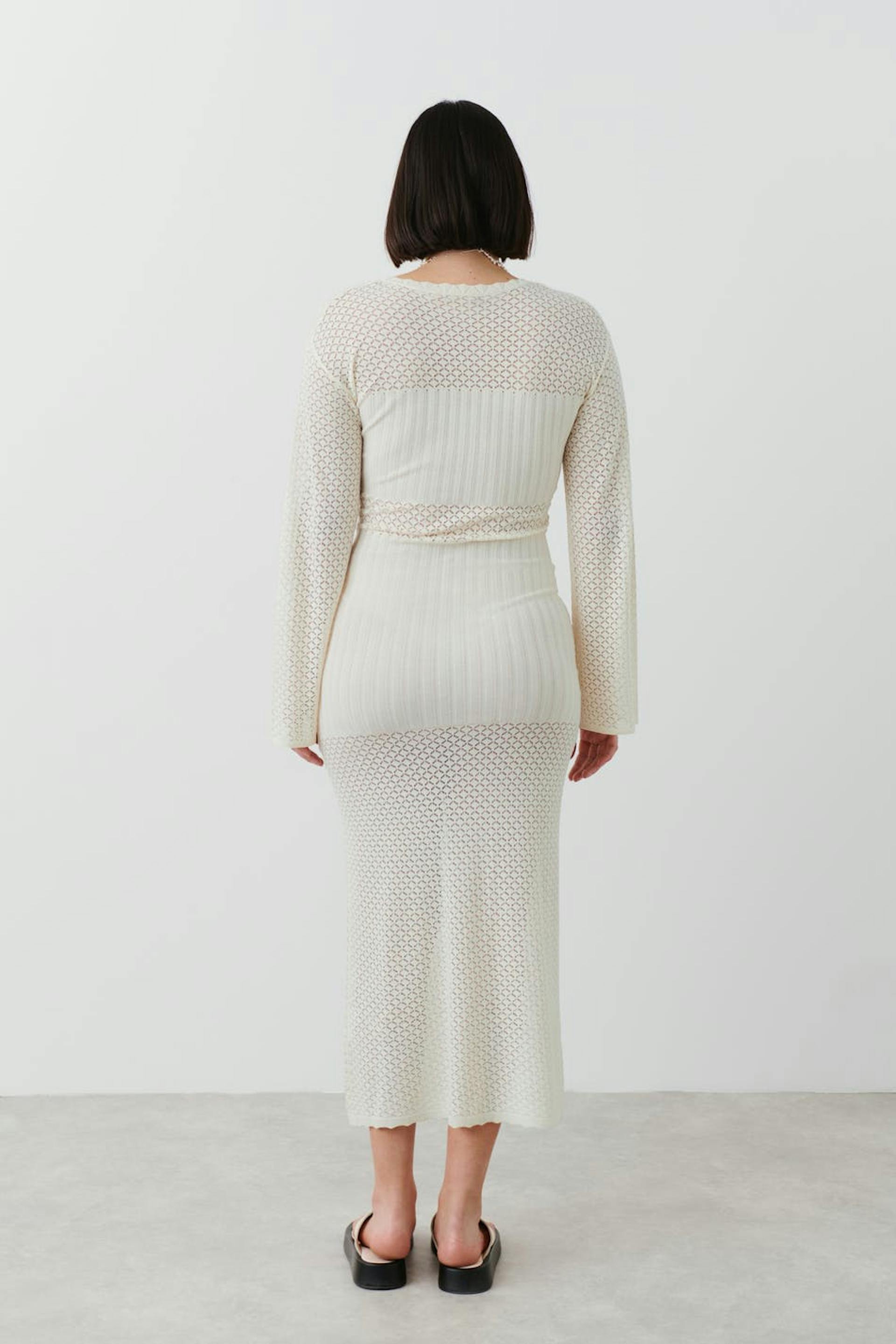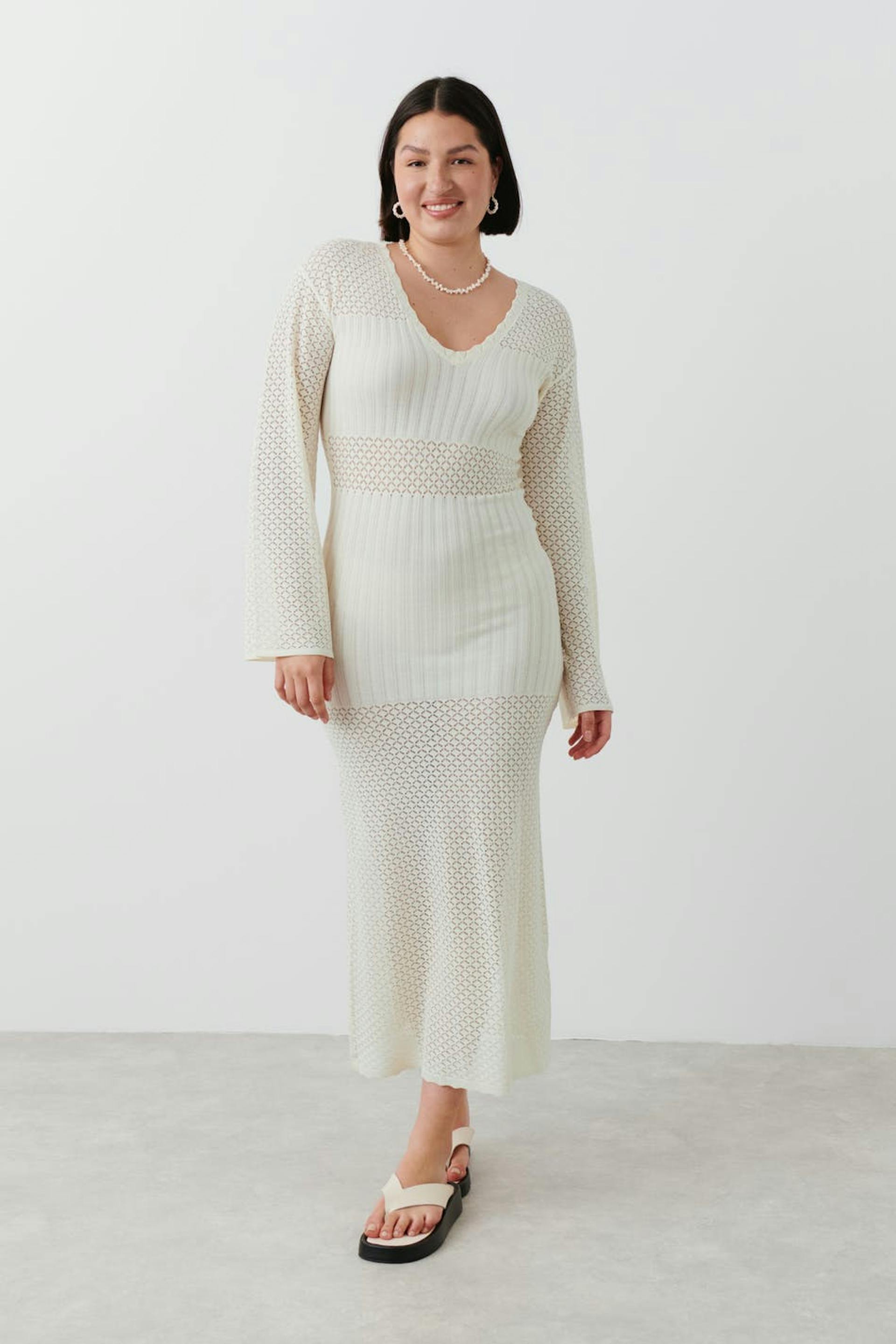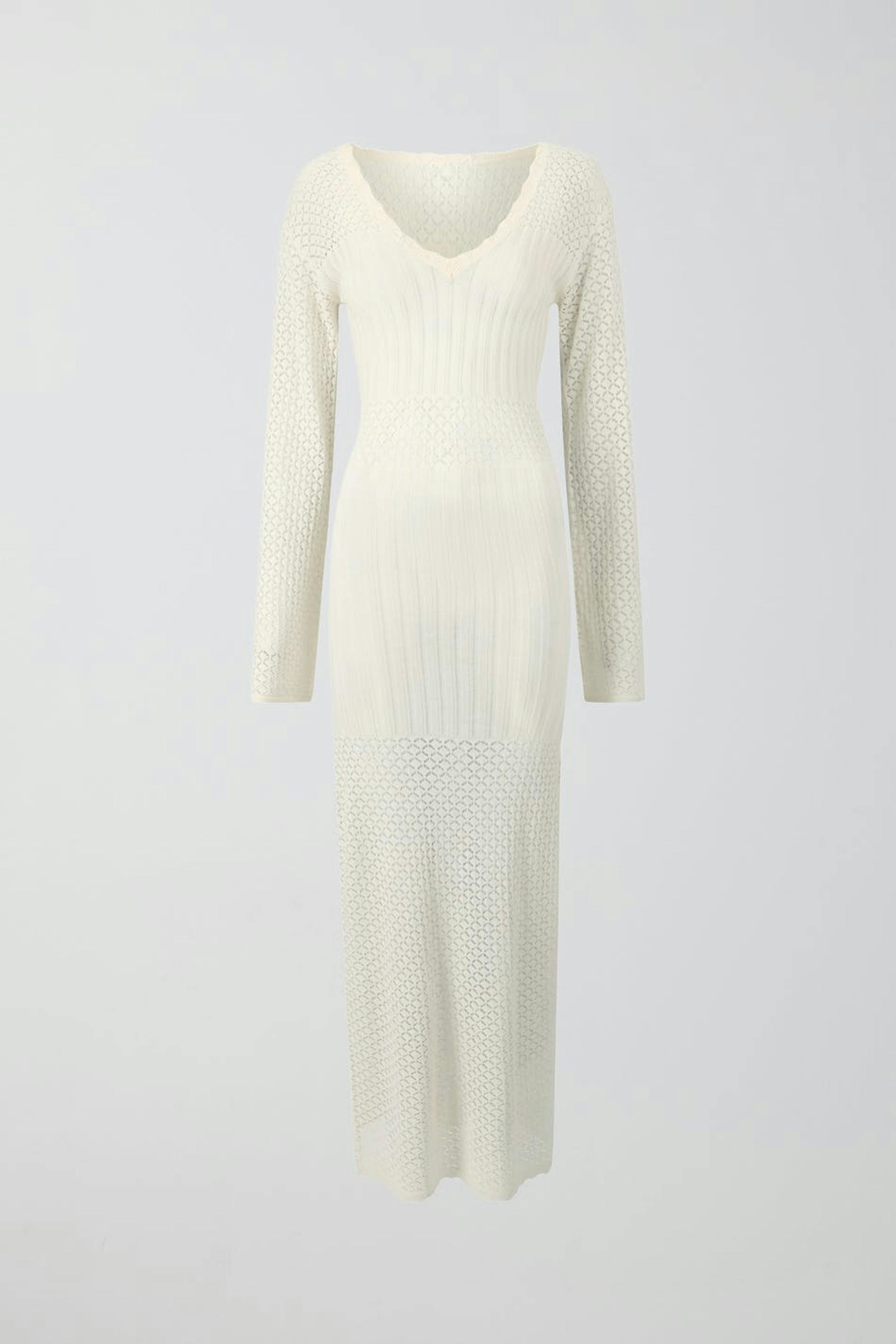 Stickad maxiklänning med v-ringning. Klänningen är vit och har lång, utsvängd ärm.