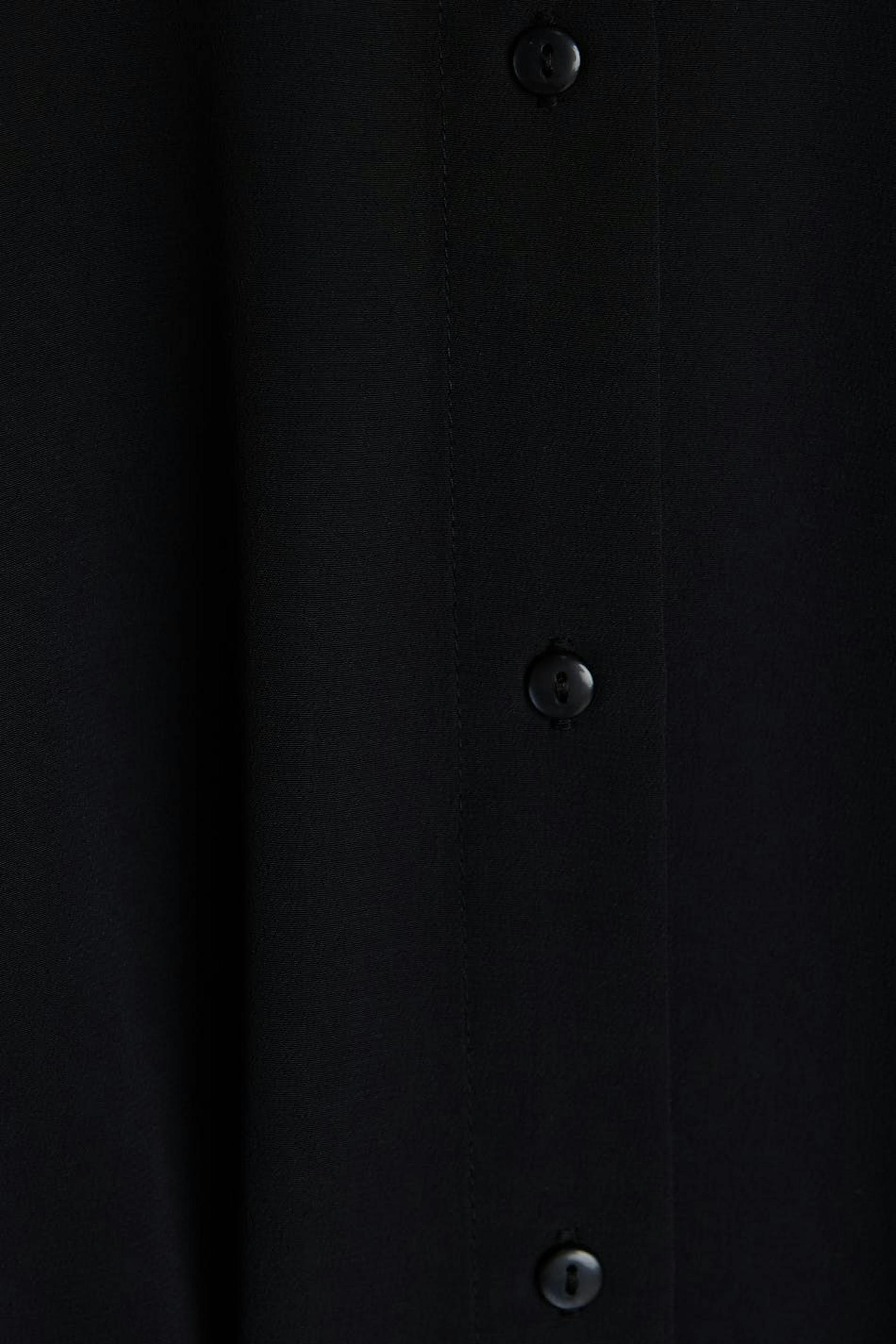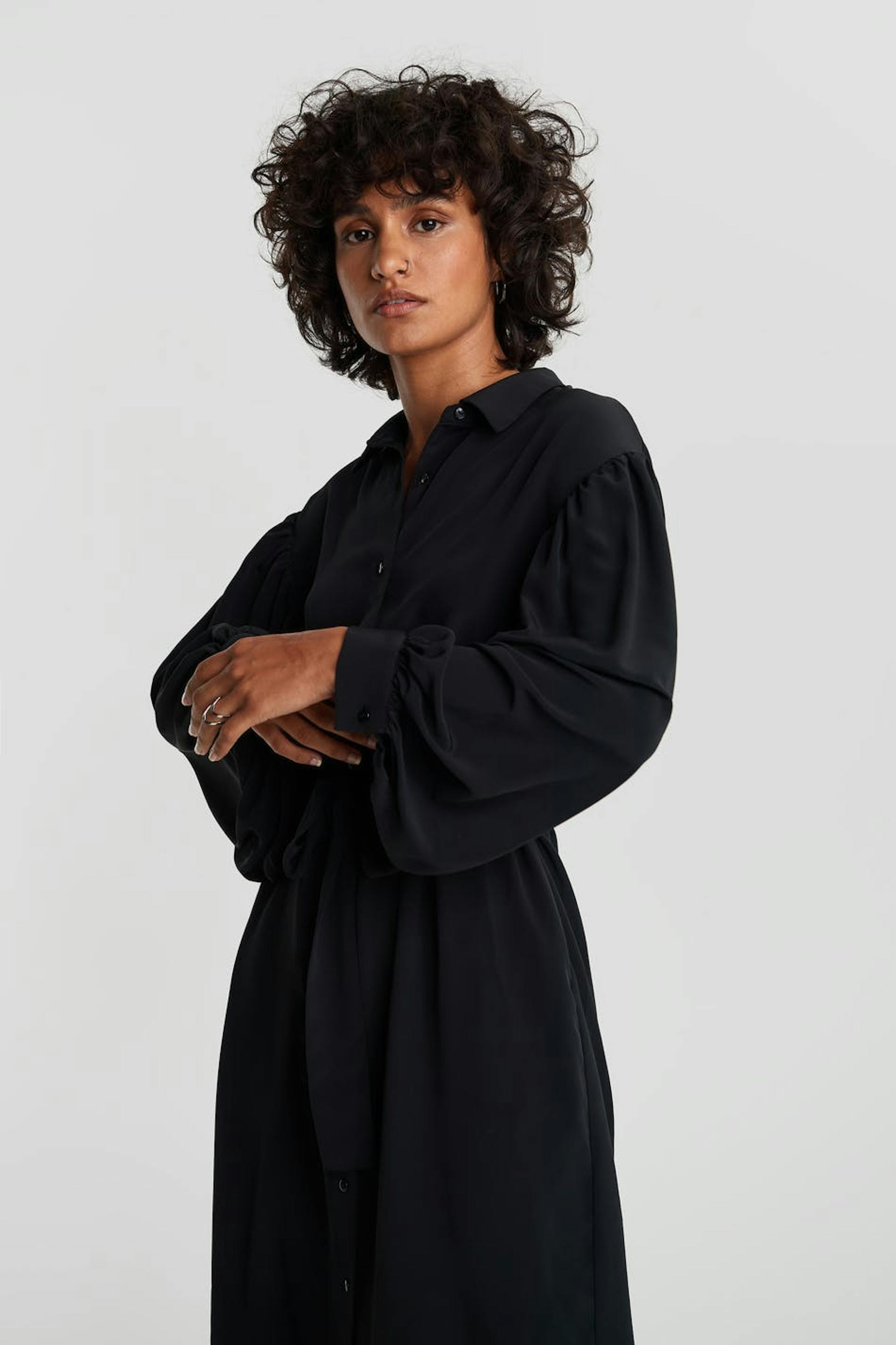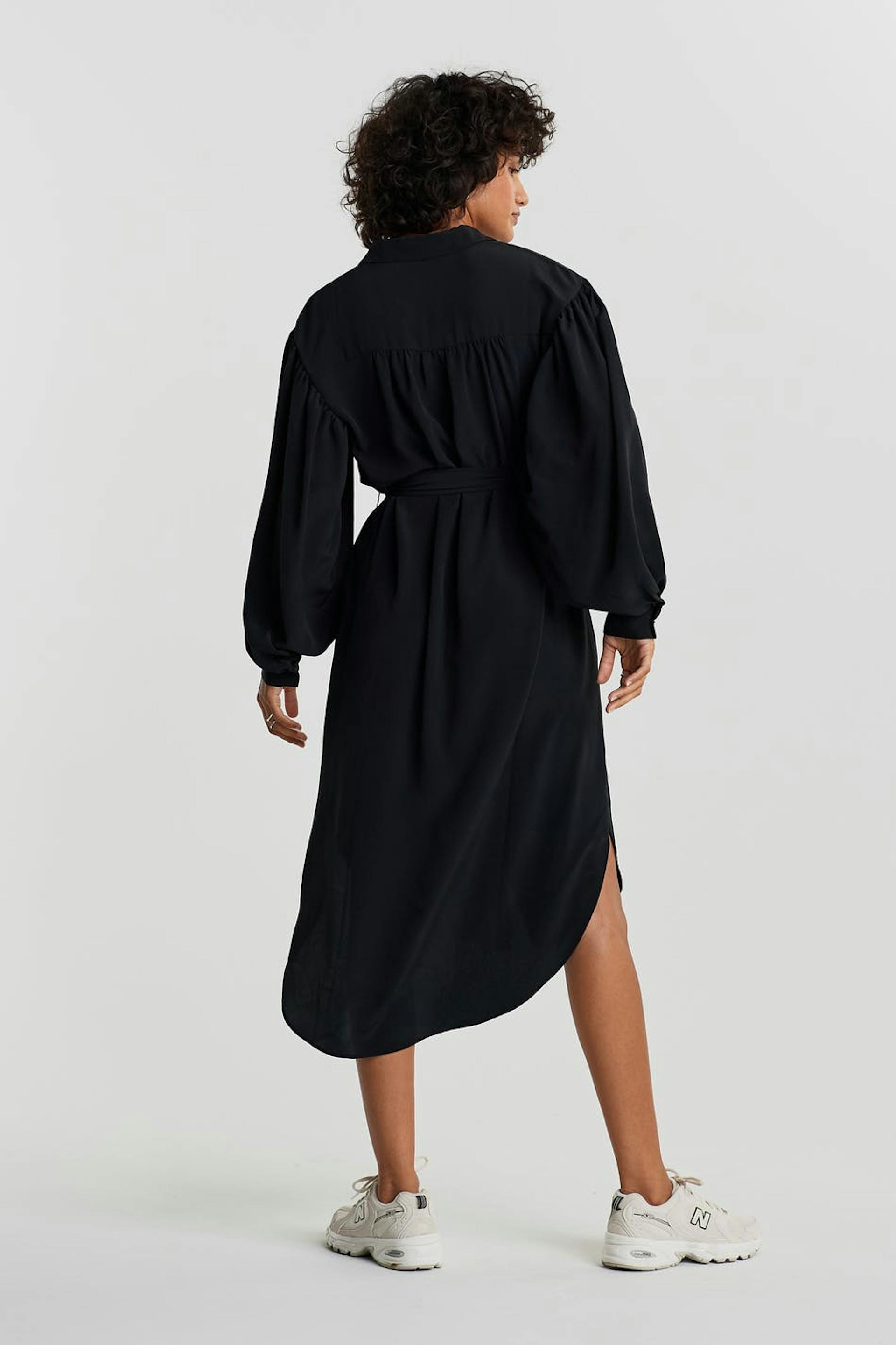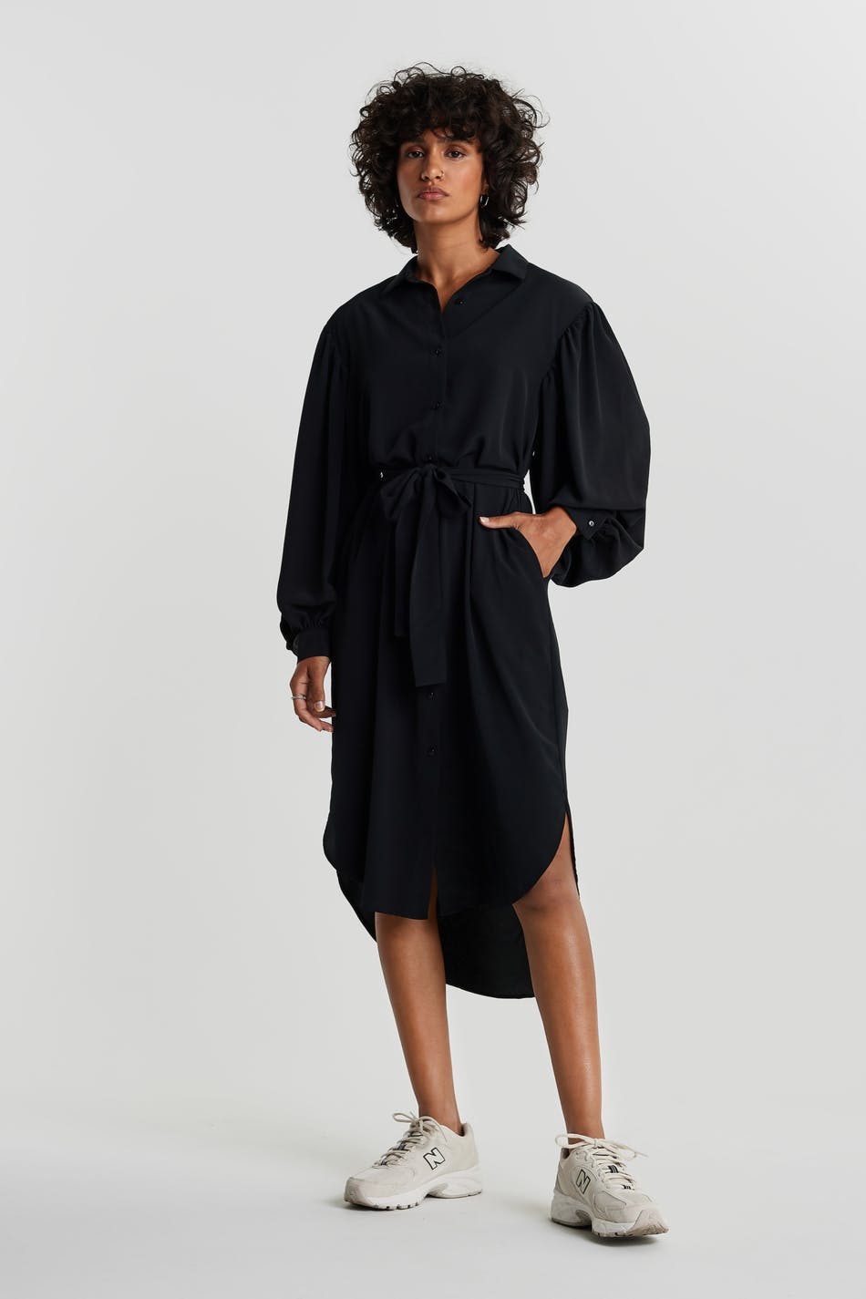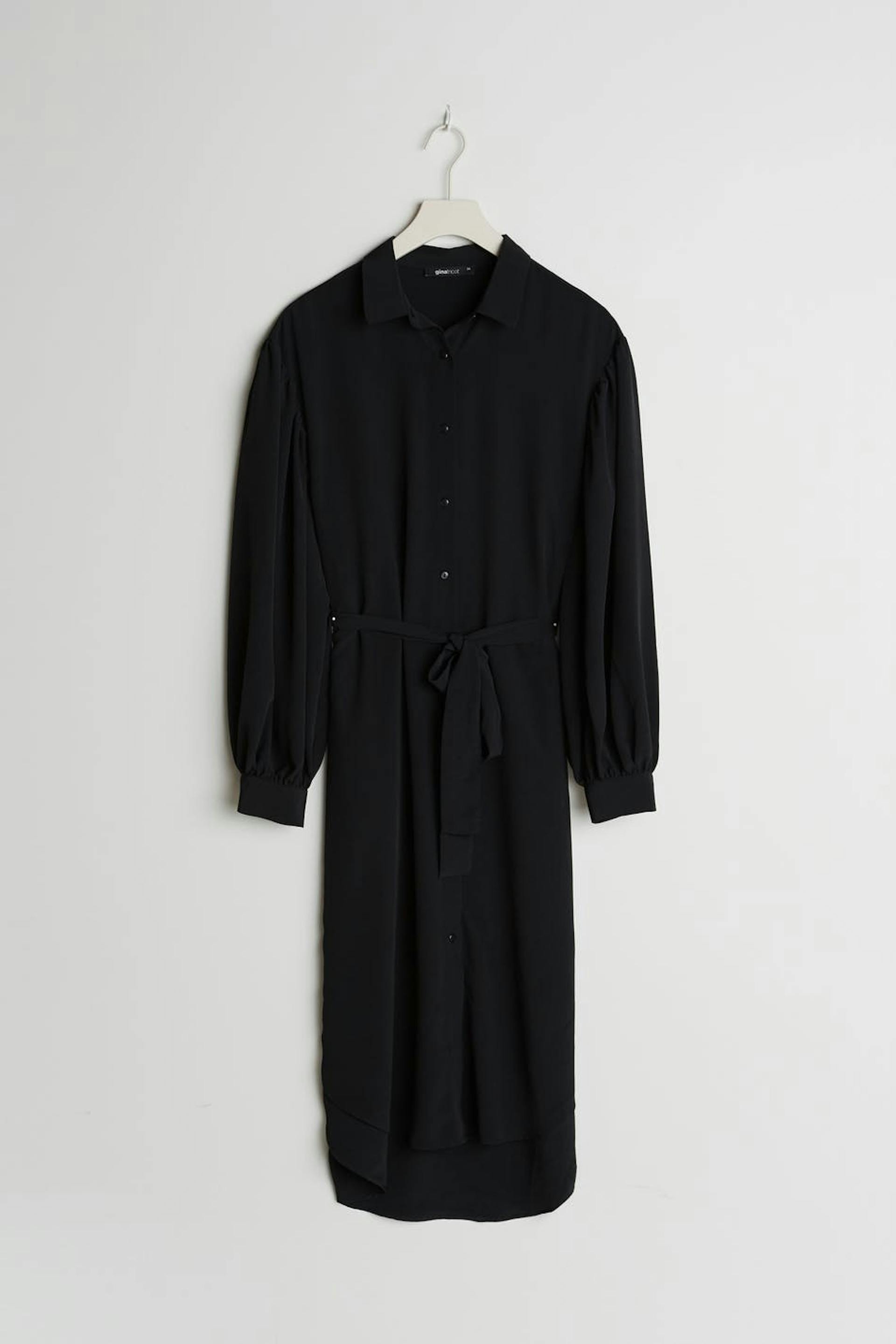 Långärmad skjortklänning med ett knytband i midjan. Klänningen är svart och vadlång.