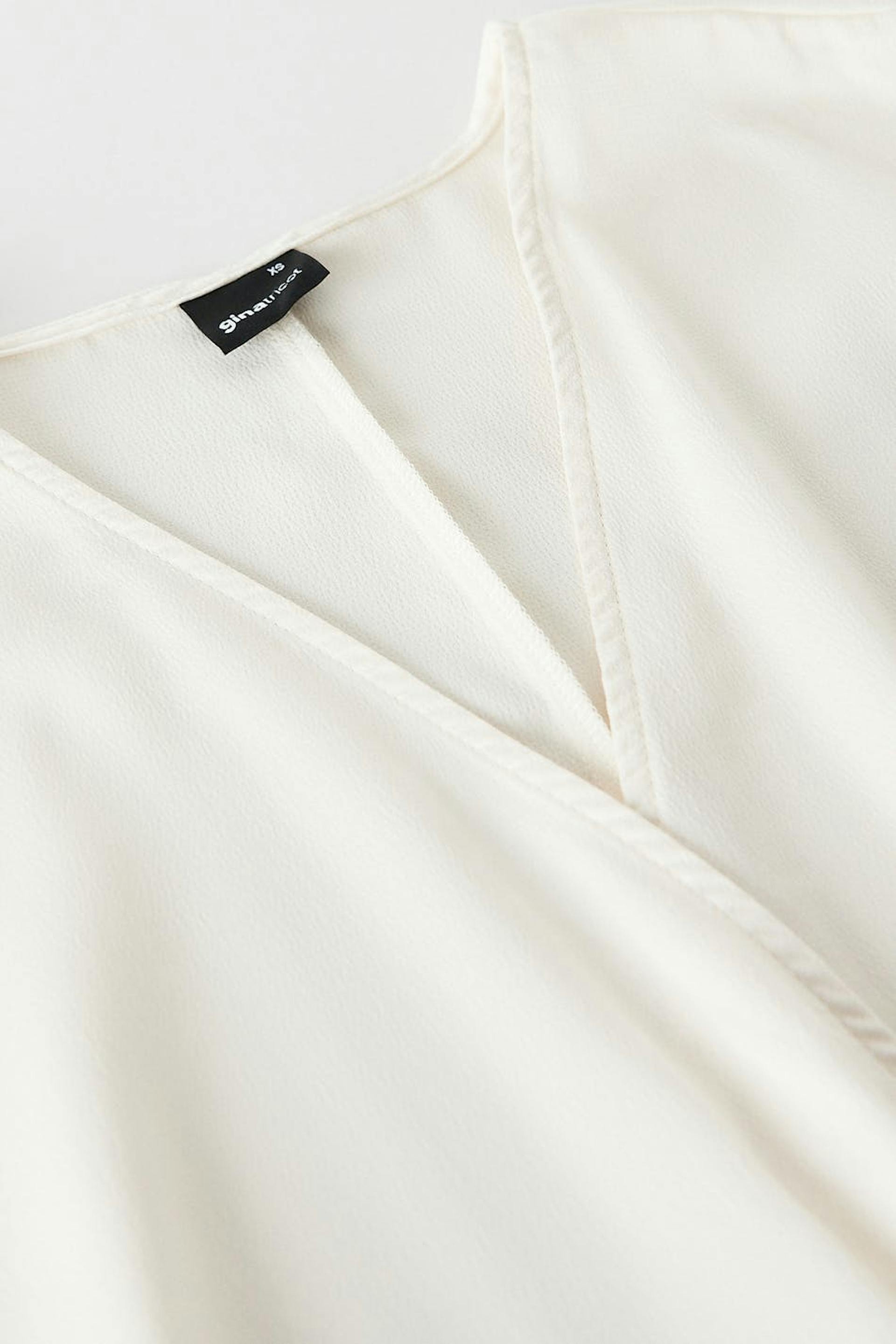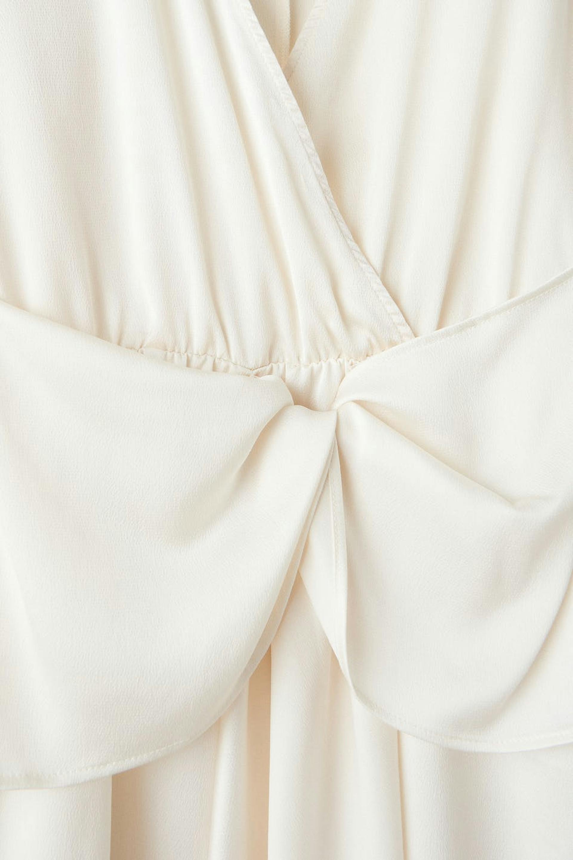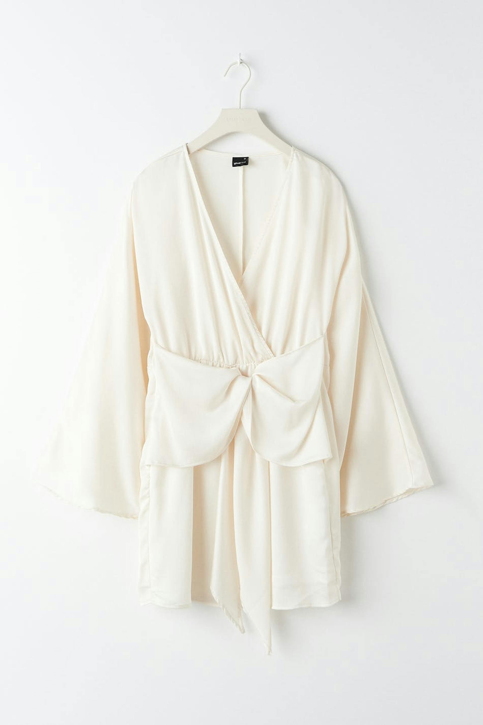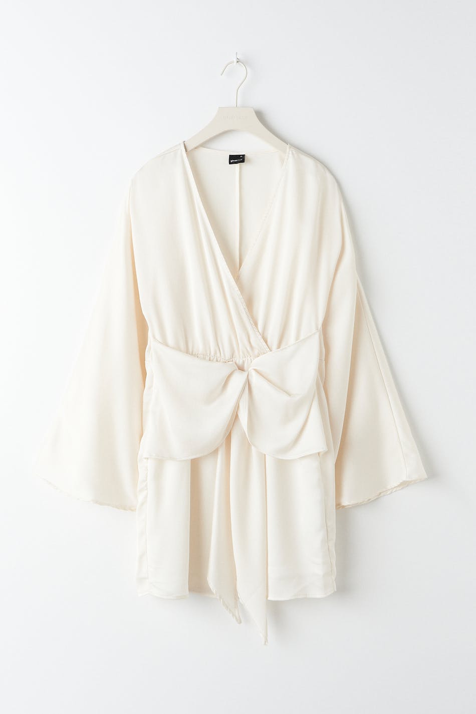 Långärmad omlottklänning i satin med knytband i midjan. Klänningen är perfekt för festen och beige och har en lös passform. Den har resår i midjan, utsvängda ärmar, v-ringning och ett material i återvunnen polyester.