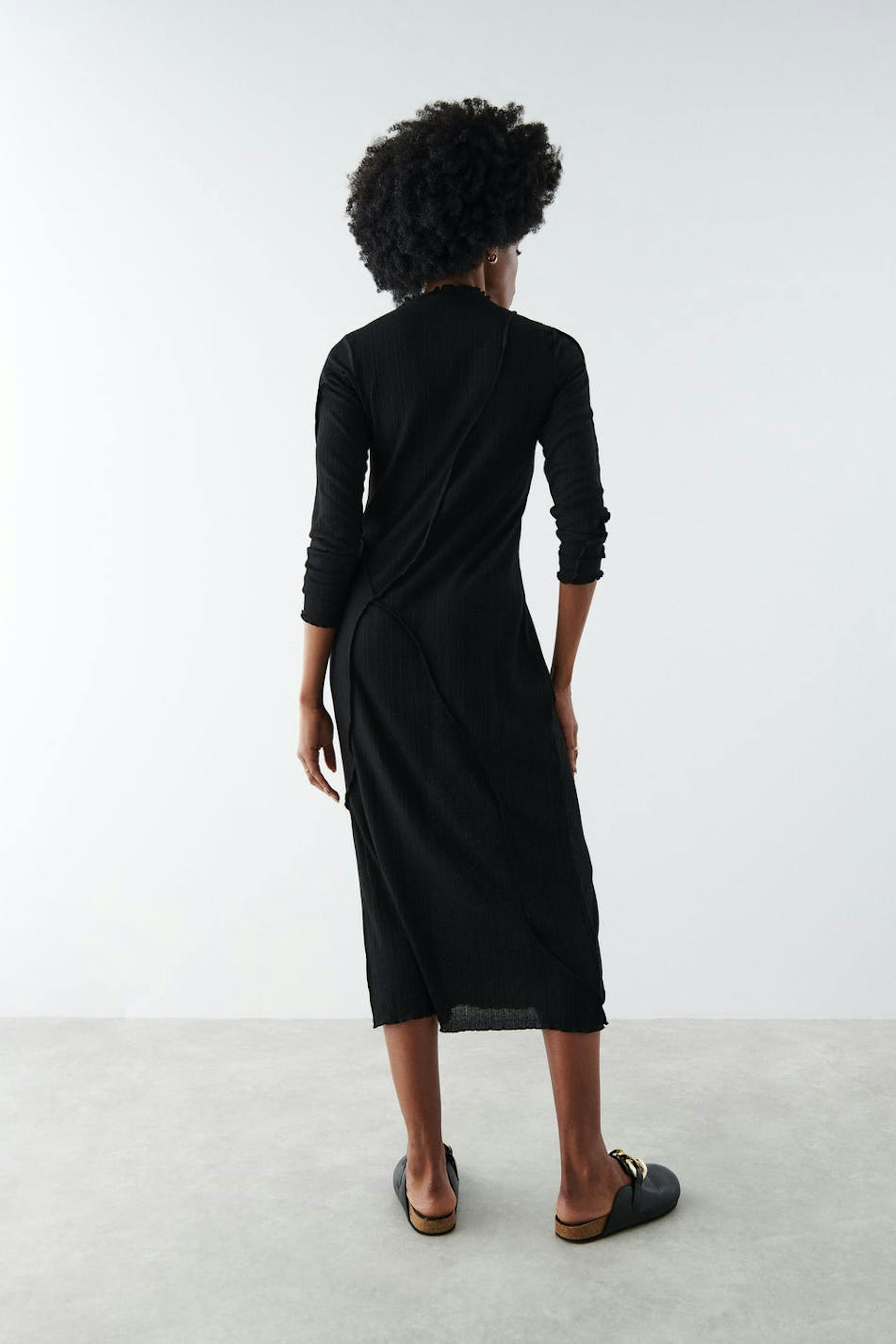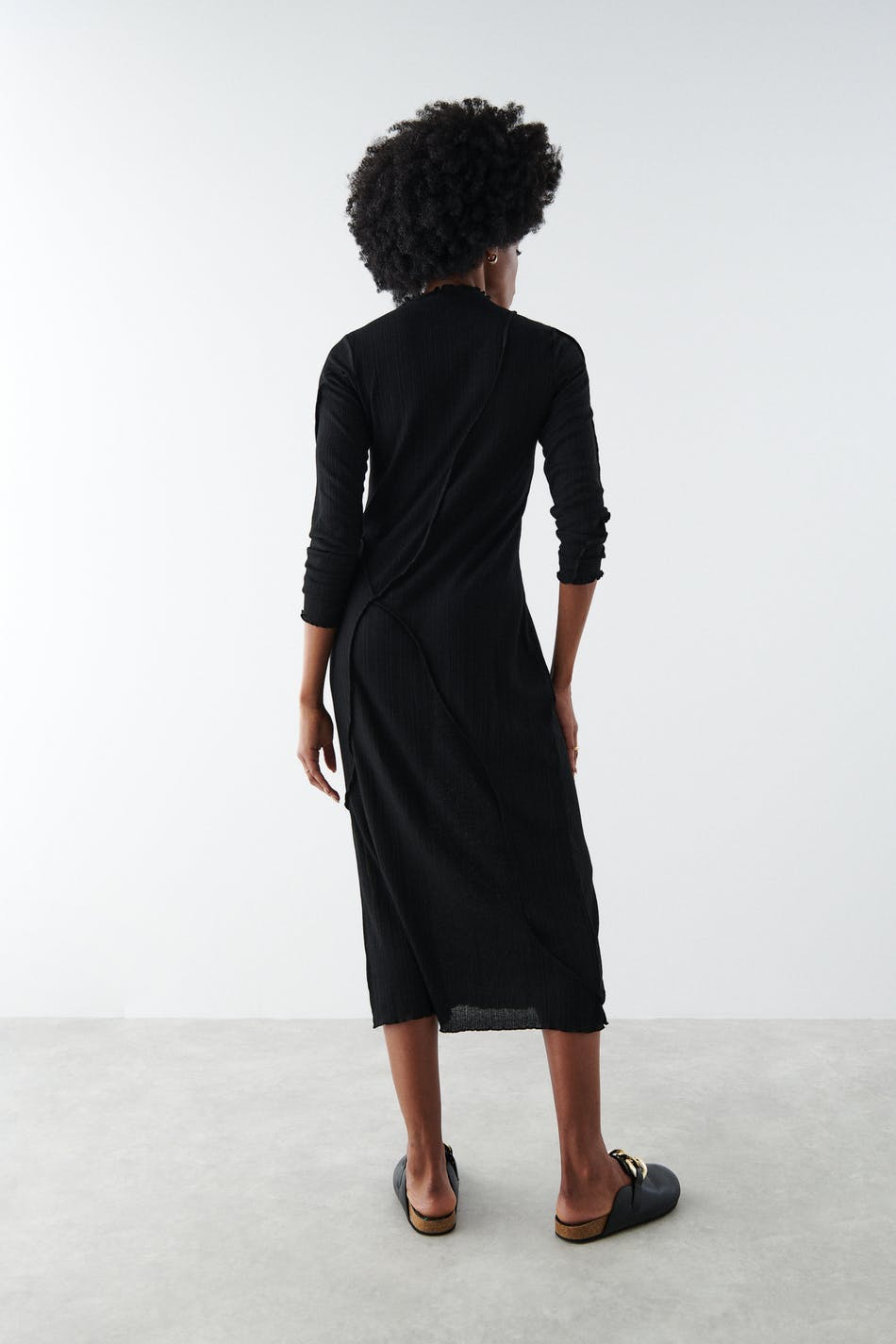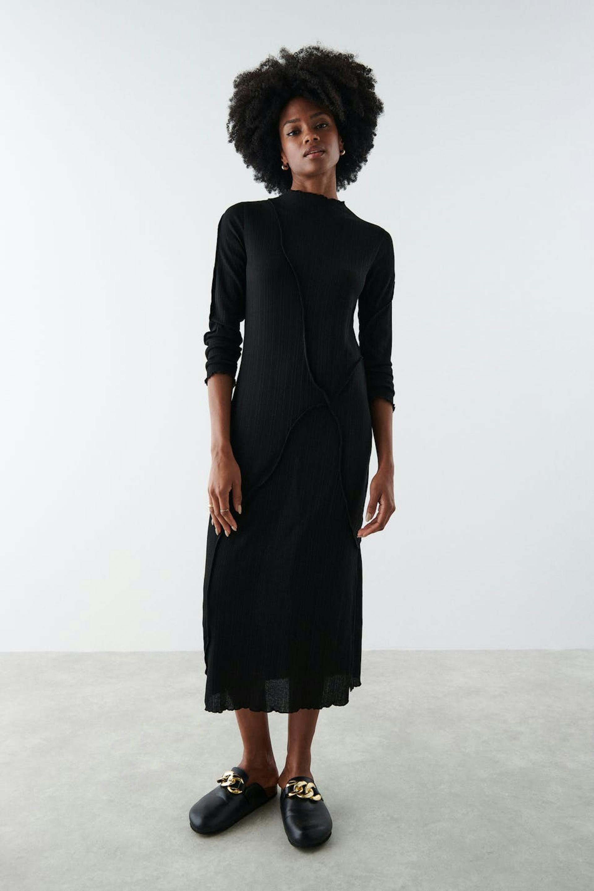 Långärmad maxiklänning med polokrage. Klänningen är svart och har en ribbad kvalitet i trikå. Den har sydda sömdetaljer, slits och rullfåll nedtill och vid ärmsluten.