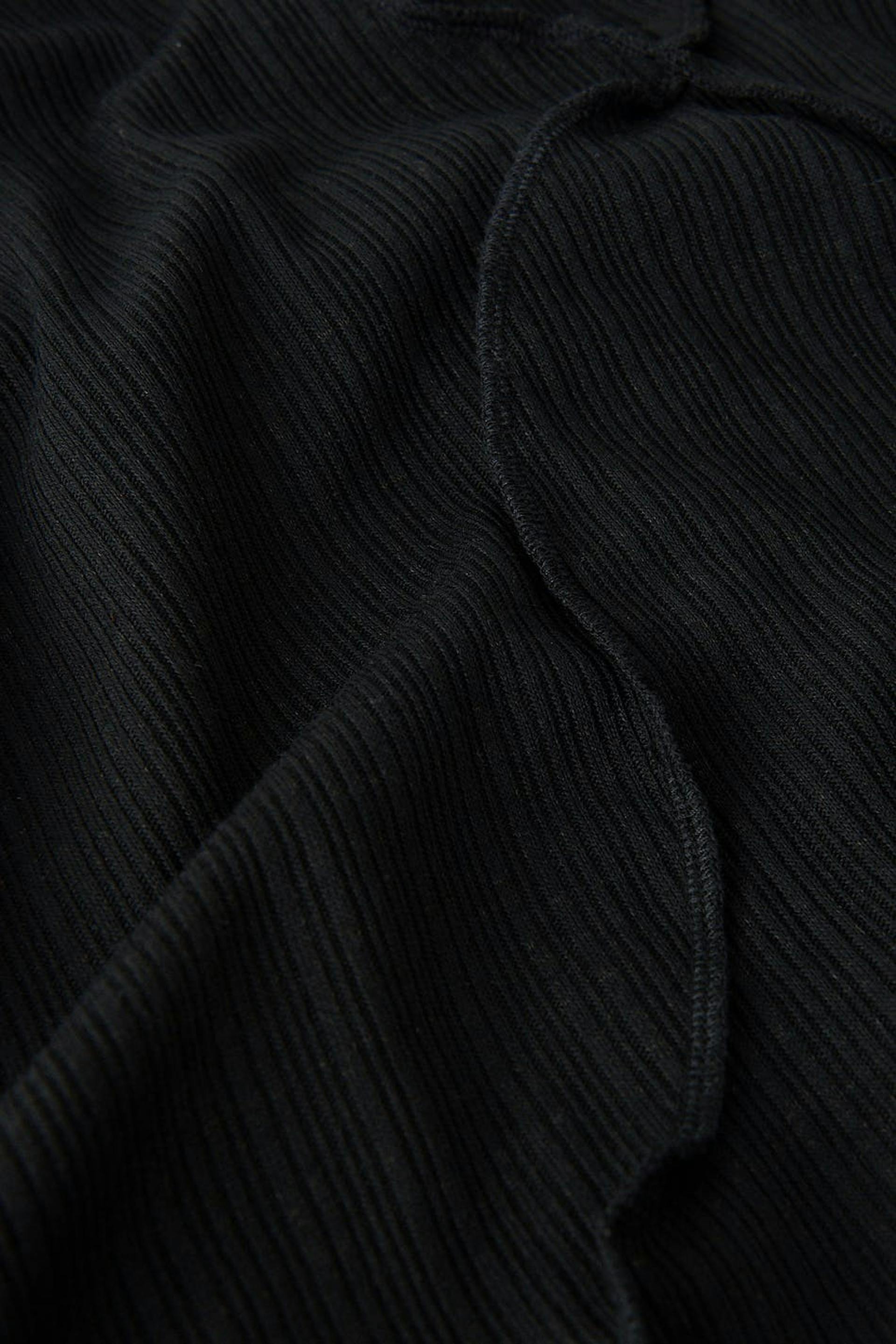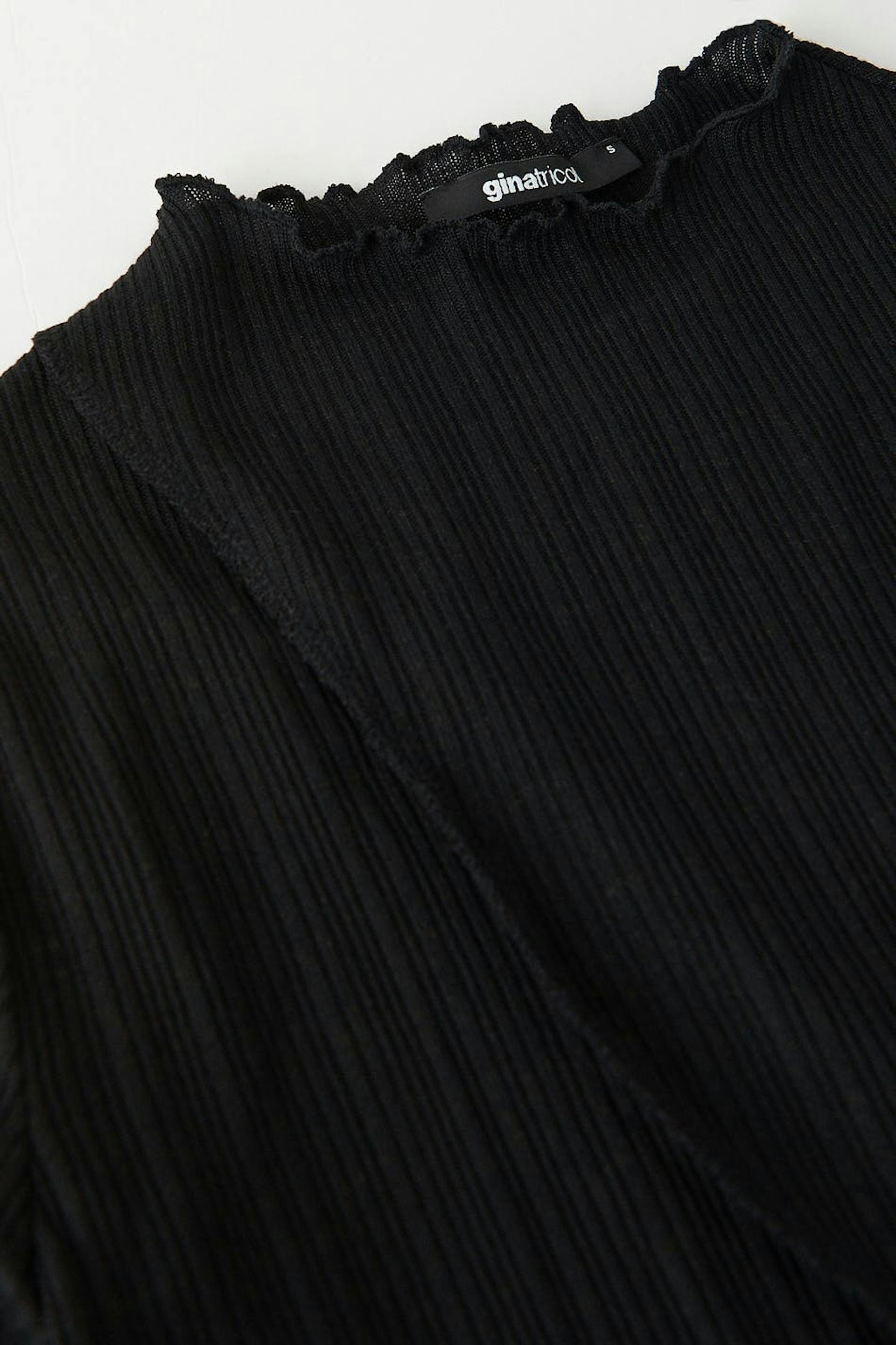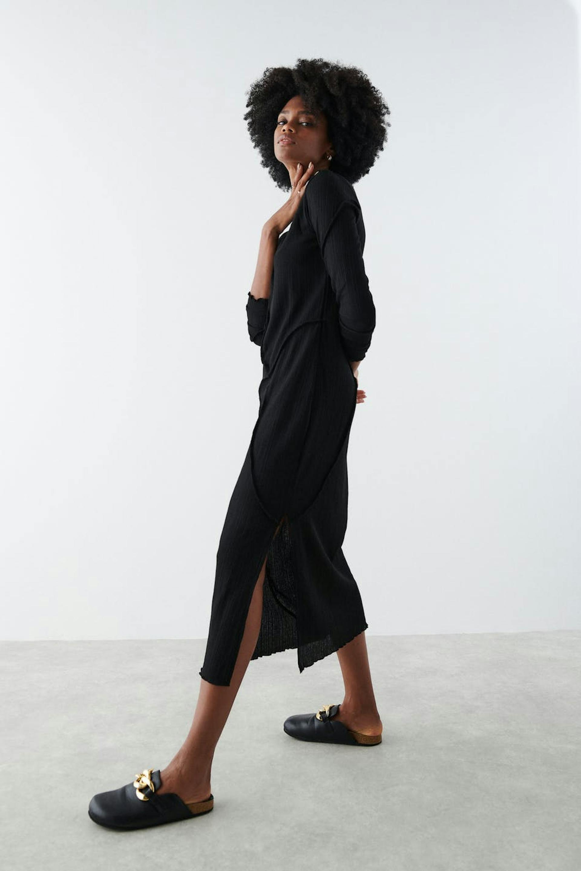 Långärmad maxiklänning med polokrage. Klänningen är svart och har en ribbad kvalitet i trikå. Den har sydda sömdetaljer, slits och rullfåll nedtill och vid ärmsluten.