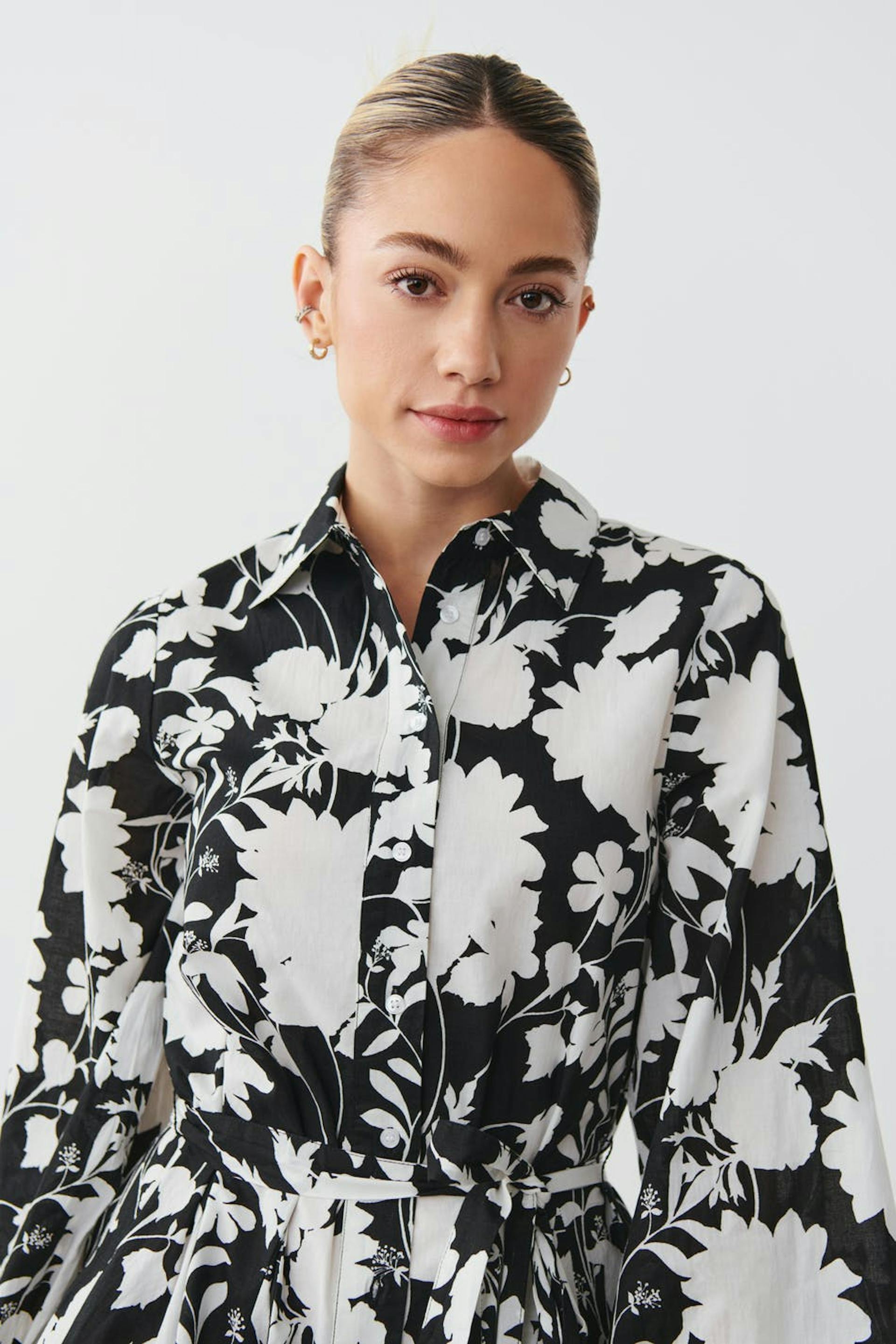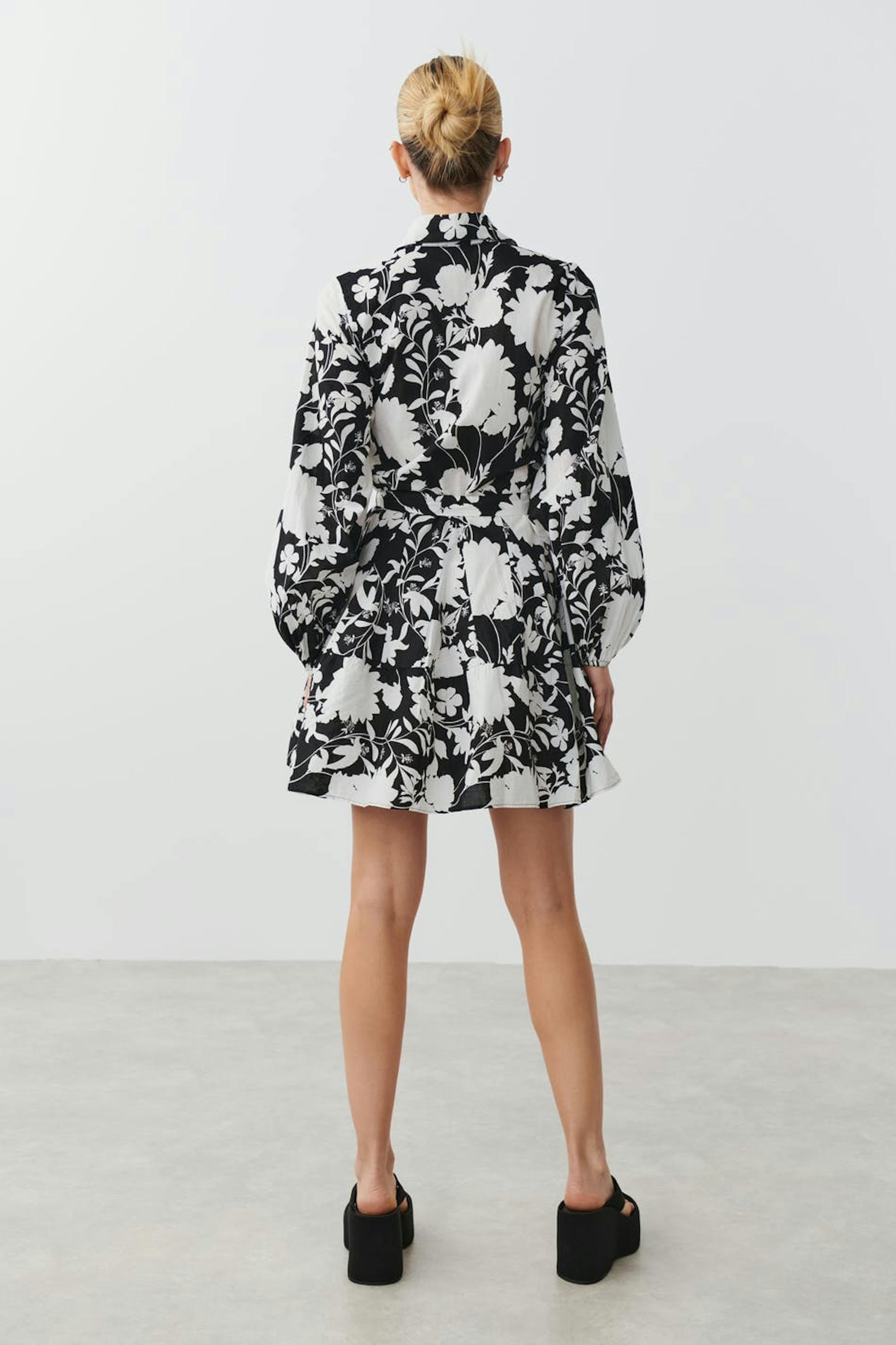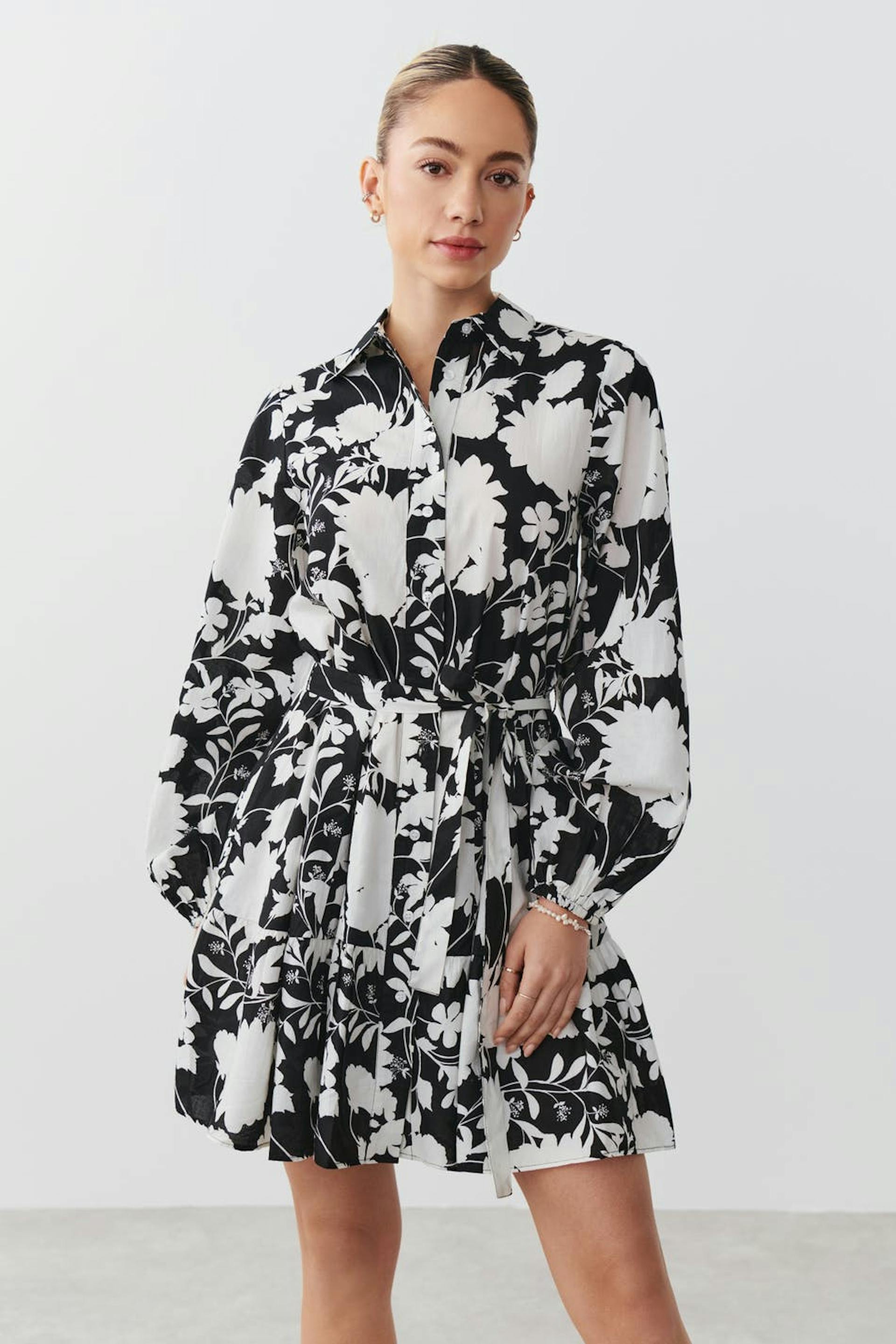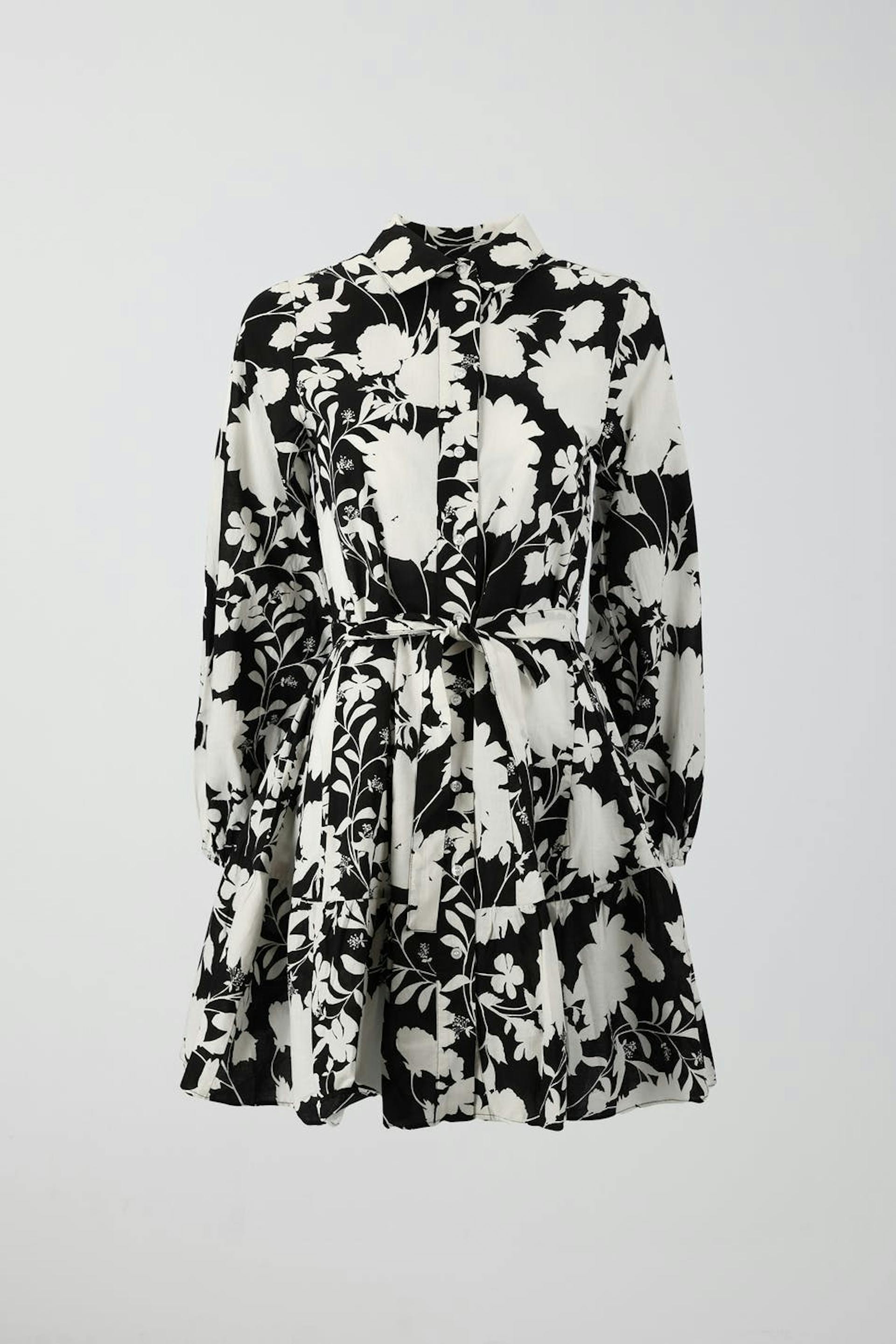 Blommig skjortklänning med knytbälte i midjan. Klänningen är svart, vit och långärmad. Den har volanger i nederkant, krage, knäppning fram, figurnära midja och resårärmslut.
