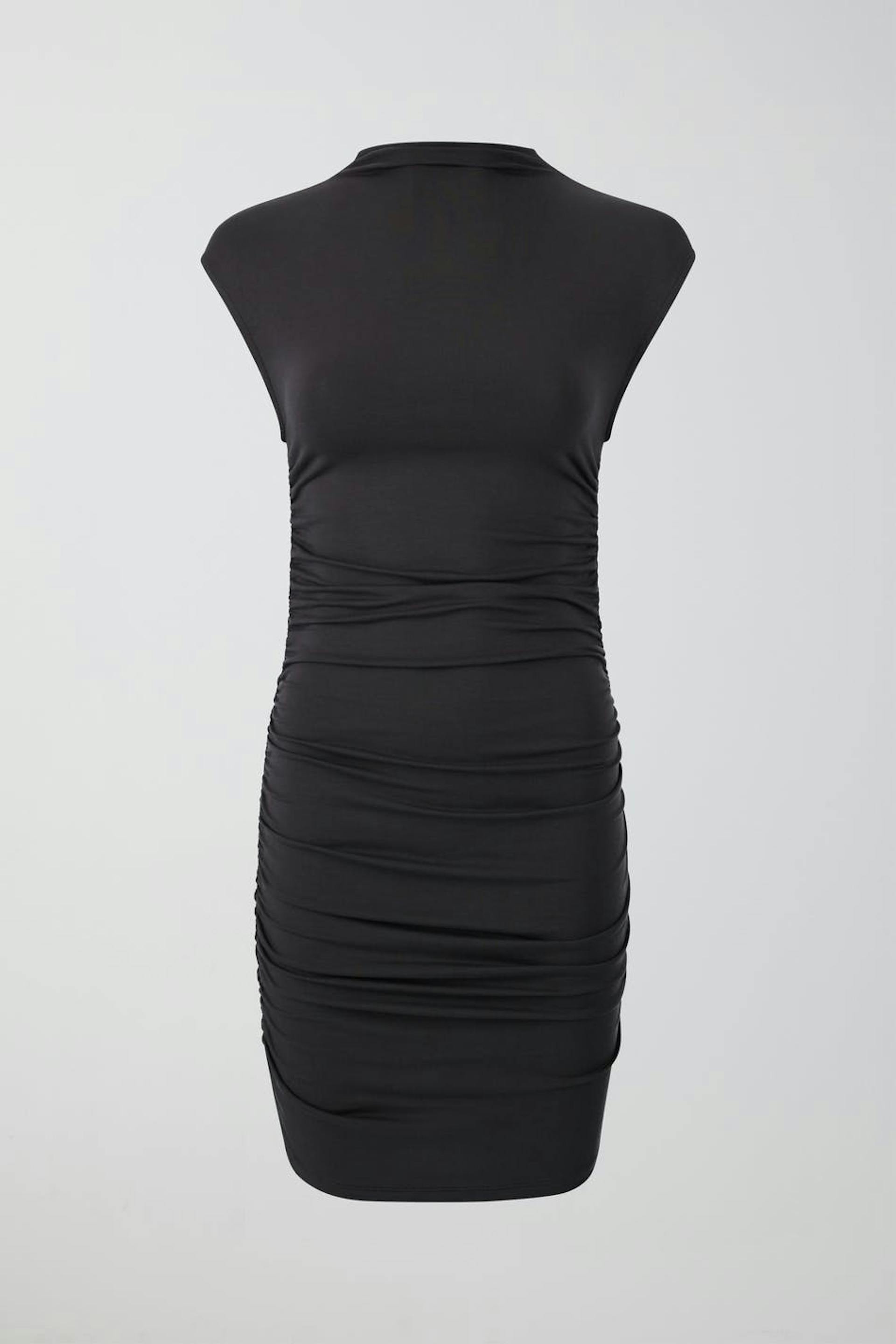 Ärmlös miniklänning i trikå med skorstenskrage. Klänningen är grå och har rynkningar i sidorna. Den har figurnära passform och en mjuk, stretchig kvalitet.