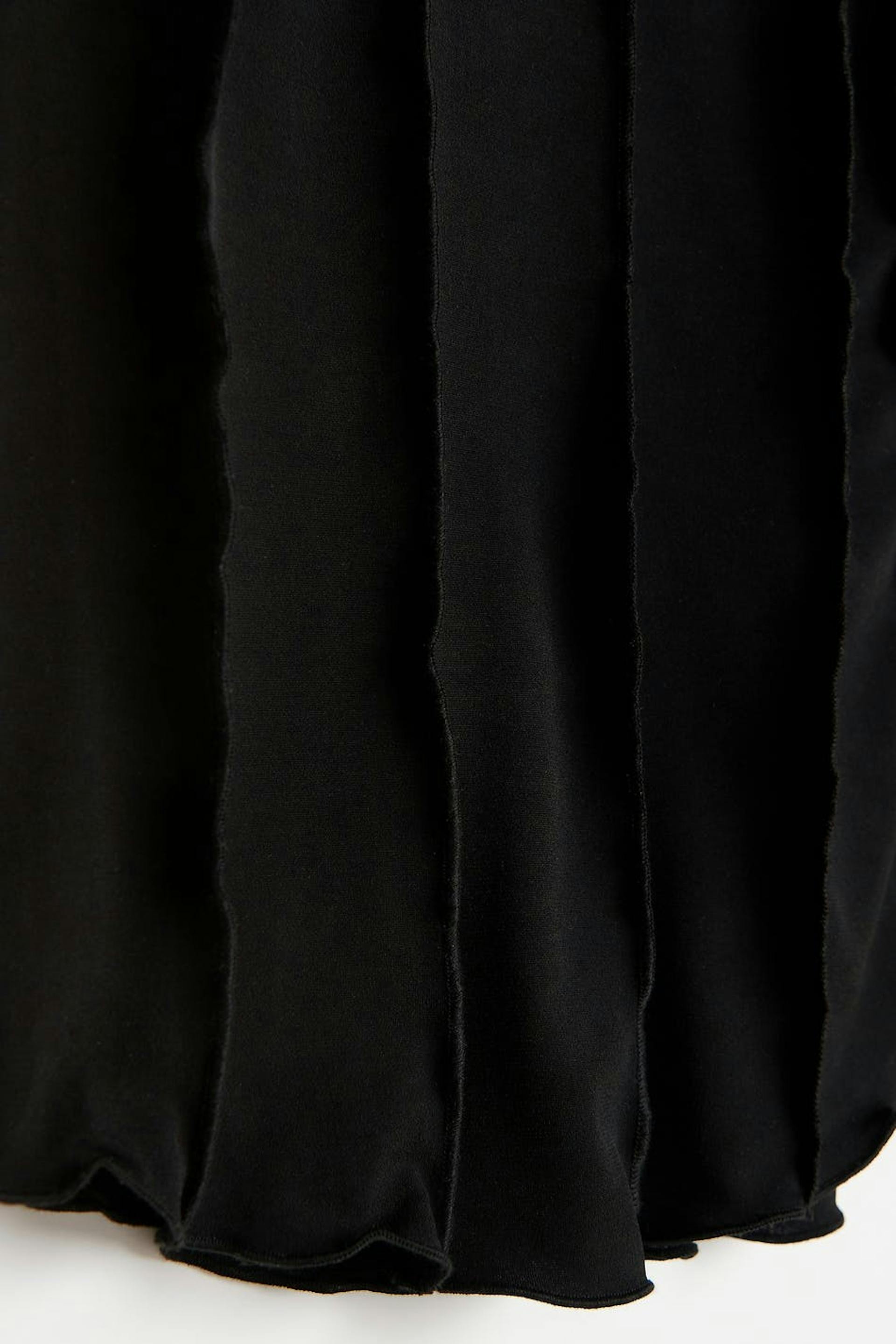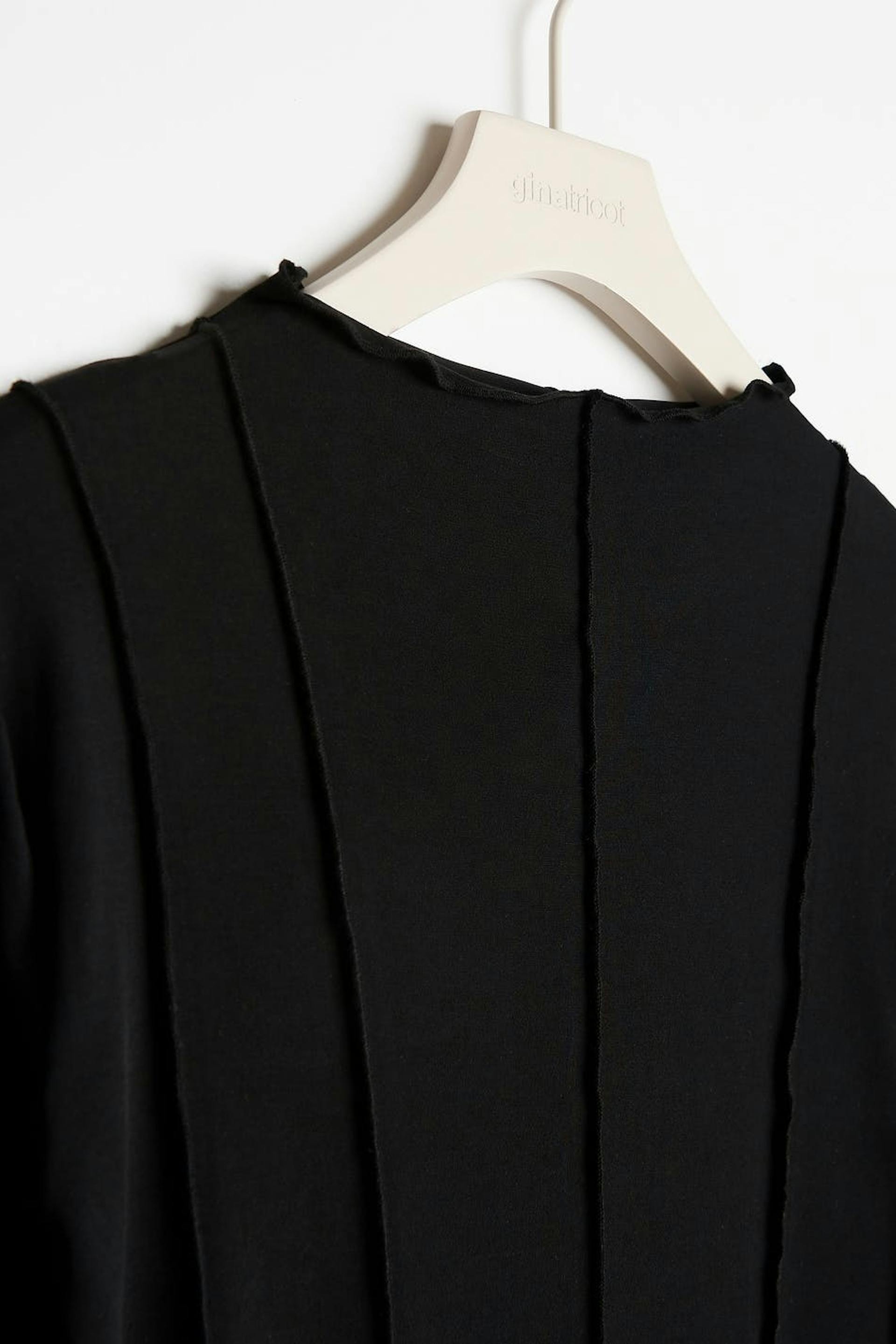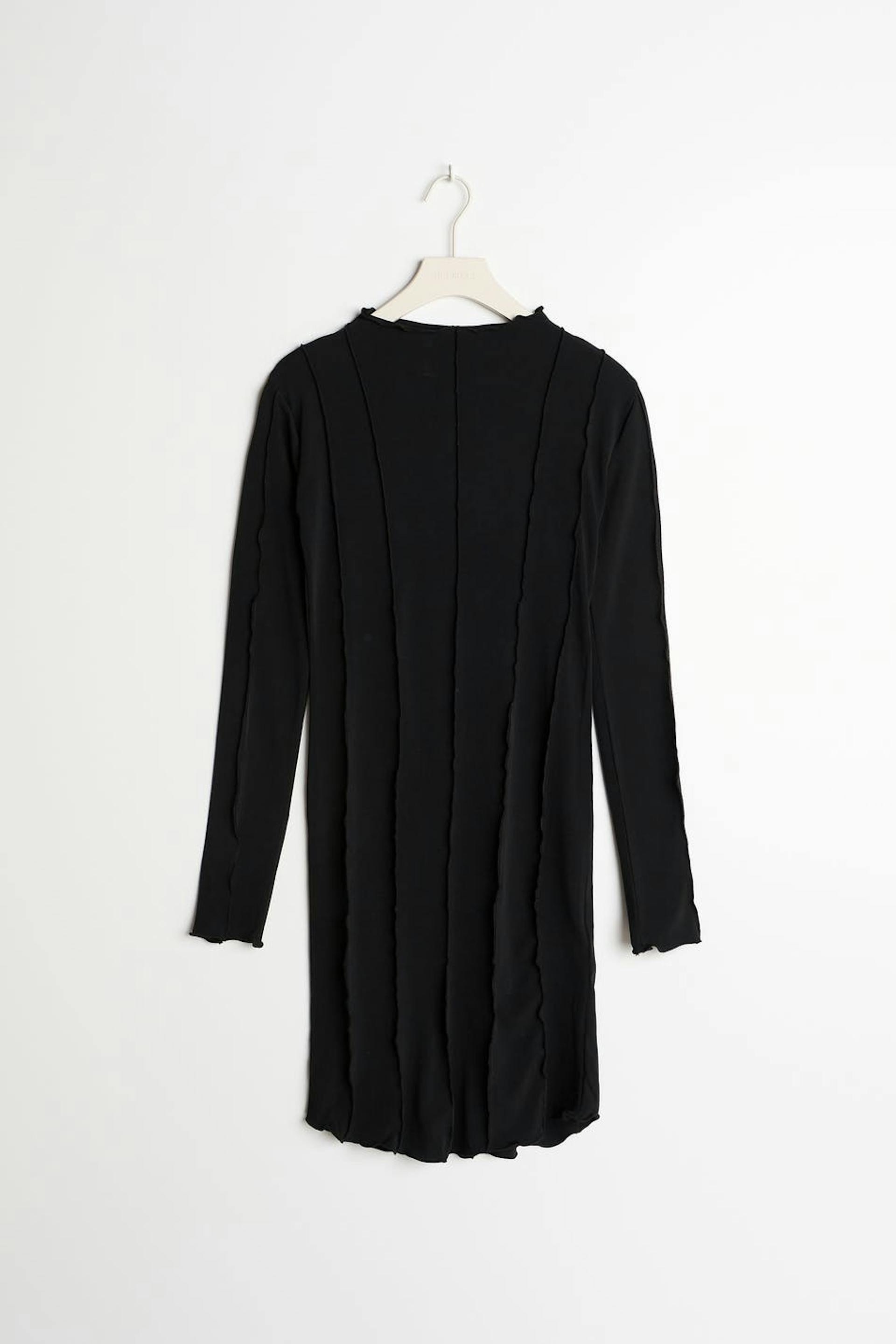 Långärmad klänning med dekorativa sömdetaljer fram och bak. Klänningen är perfekt för festen, svart och kort. Den har en hög halsringning och en figurnära passform.