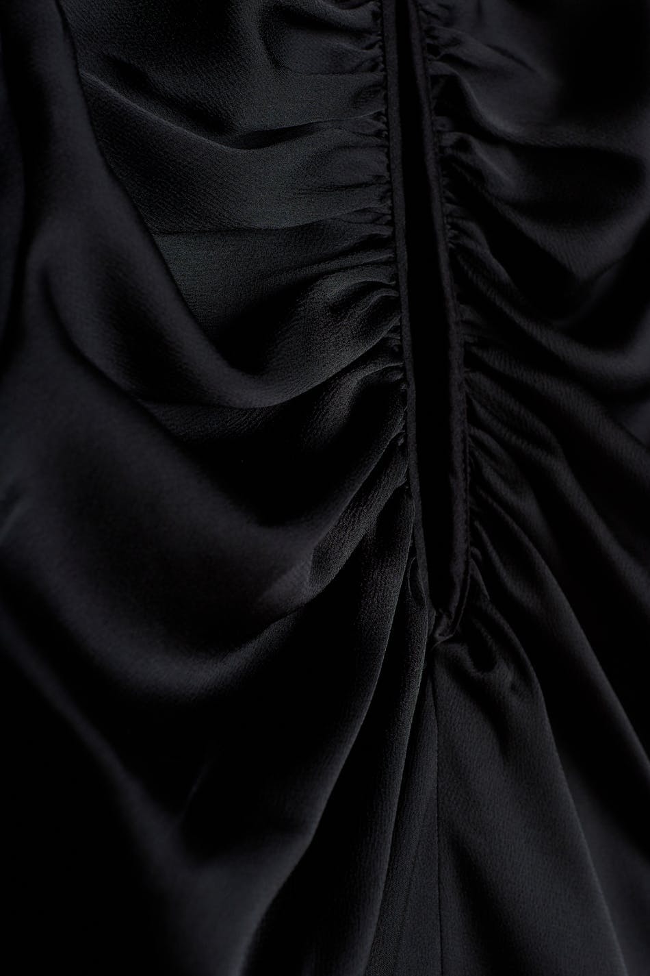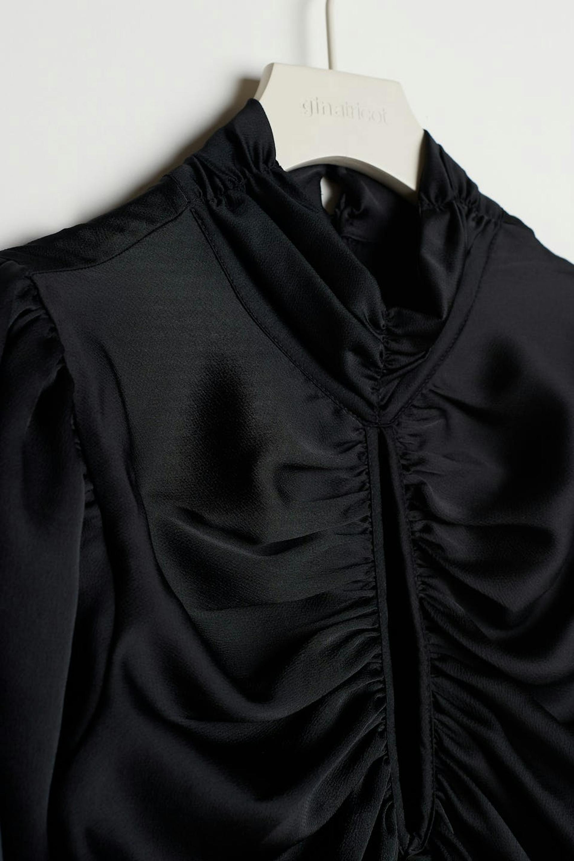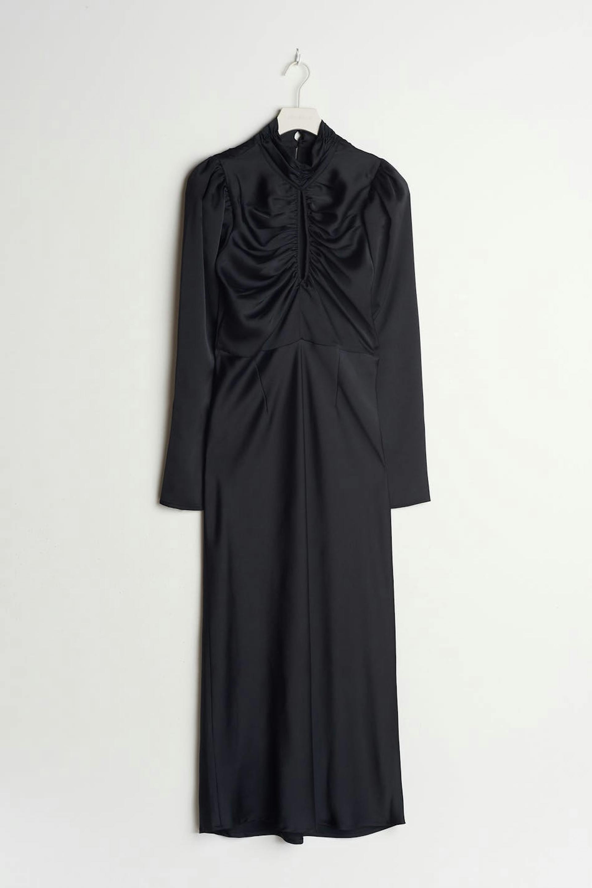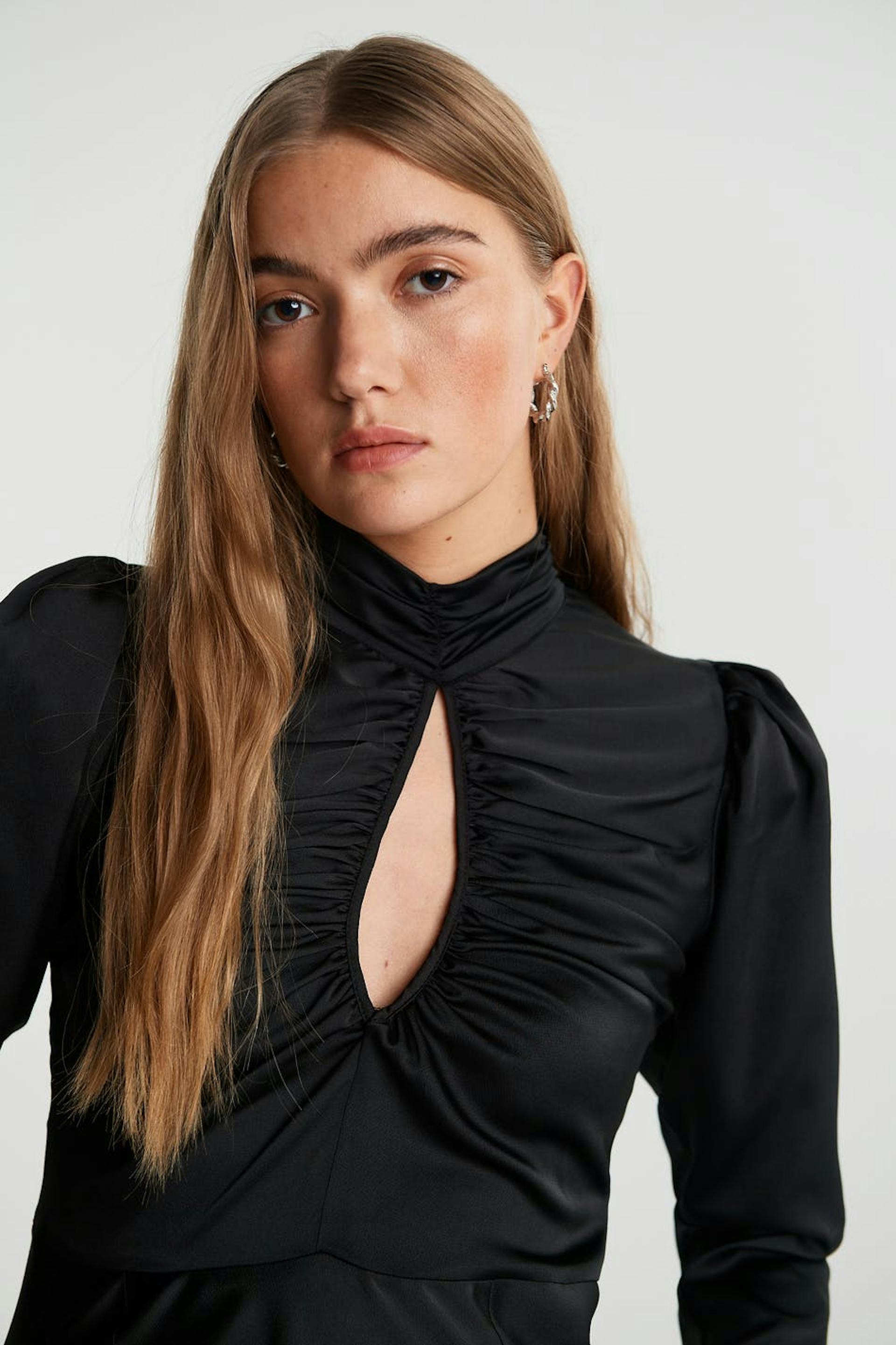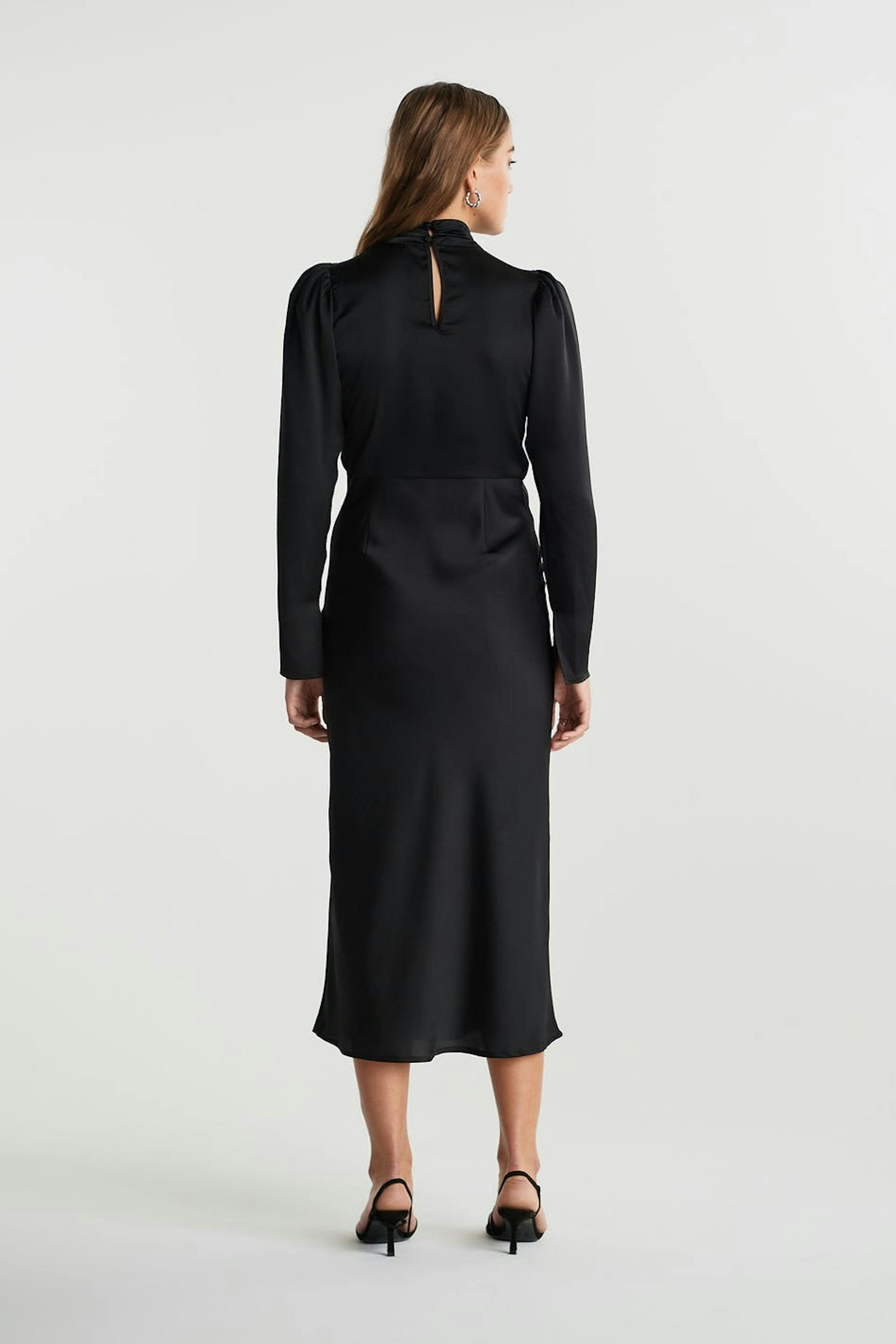 Vadlång klänning med långa puffärmar. Klänningen är svart och har en nyckelhålsöppning framtill med rynkning. Den är gjord av satin och har en sömdetalj i midjan.