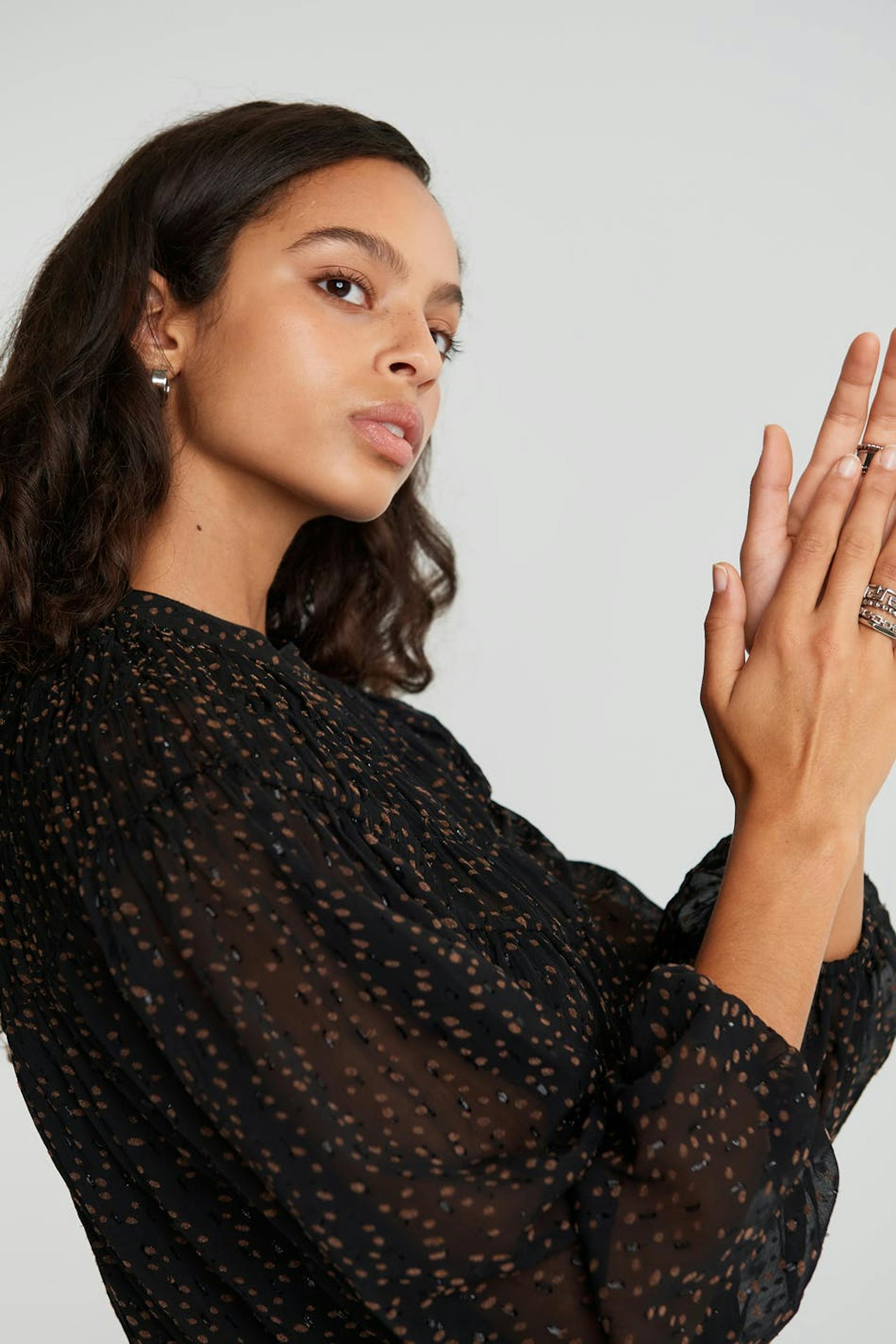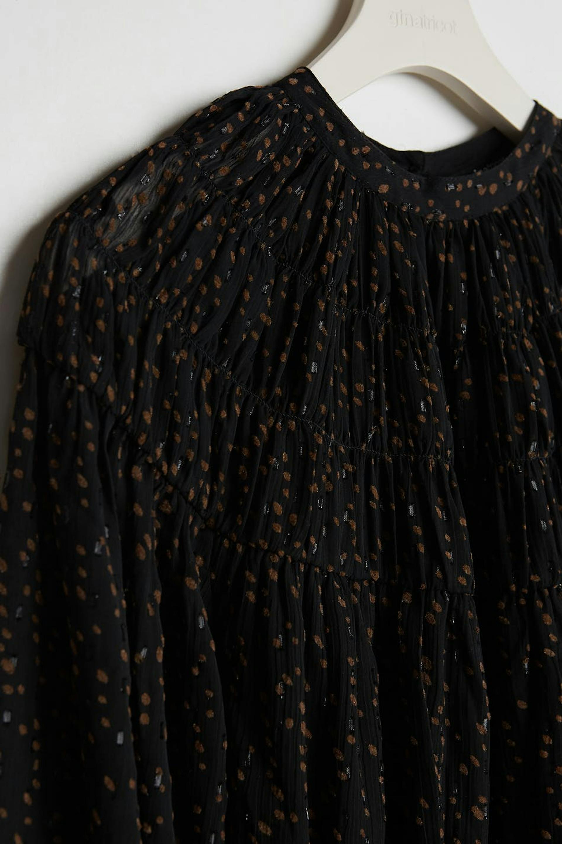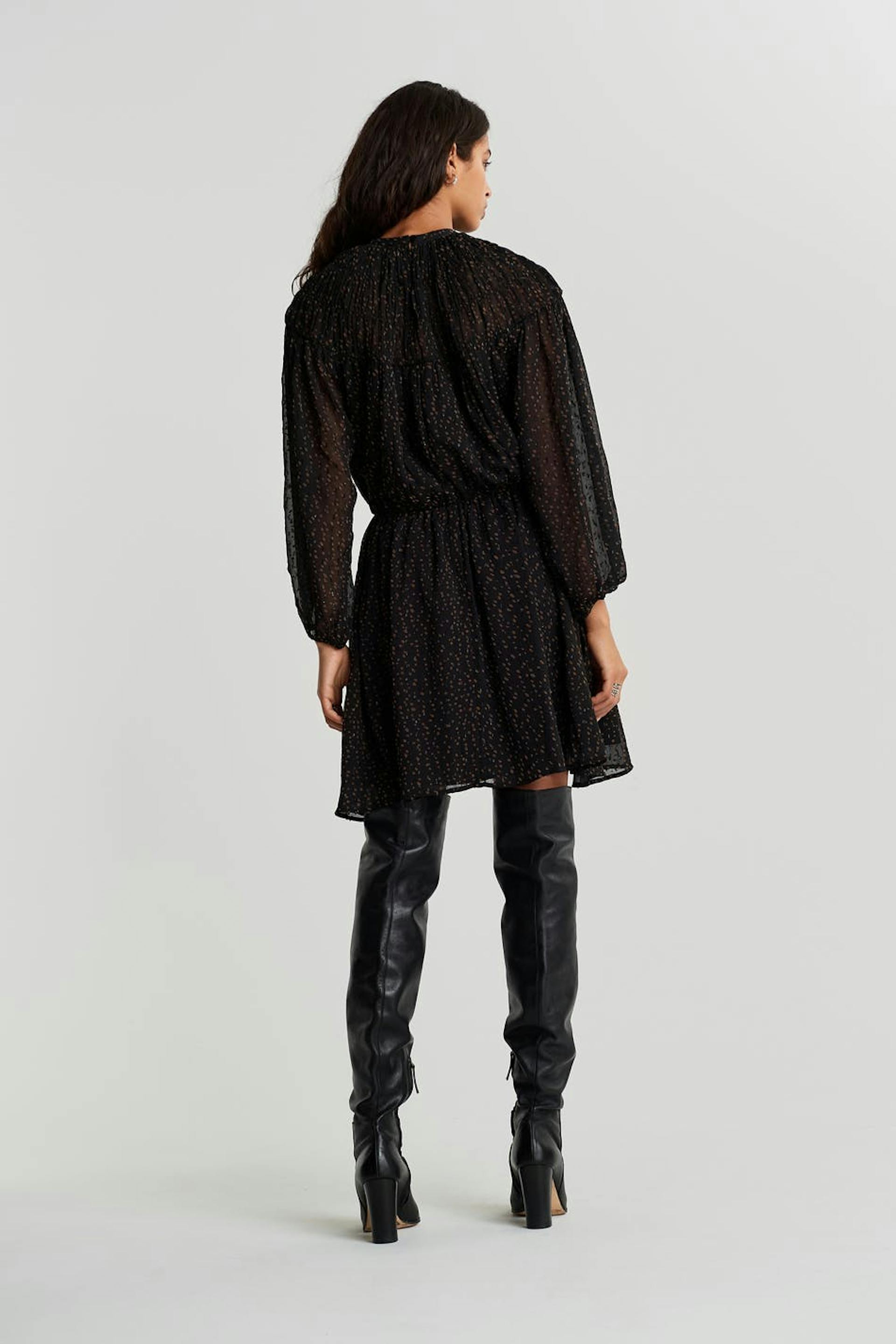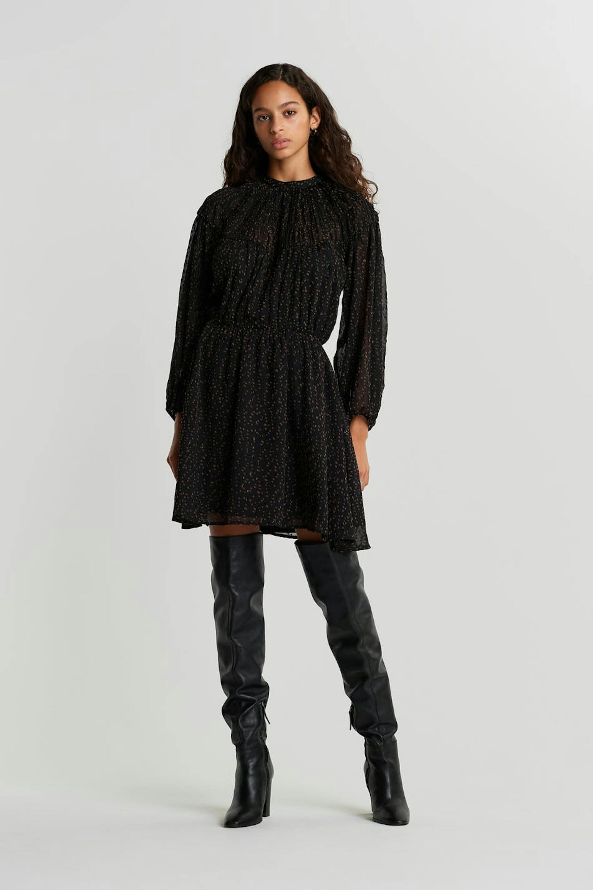 Klänning med bruna prickar. Klänningen är svart och har långa, voluminösa ärmar. Den är gjord av chiffon och har en resår i midjan.
