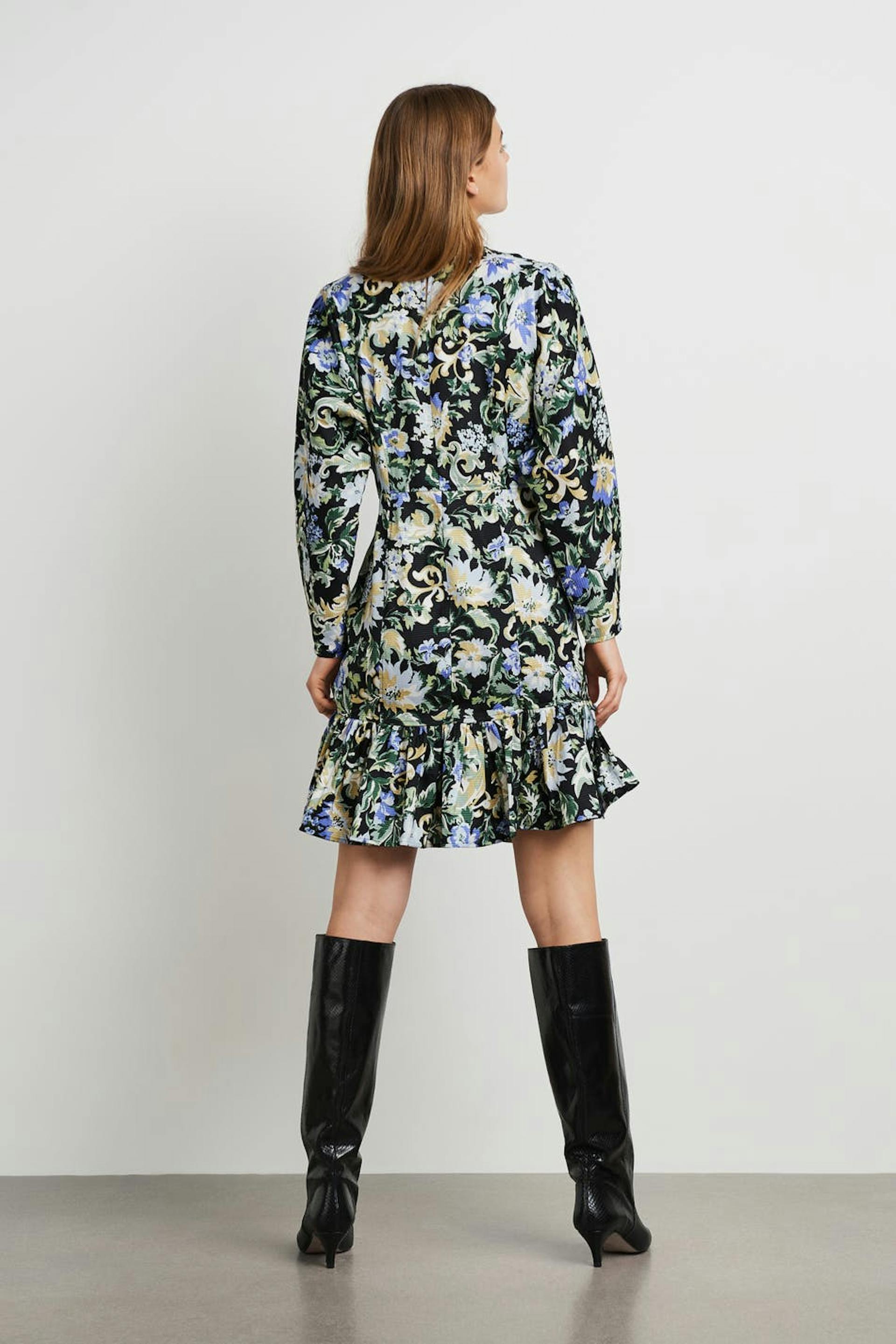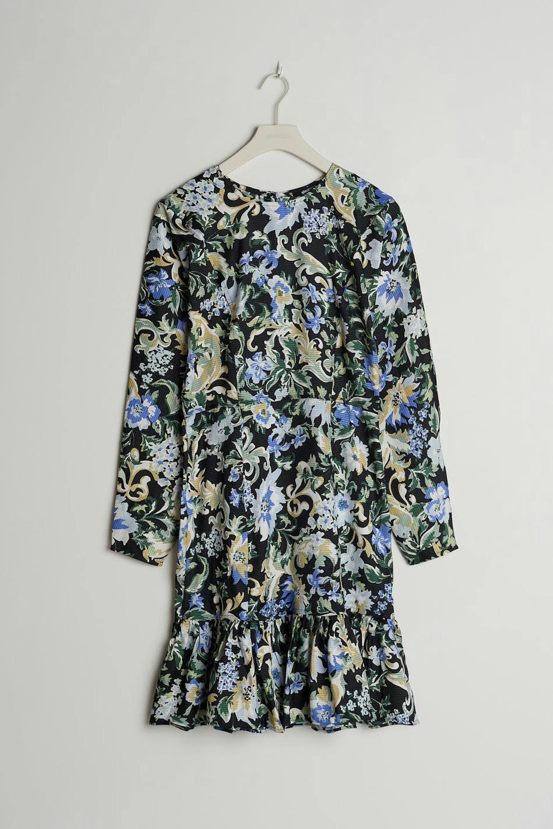 Långärmad klänning med en volangkjol. Klänningen är svart och har en knäppning baktill. Den har en lös passform upptill och en utsvängd nederdel.