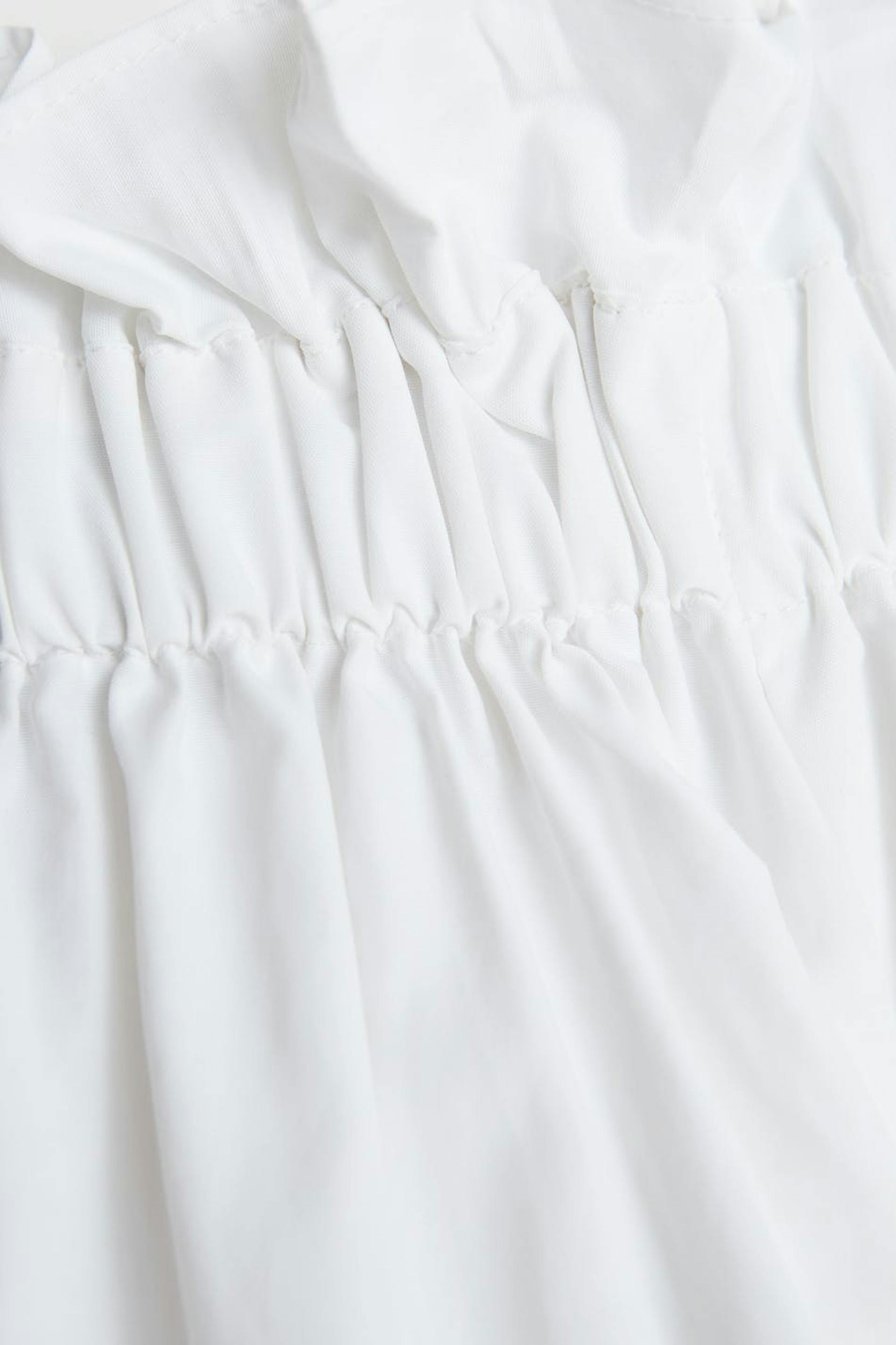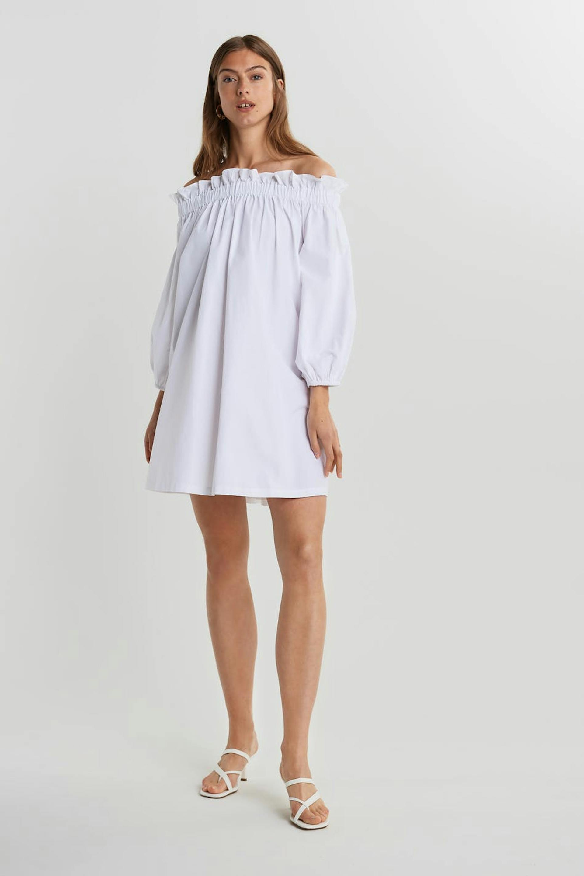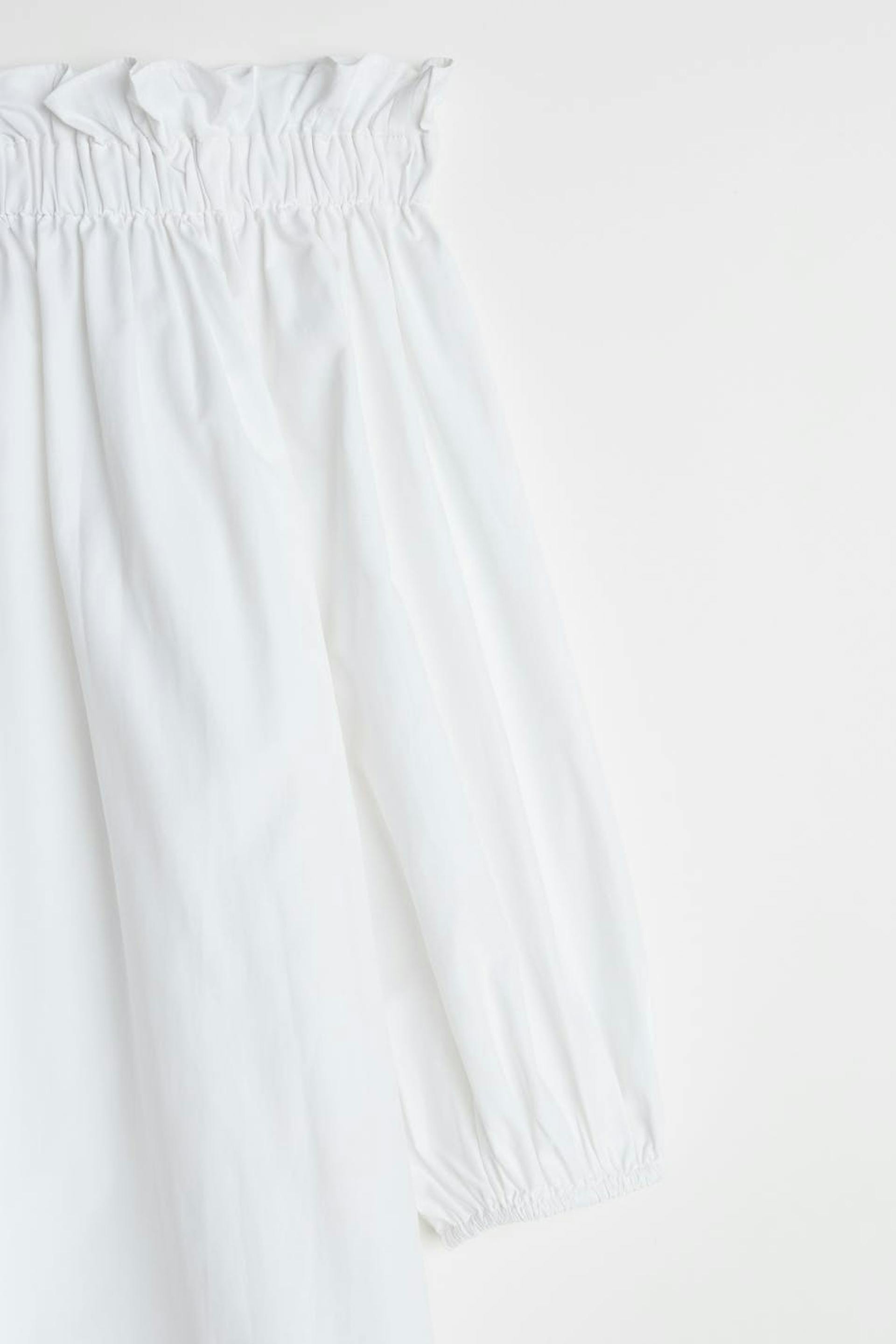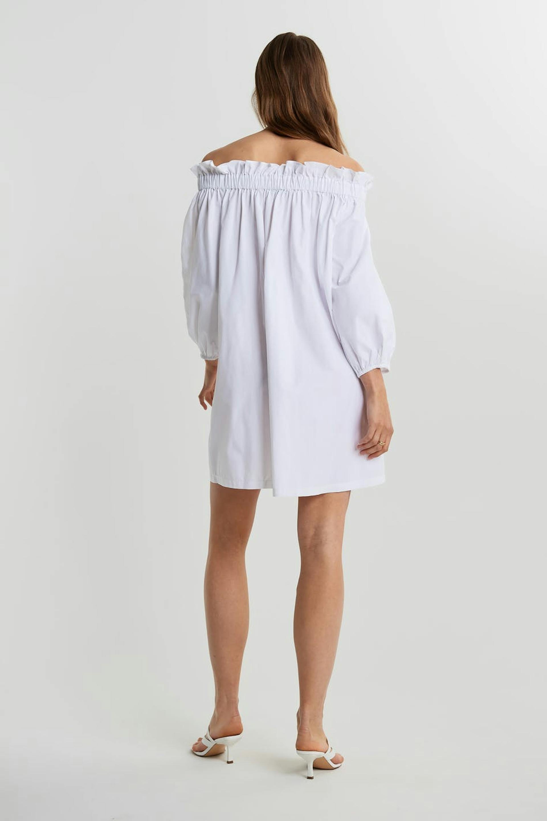 Långärmad klänning med en off shoulder-design. Klänningen är vit och har en resår vid ärmsluten och vid halsringningen. Den har en volangdetalj vid halsringningen.