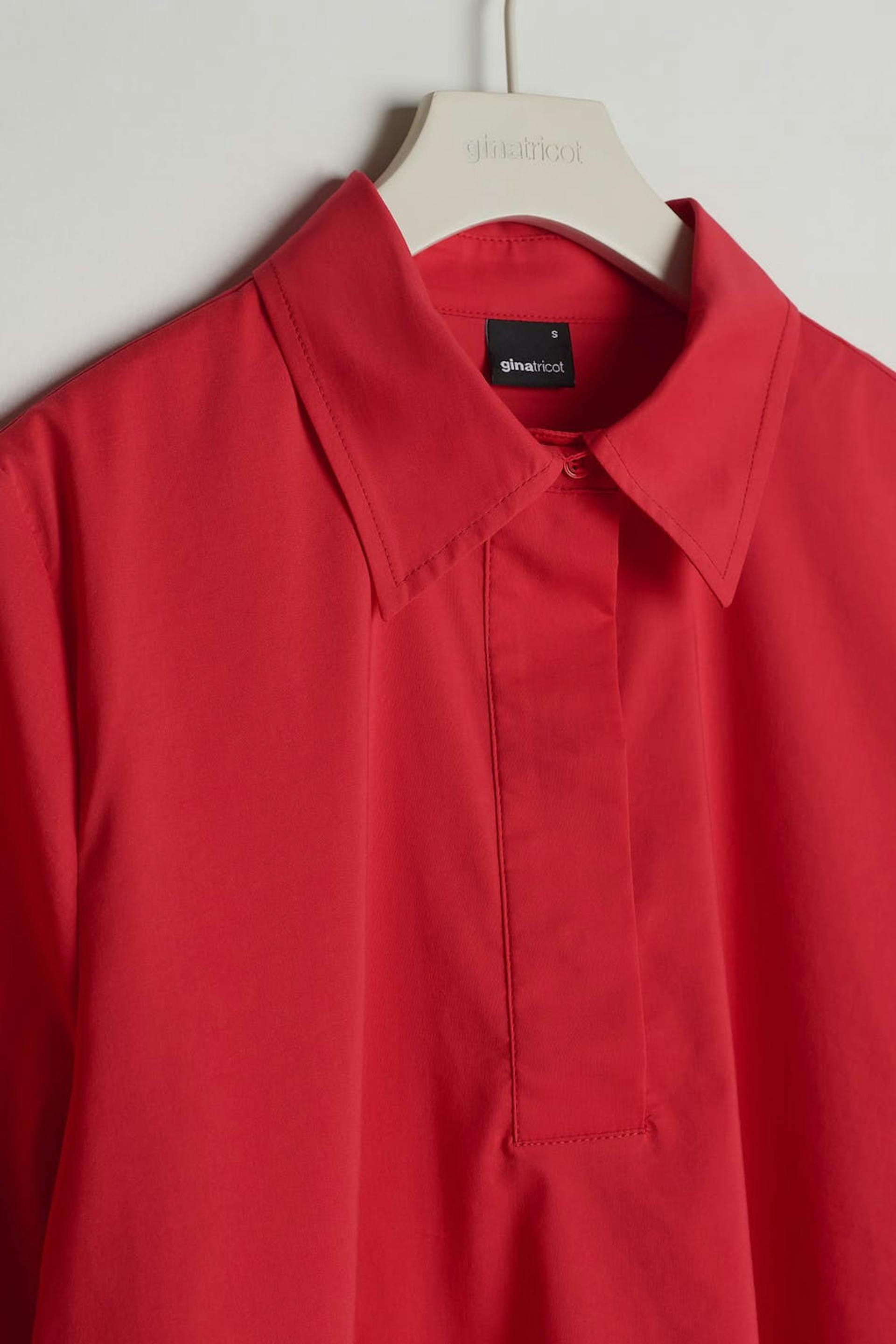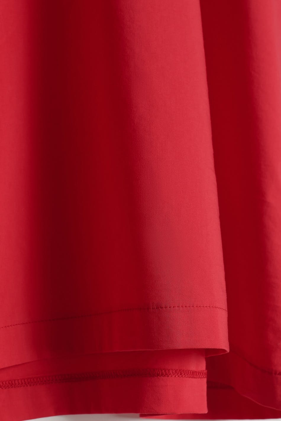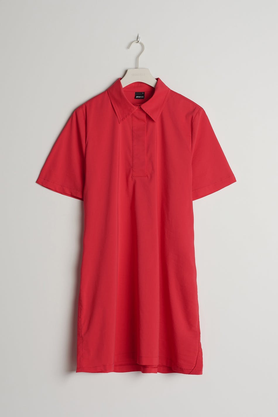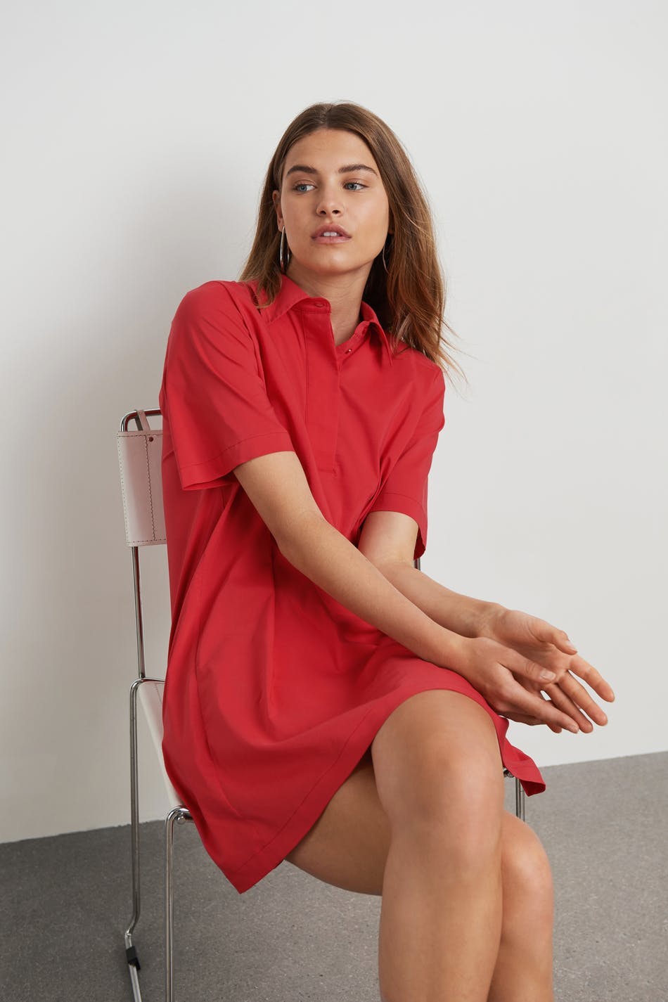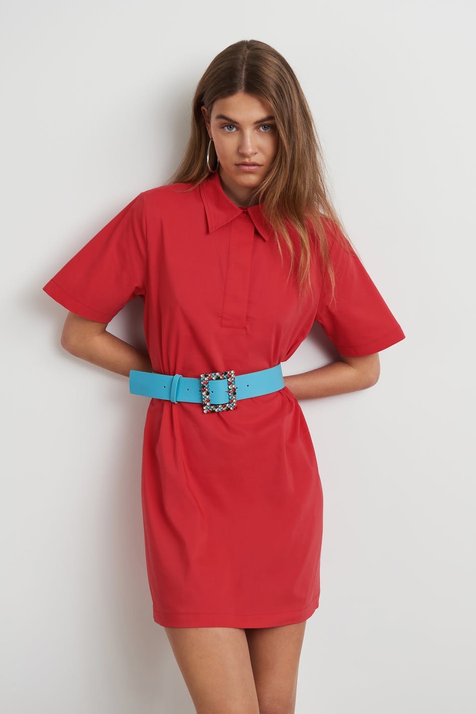 Kort klänning med axelvaddar. Klänningen är röd och har t-shirtärmar. Den har en skjortkrage med dekorativa knappar.