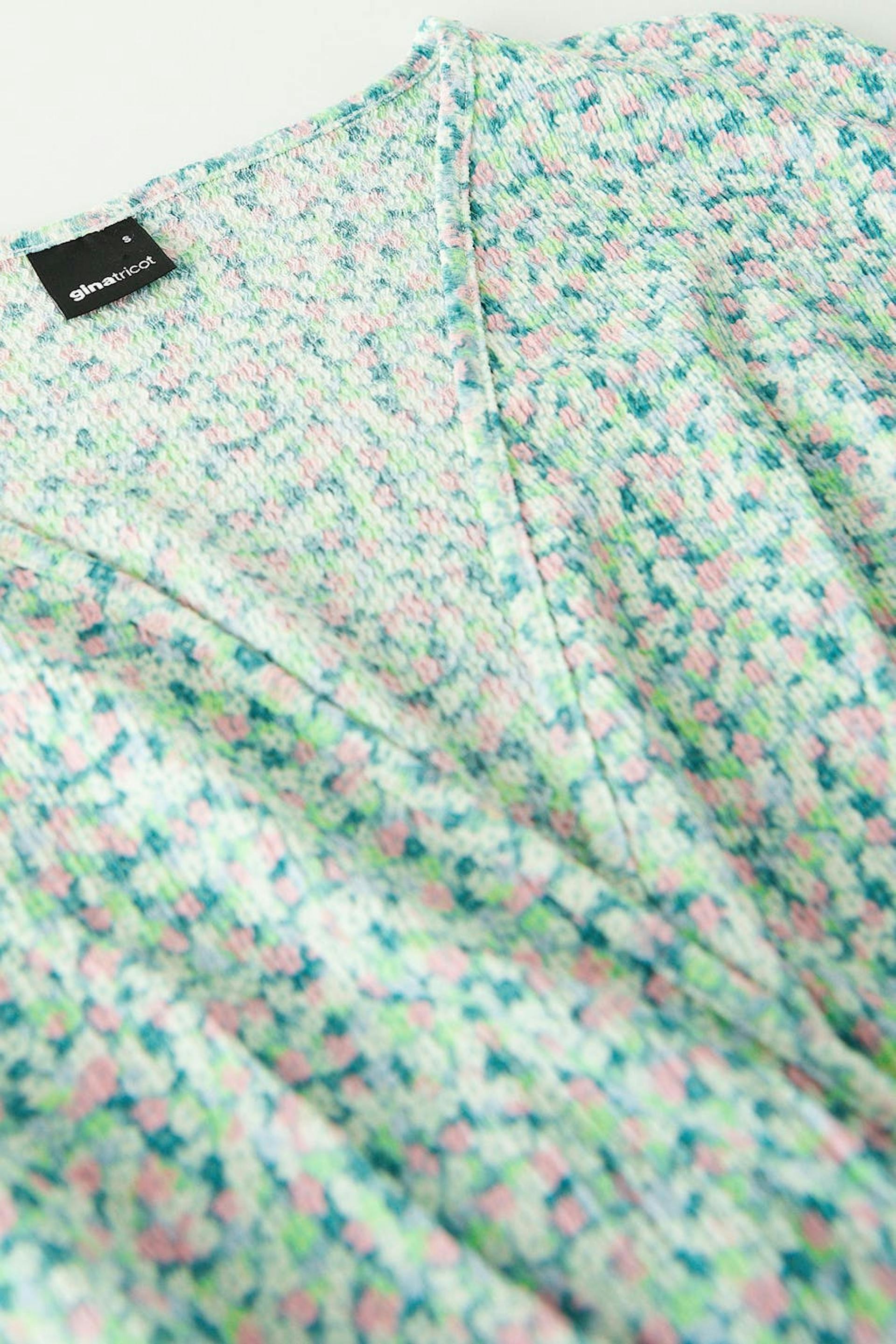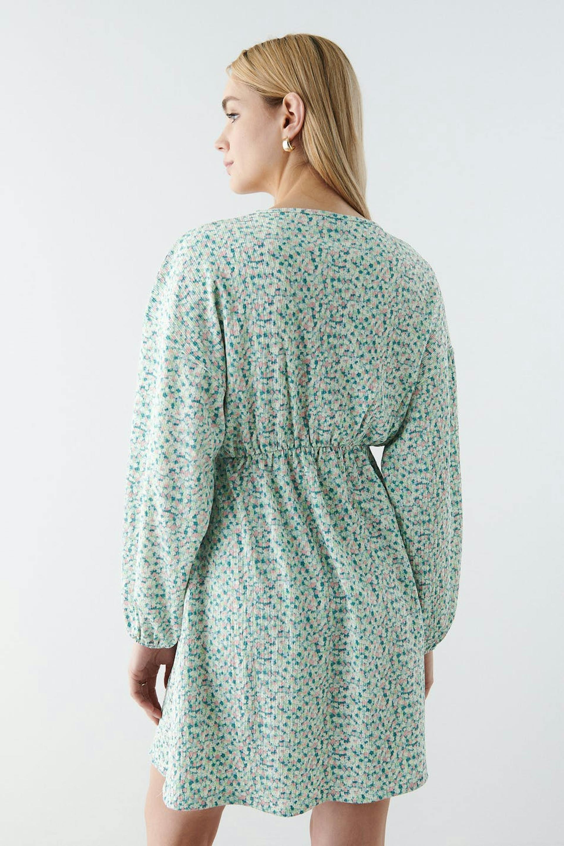 Klänning i trikå med en normal passform. Klänningen är grön och har ballongärmar. Den har en v-ringning och resår i midjan och vid ärmsluten.