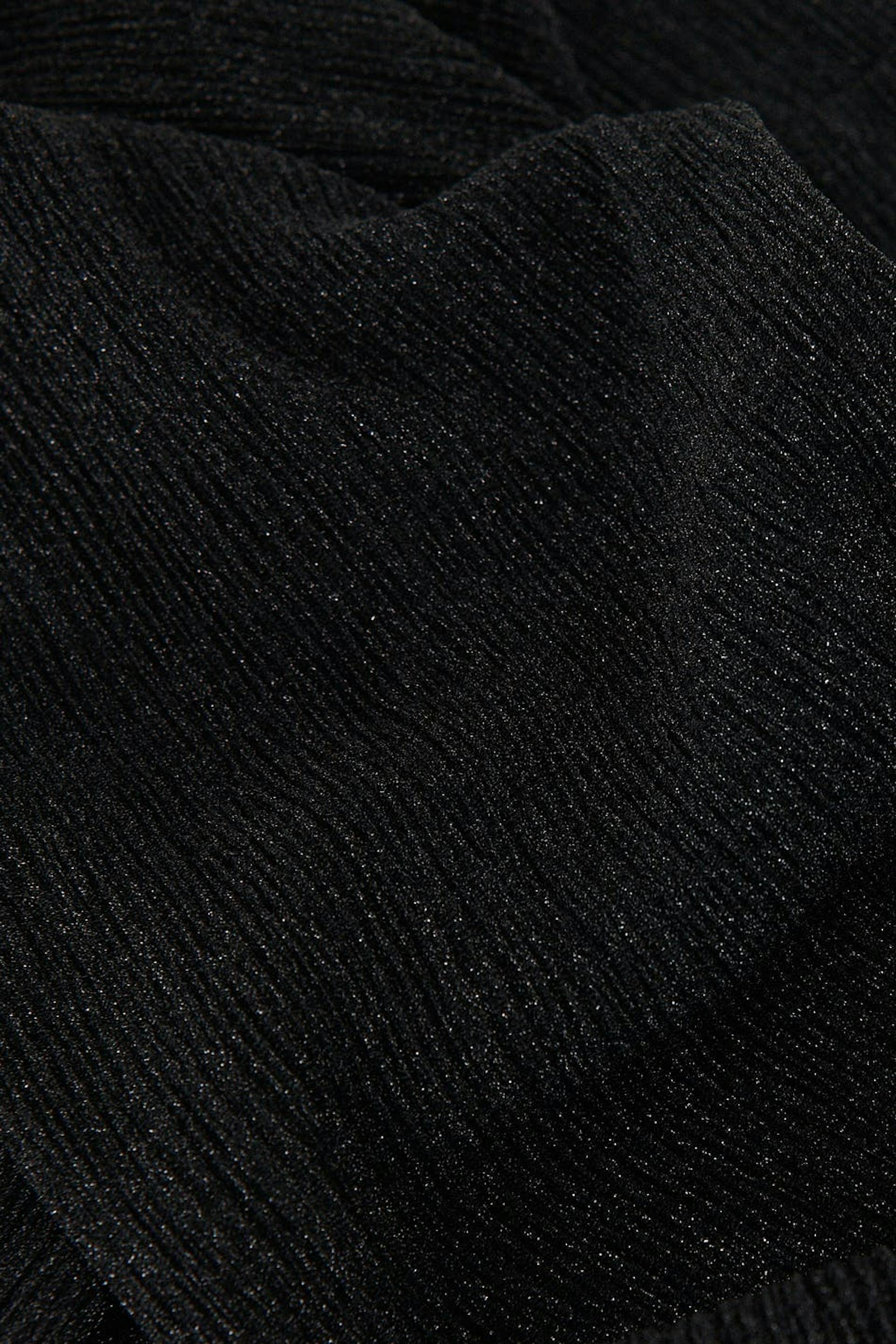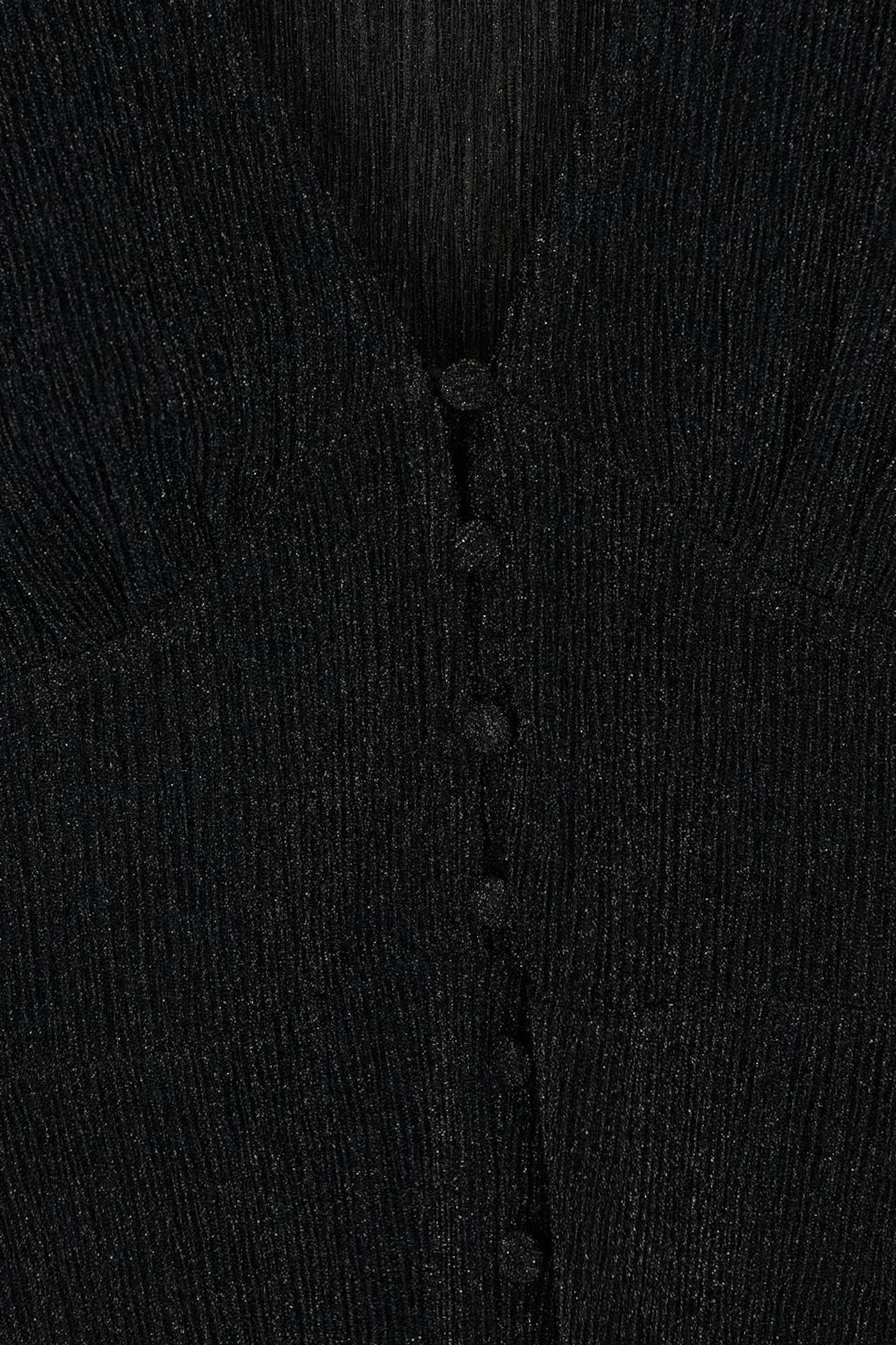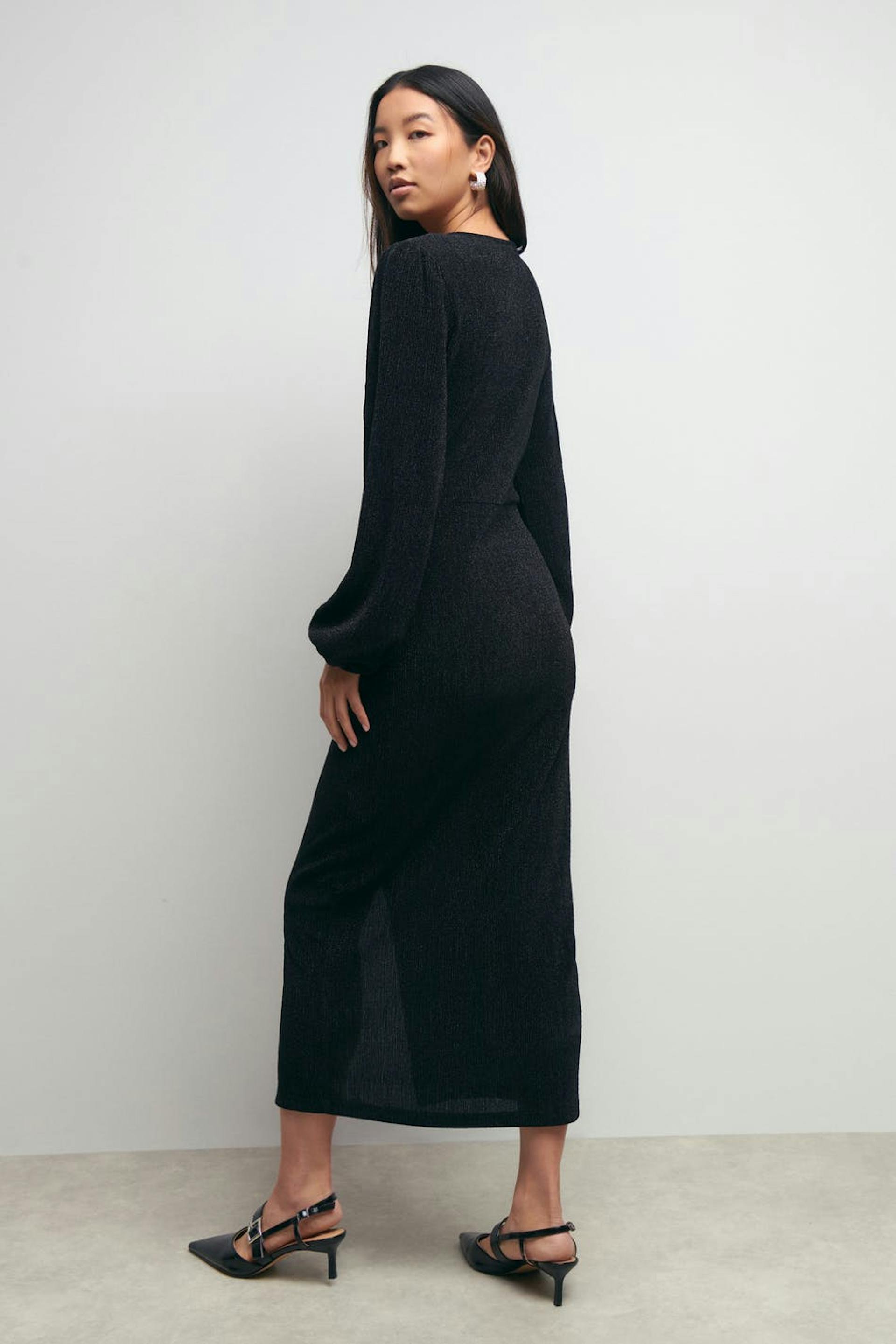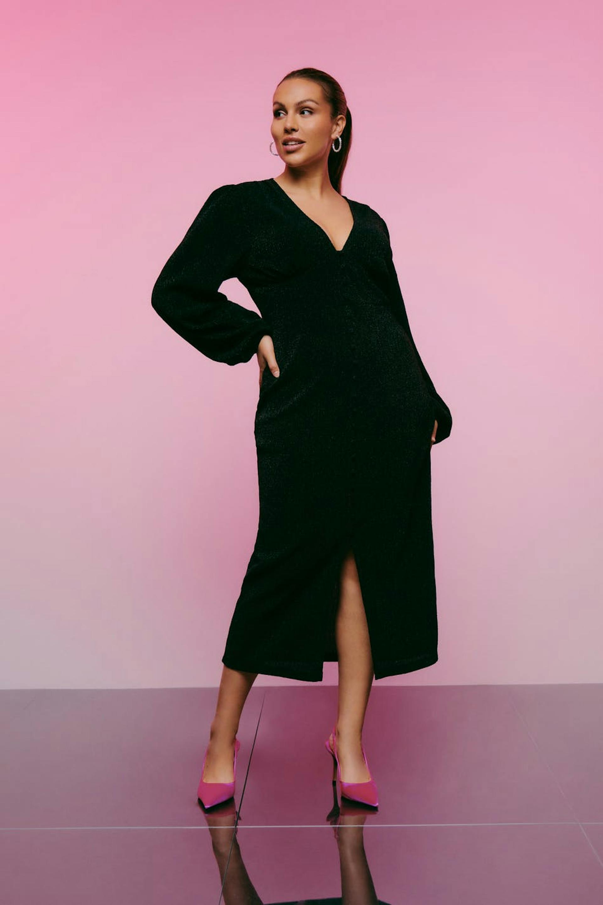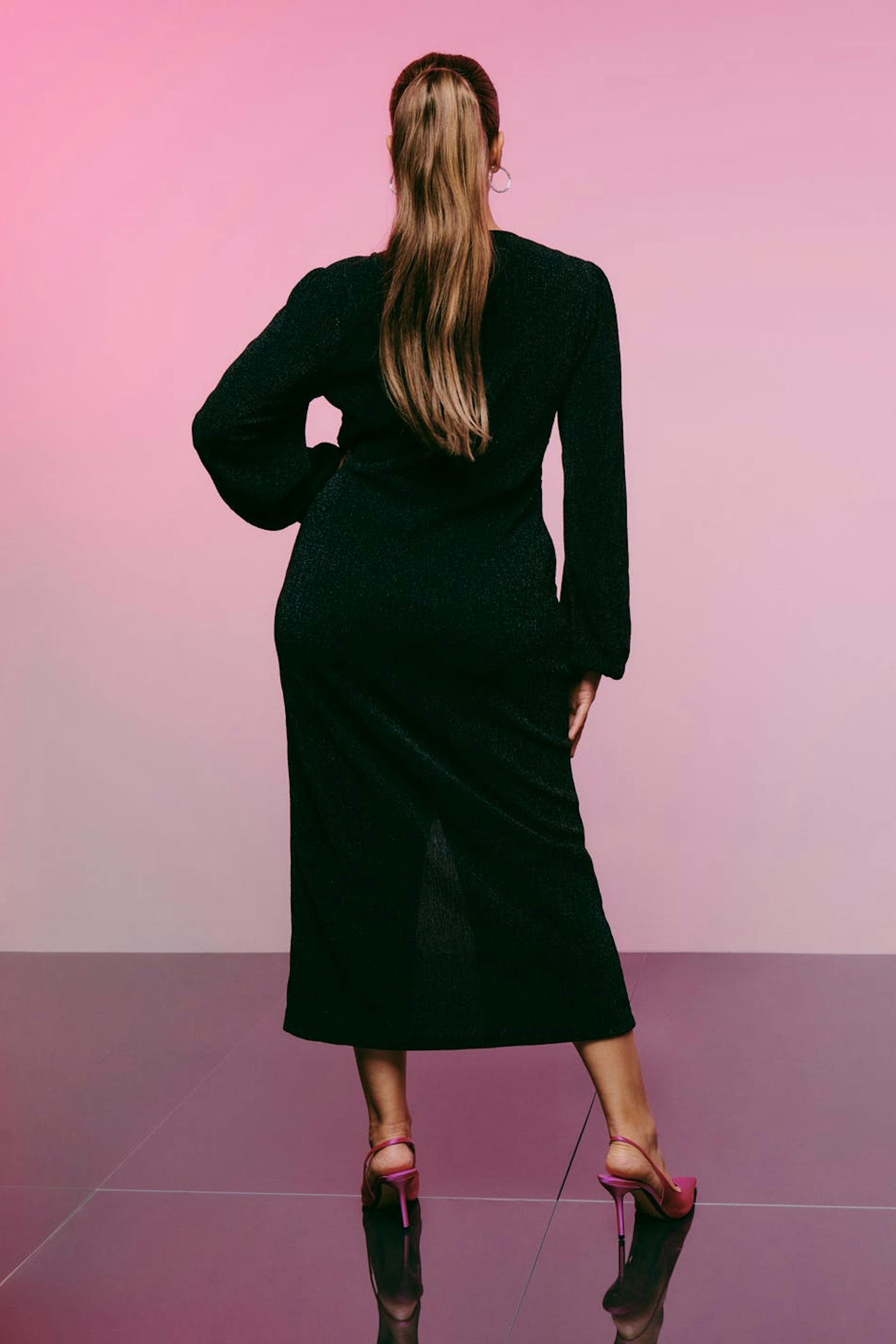 Långärmad glitterklänning med knappar längs framsidan. Klänningen är svart och har en stretchig kvalitet. Den har v-ringning, resårärmslut och en midilängd.