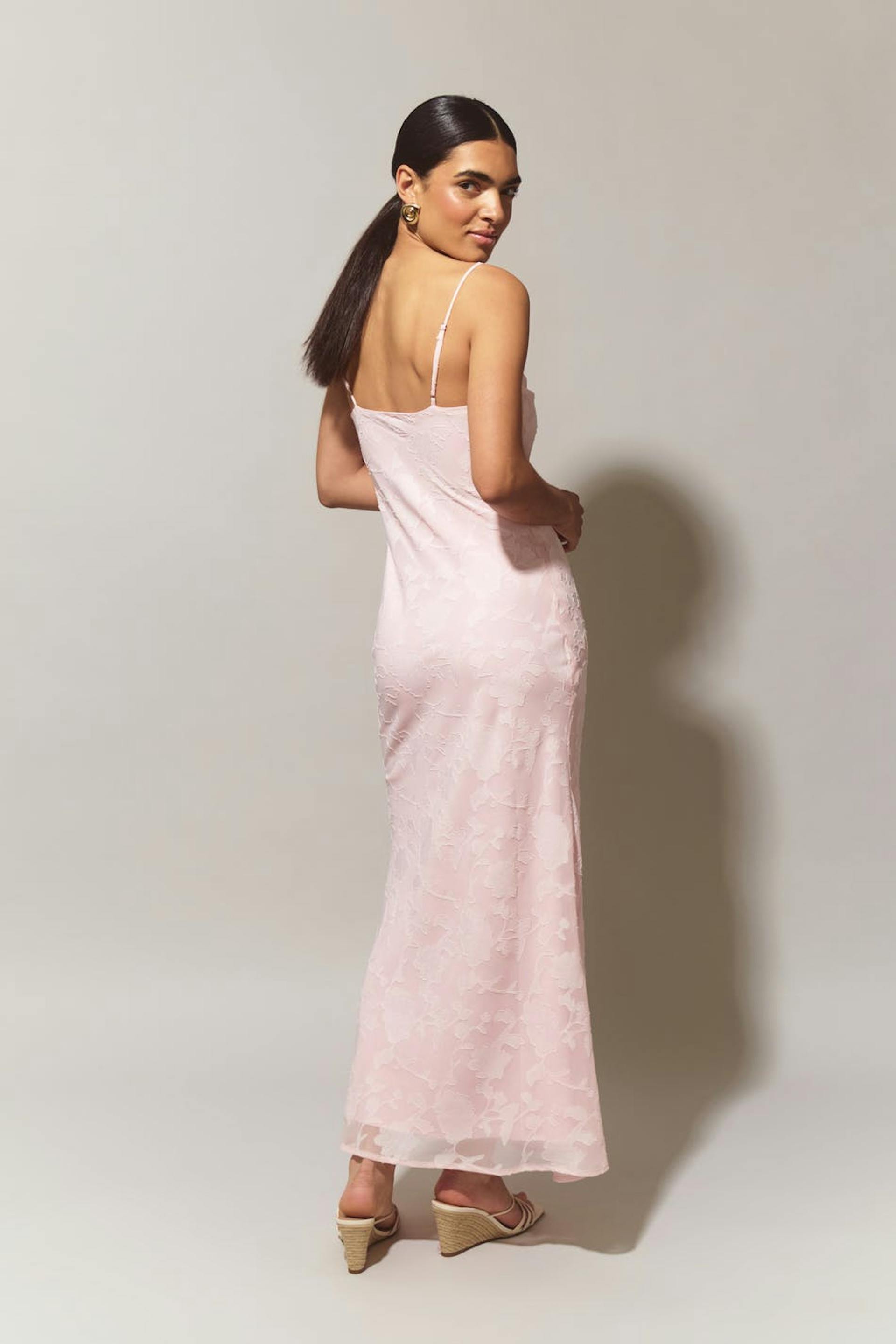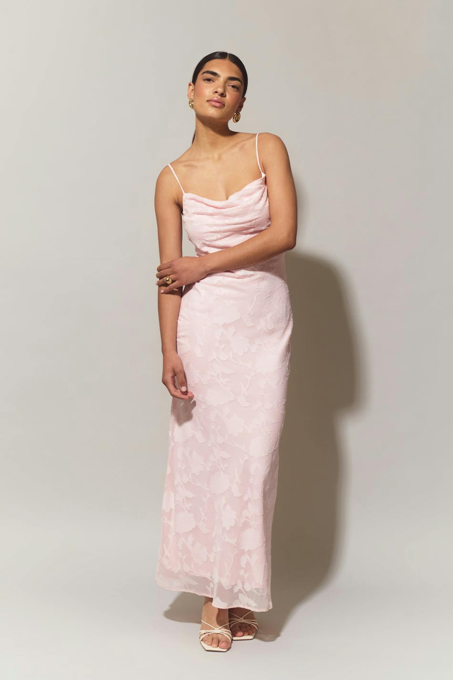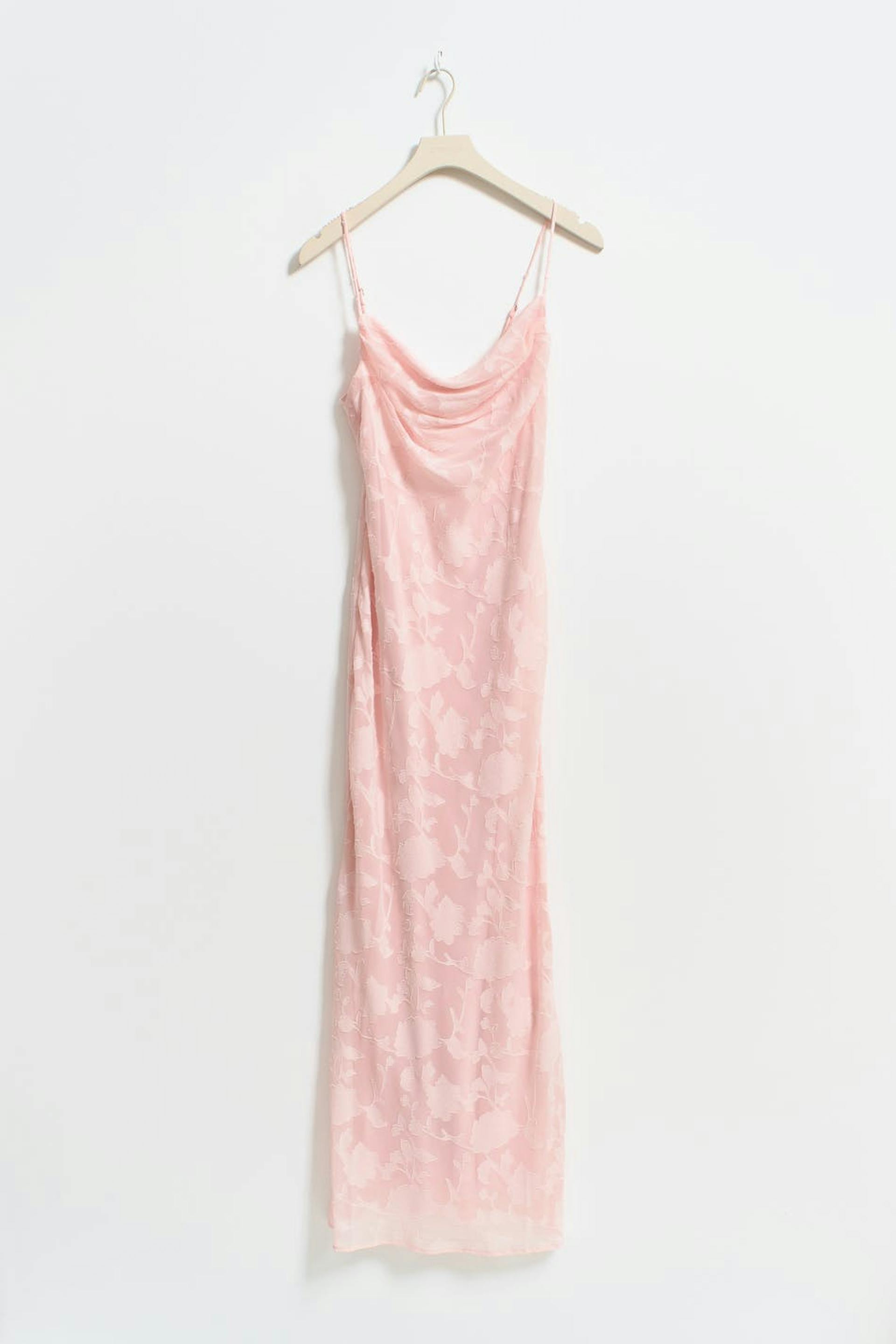 Blommig långklänning med draperad halsringning. Klänningen är rosa, ärmlös och fodrad. Den har reglerbara axelband och normal passform.