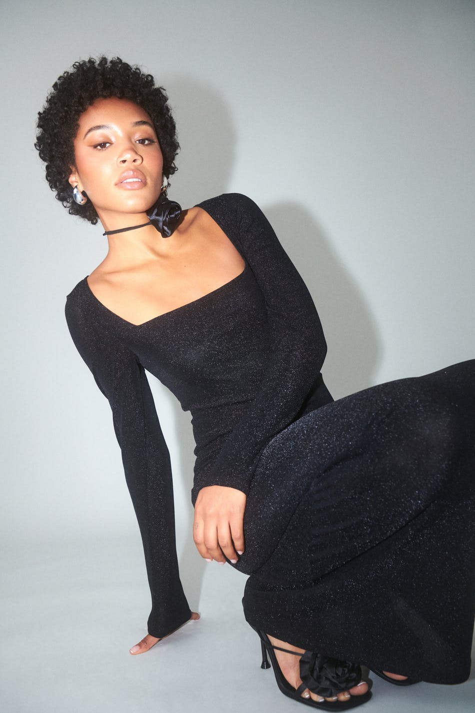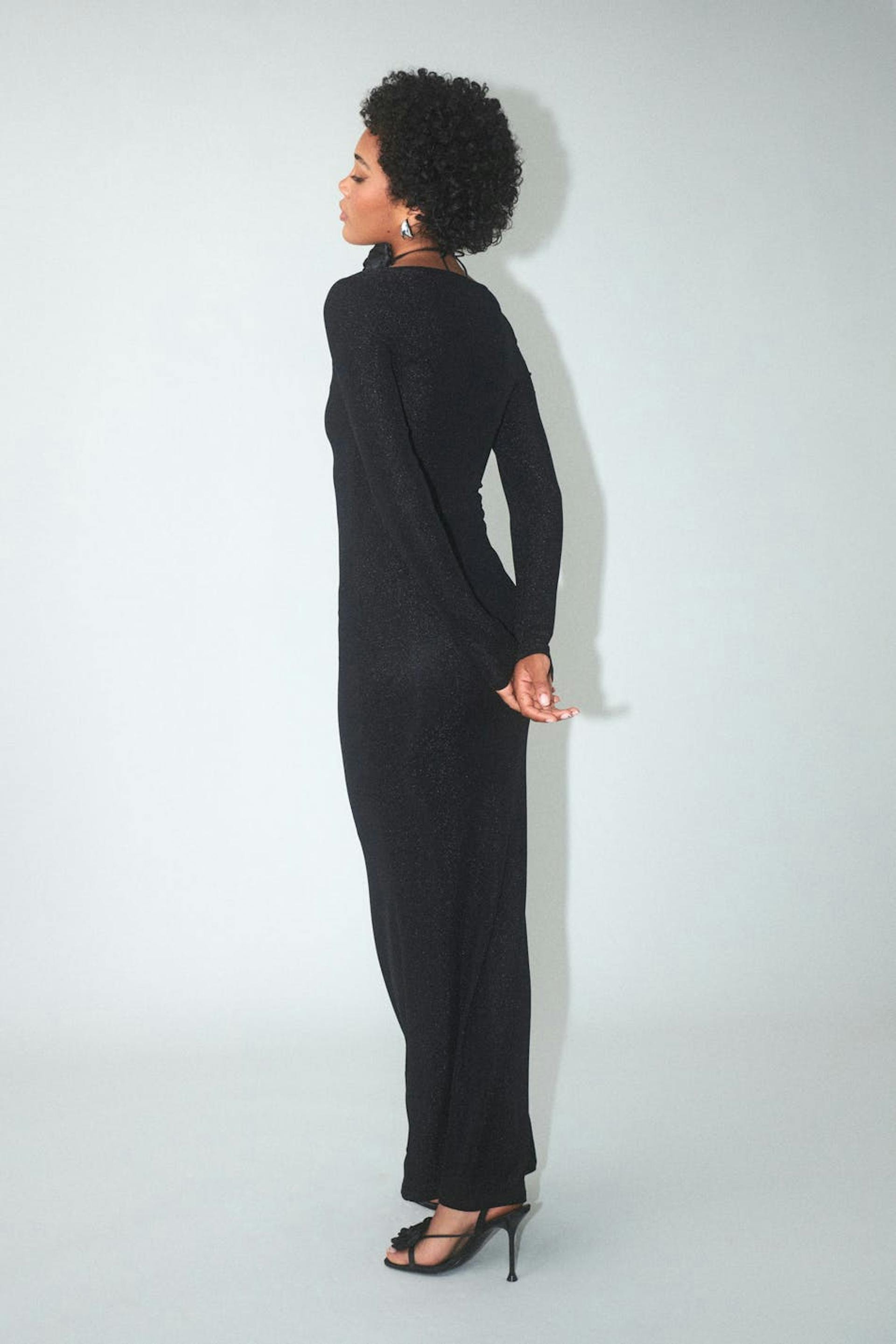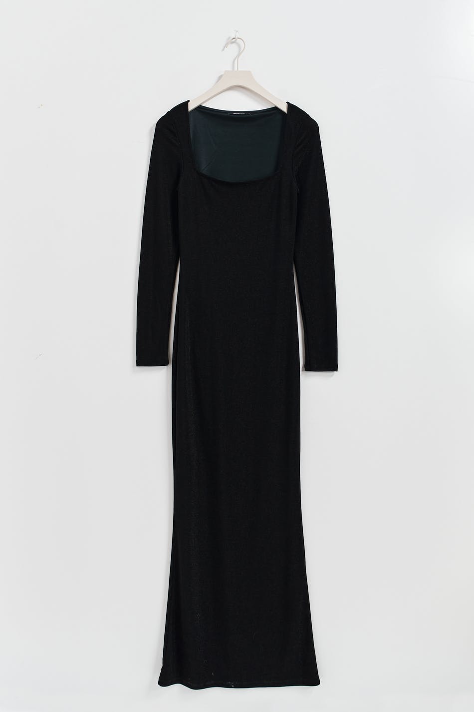 Glittrig klänning med fyrkantig halsringning. Klänningen är svart, stretchig och långärmad. Den har figurnära passform och maxi-längd.