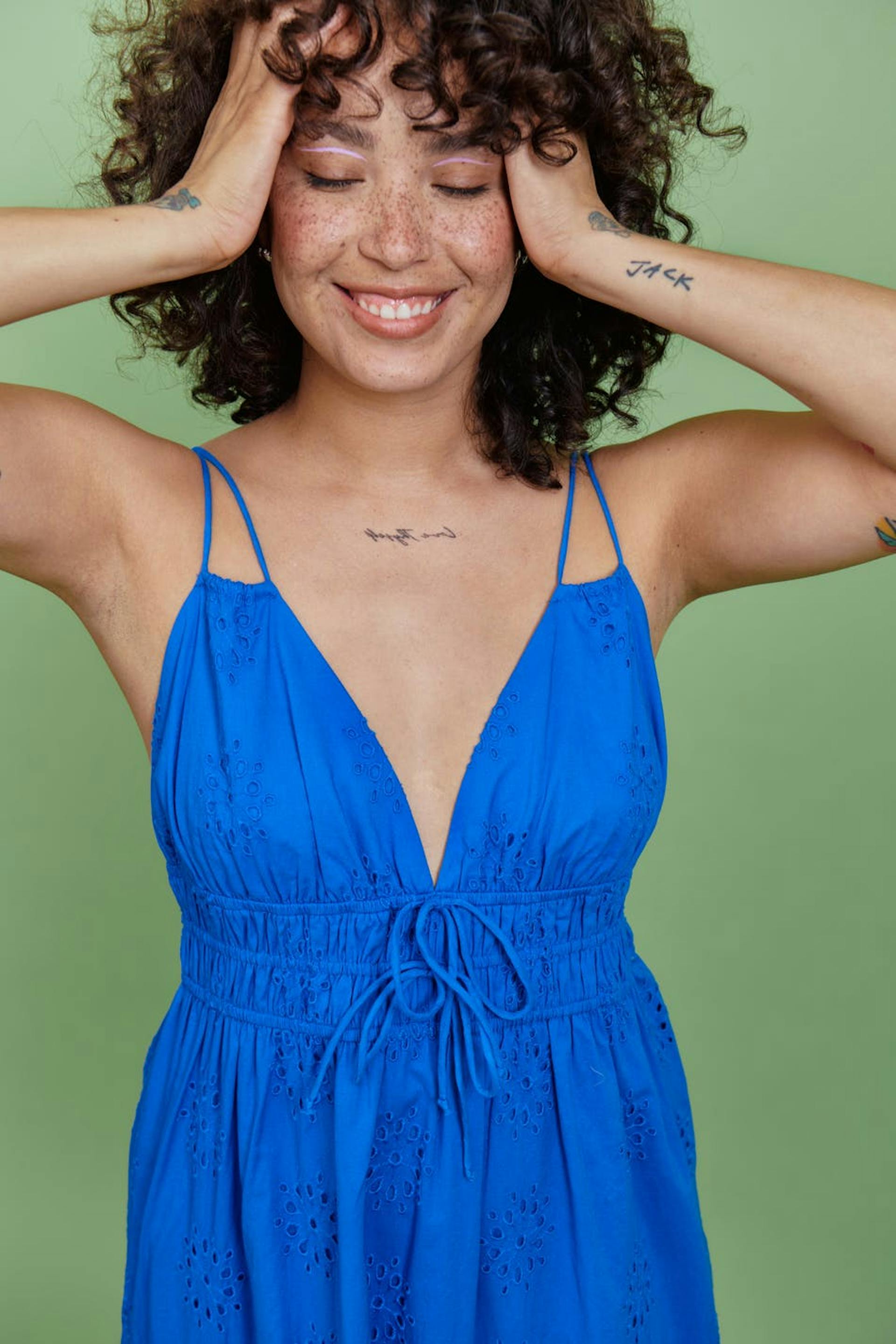 Ärmlös maxiklänning med v-ringning. Klänningen är blå och har dubbla axelband. Den har knytdetalj framtill, resår i midjan och volang i nederkant.