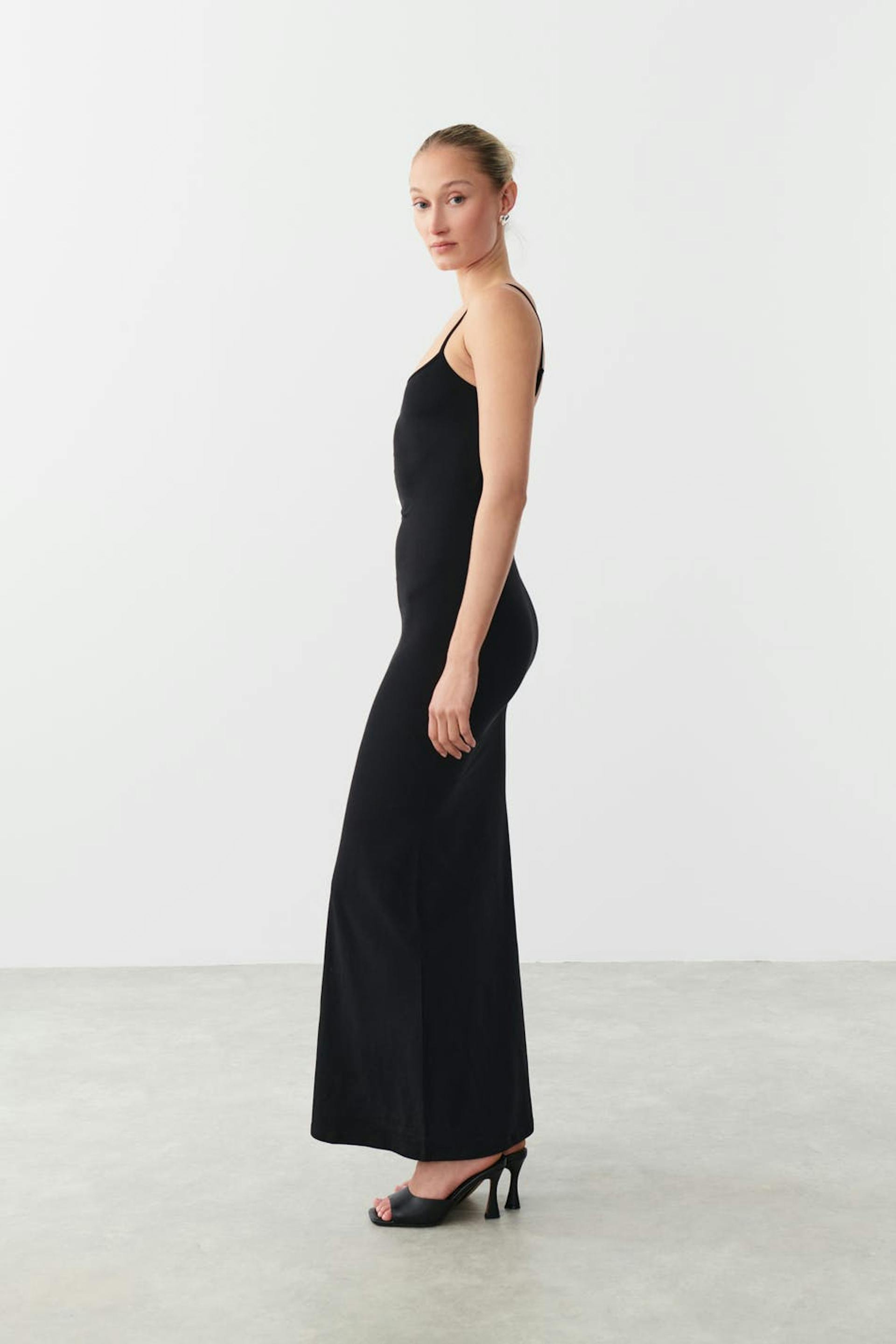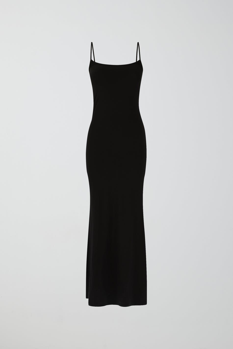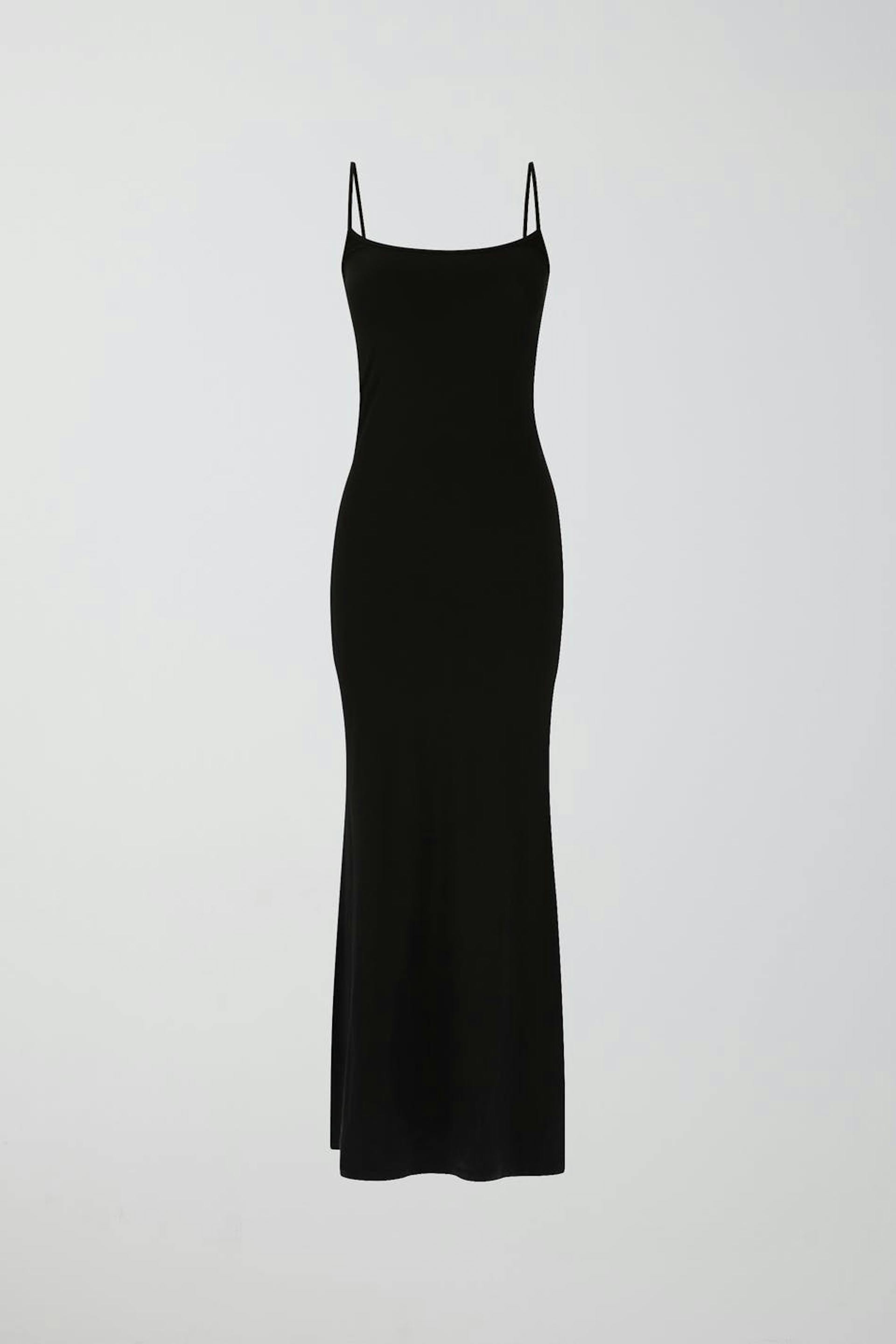 Ärmlös långklänning i trikå med tunna axelband. Klänningen är svart och har figurnära passform med lätt utsvängd kjol.