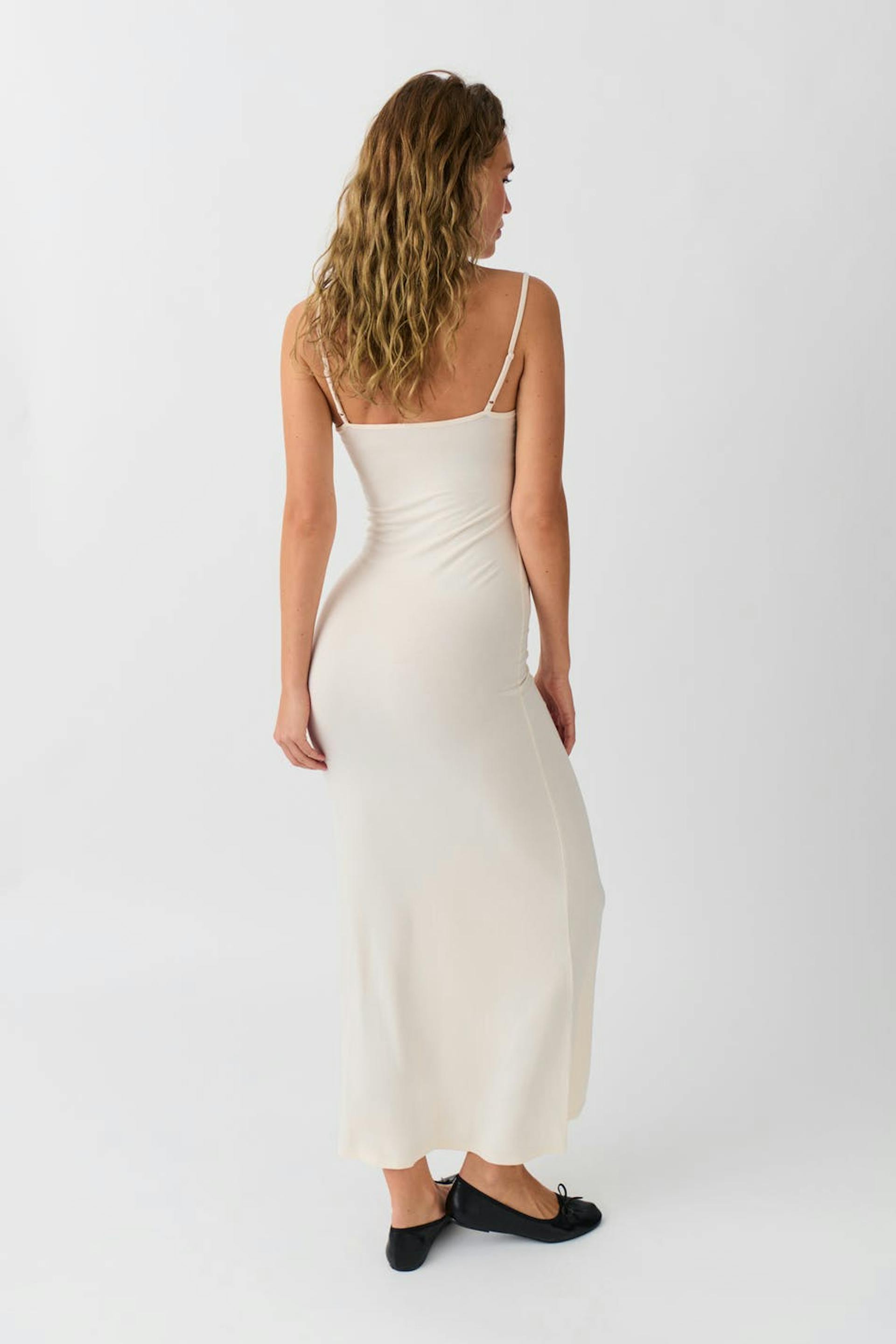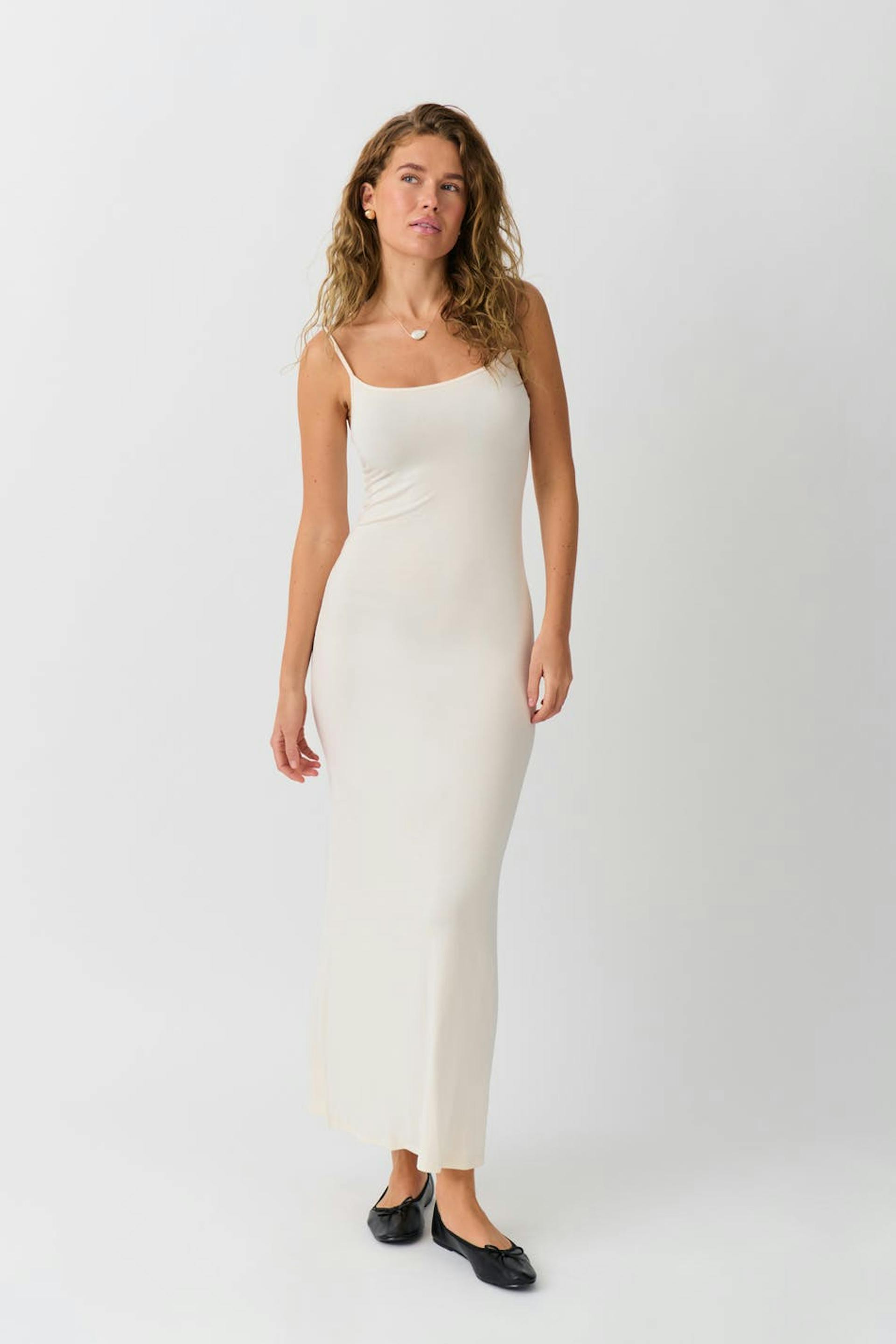 Soft touch – second skin comfort. Ärmlös långklänning med figurnära passform. Klänningen är vit, lång och stretchig. Den har smala, reglerbara axelband och utställd nederkant.