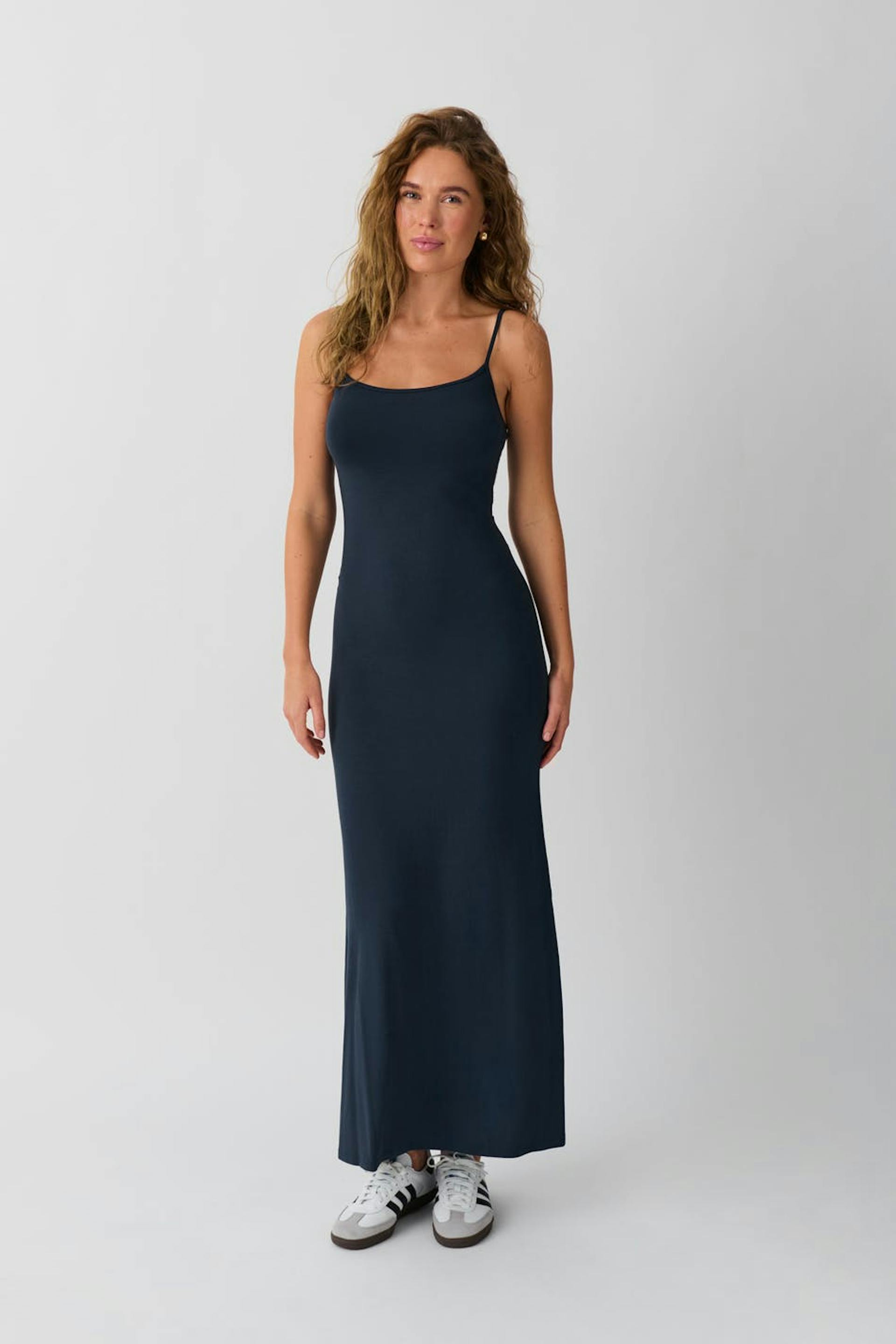Soft touch – second skin comfort. Ärmlös långklänning med figurnära passform. Klänningen är svart, lång och stretchig. Den har smala, reglerbara axelband och utställd nederkant.