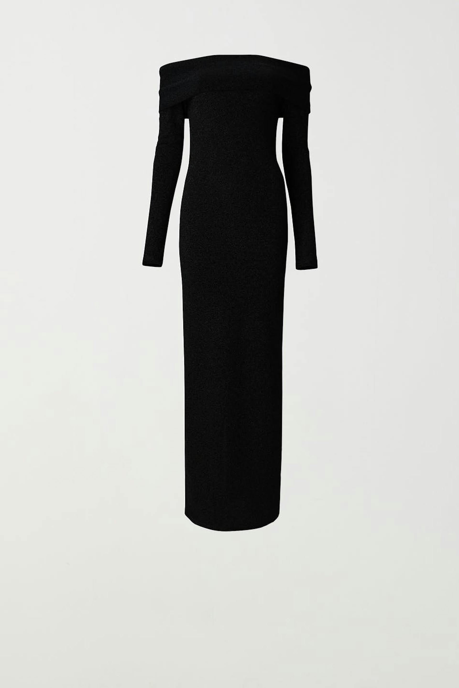 Långärmad off shoulder-klänning med slits bak. Klänningen är svart, glittrig och lång. Den har figurnära passform och en skir, stretchig kvalitet.