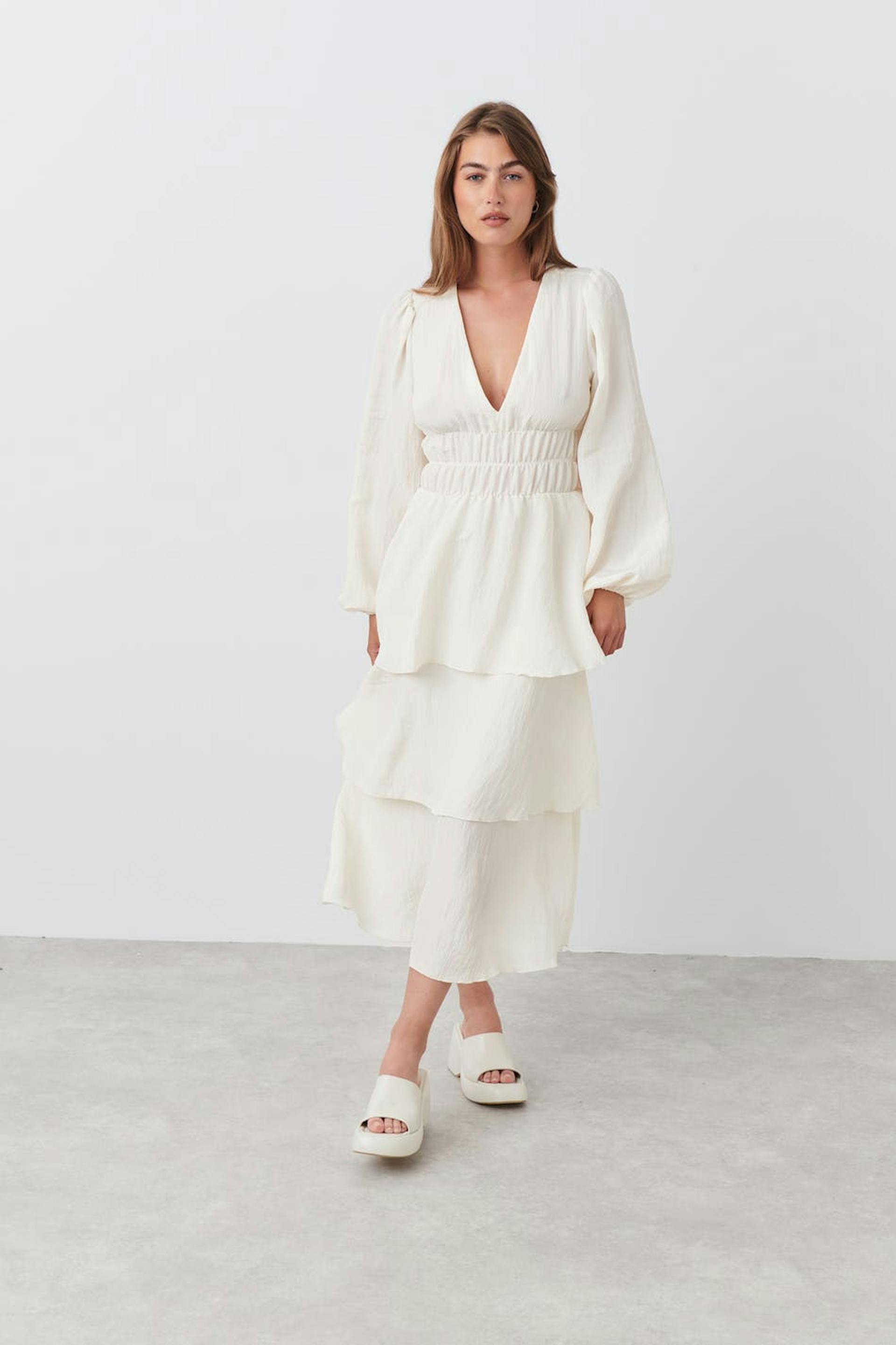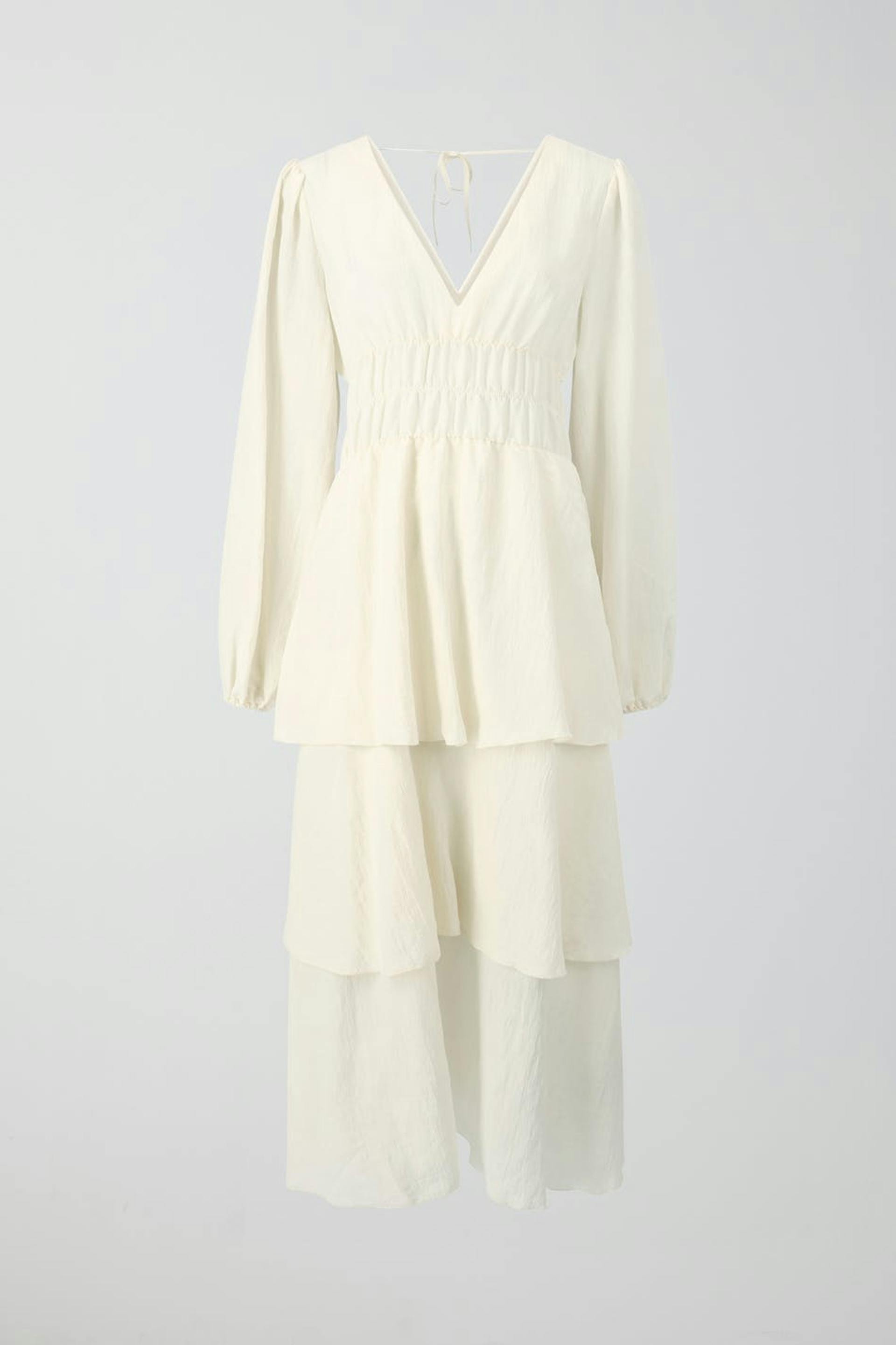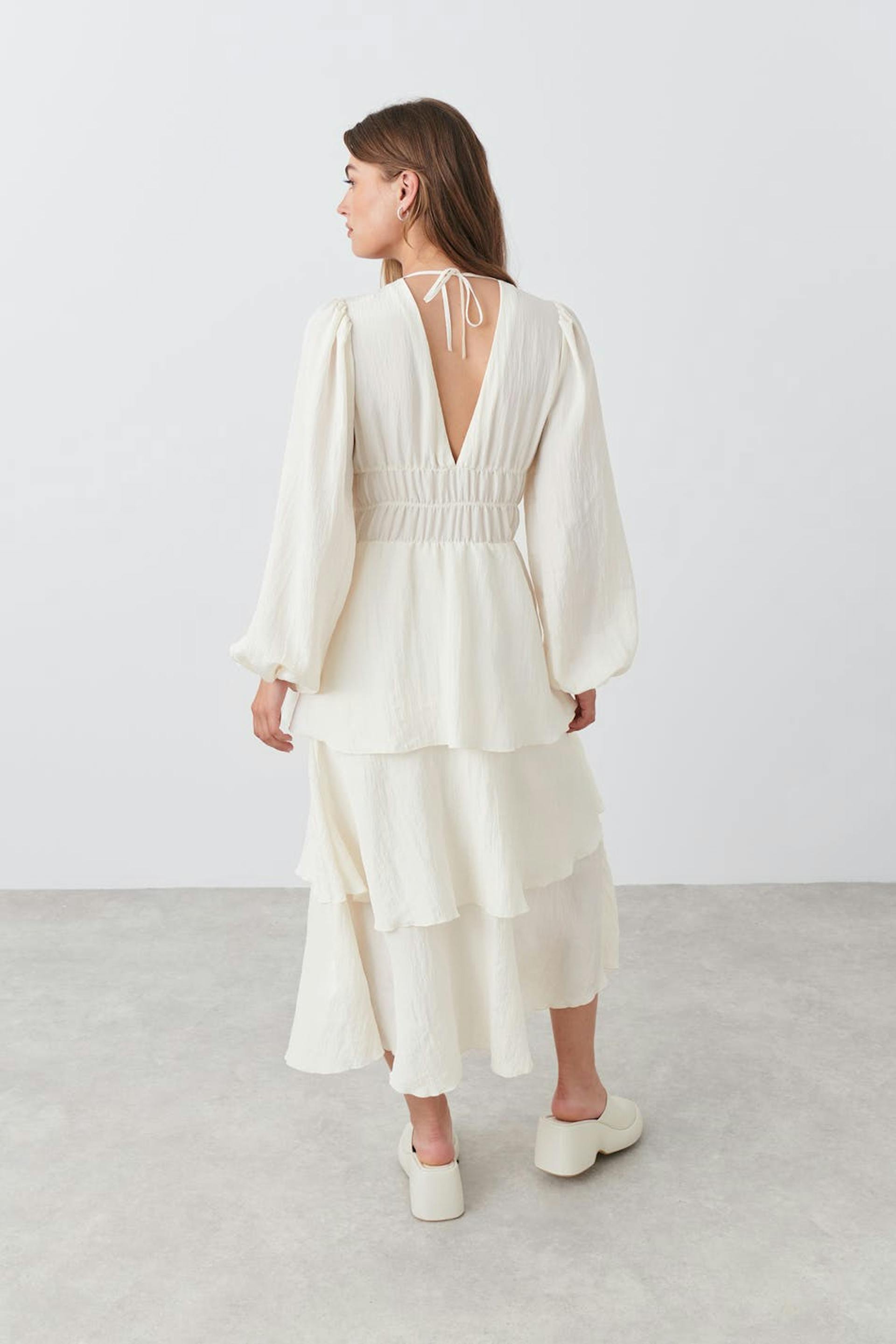 Långärmad volangklänning med djup v-ringning fram och bak. Klänningen är vit och har knytdetalj i ryggen. Den har resår i midjan, volanglager, rynkningar kring axlarna och resårärmslut.