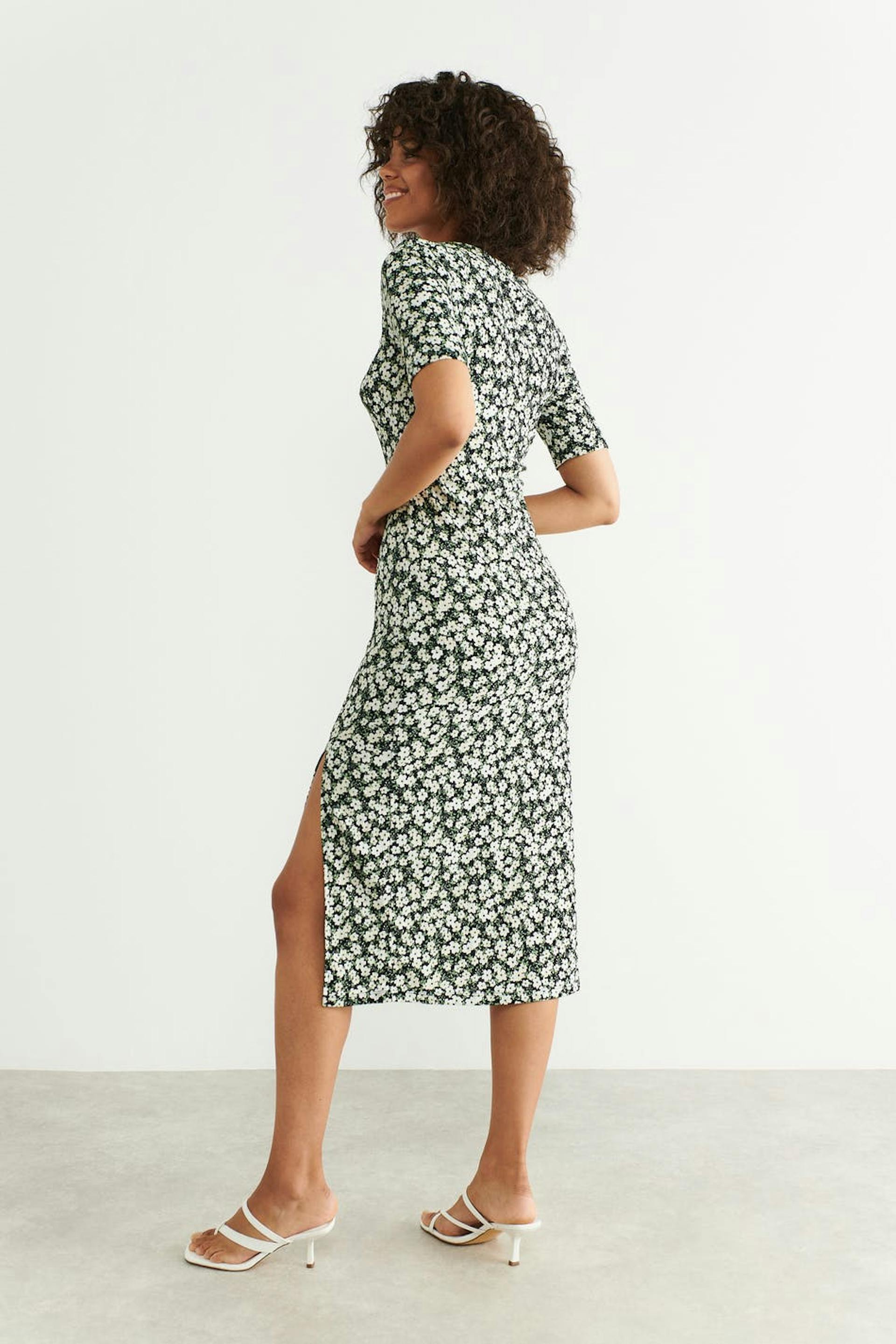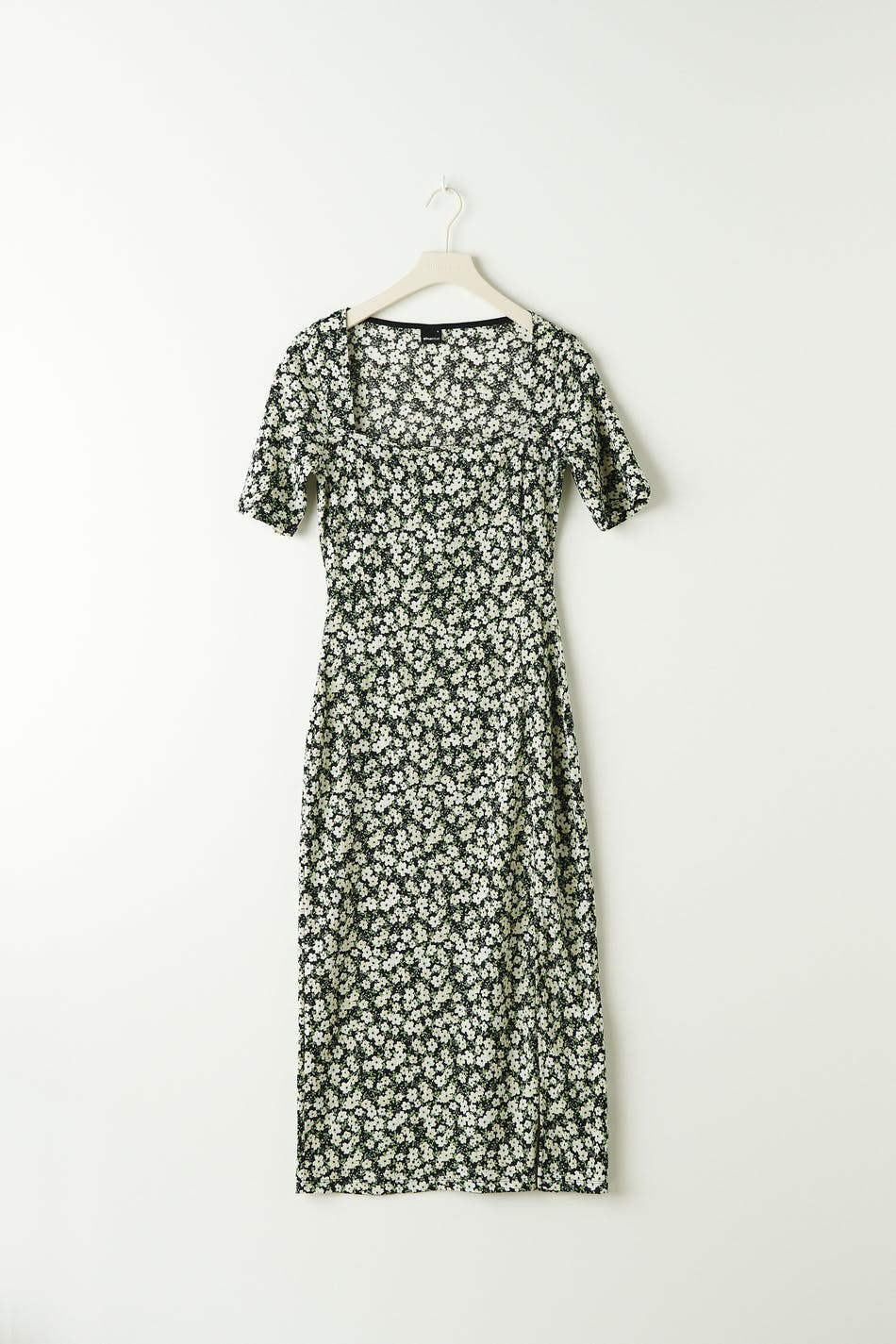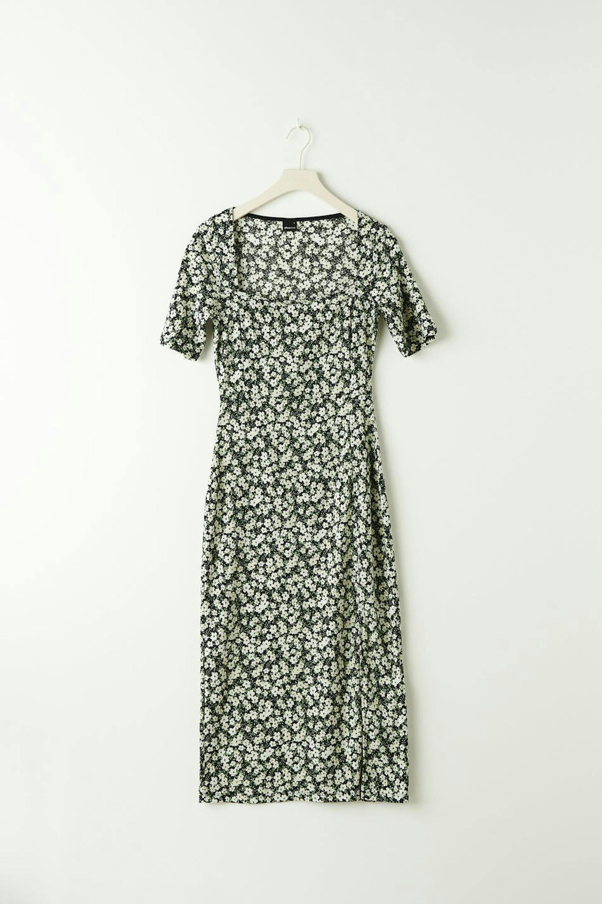 Midiklänning i trikå med fyrkantig halsringning. Klänningen har en slitsdetalj.