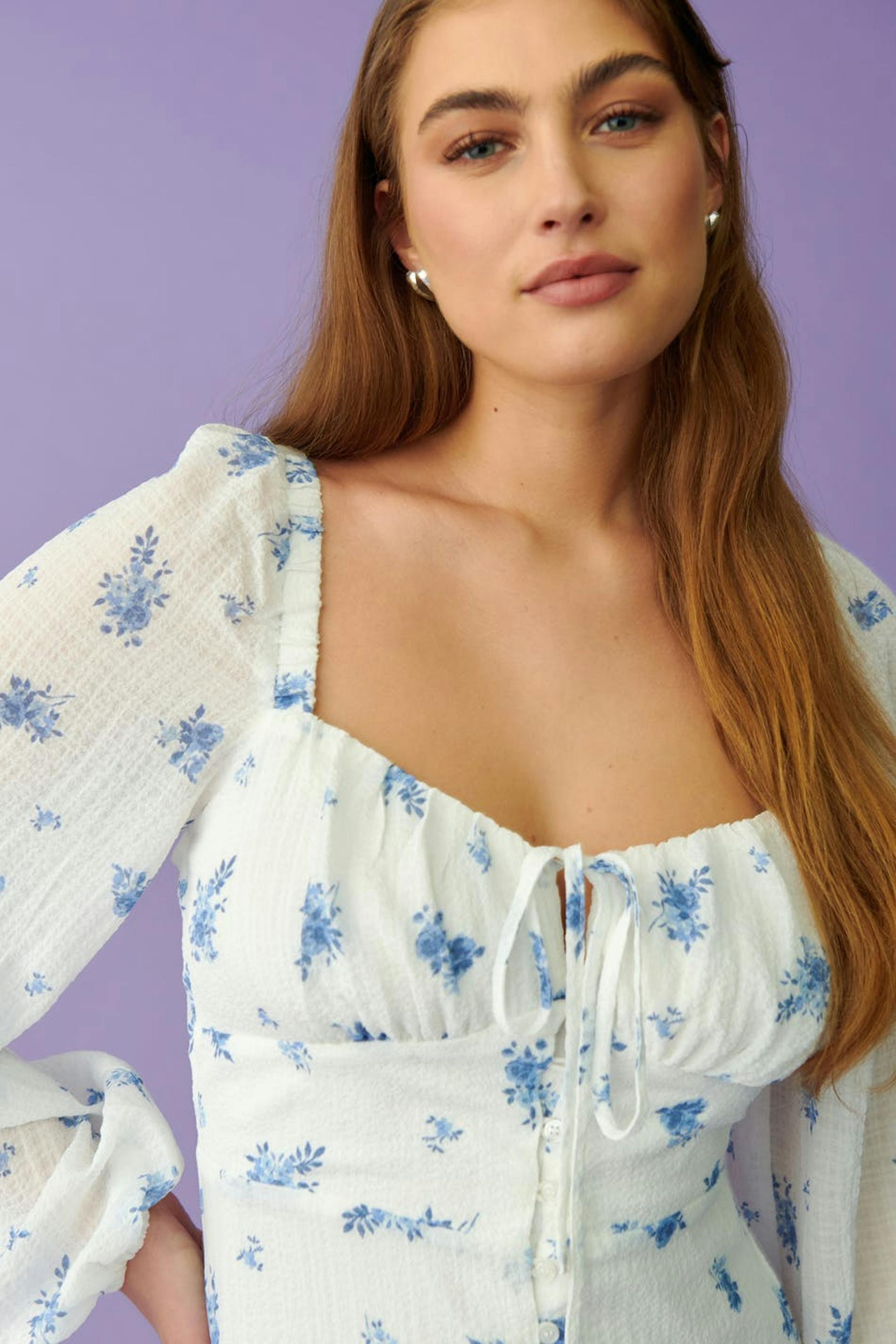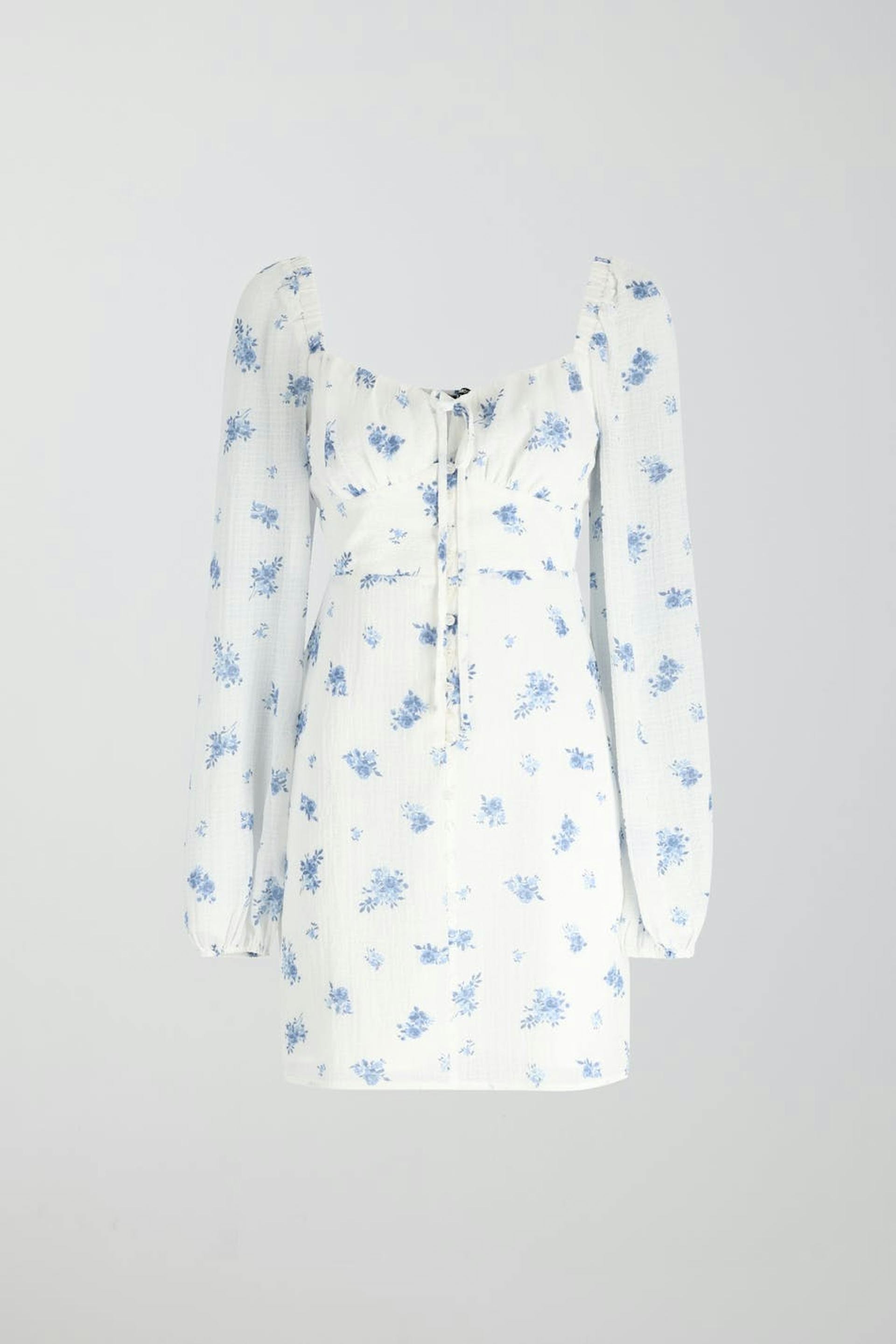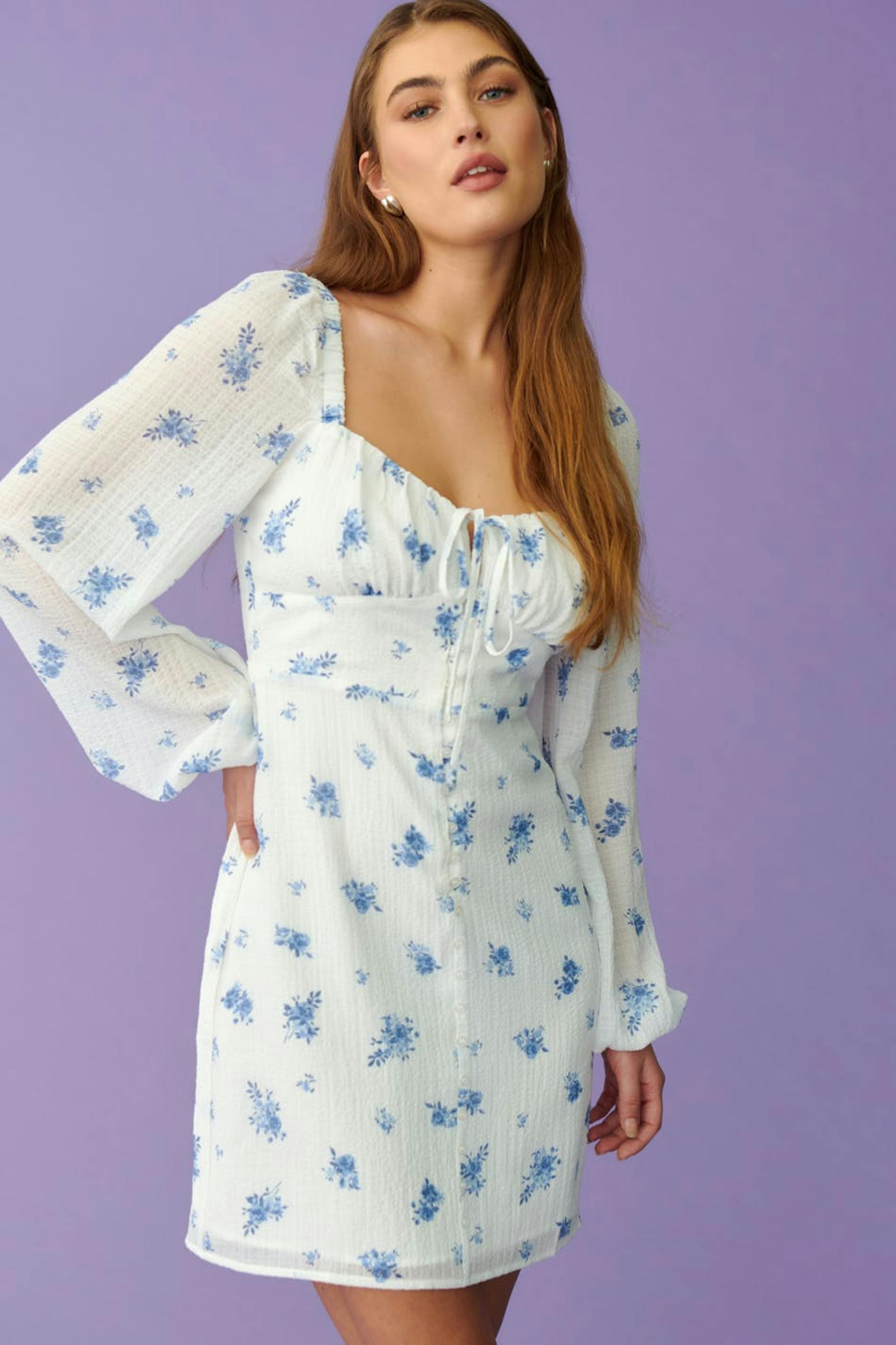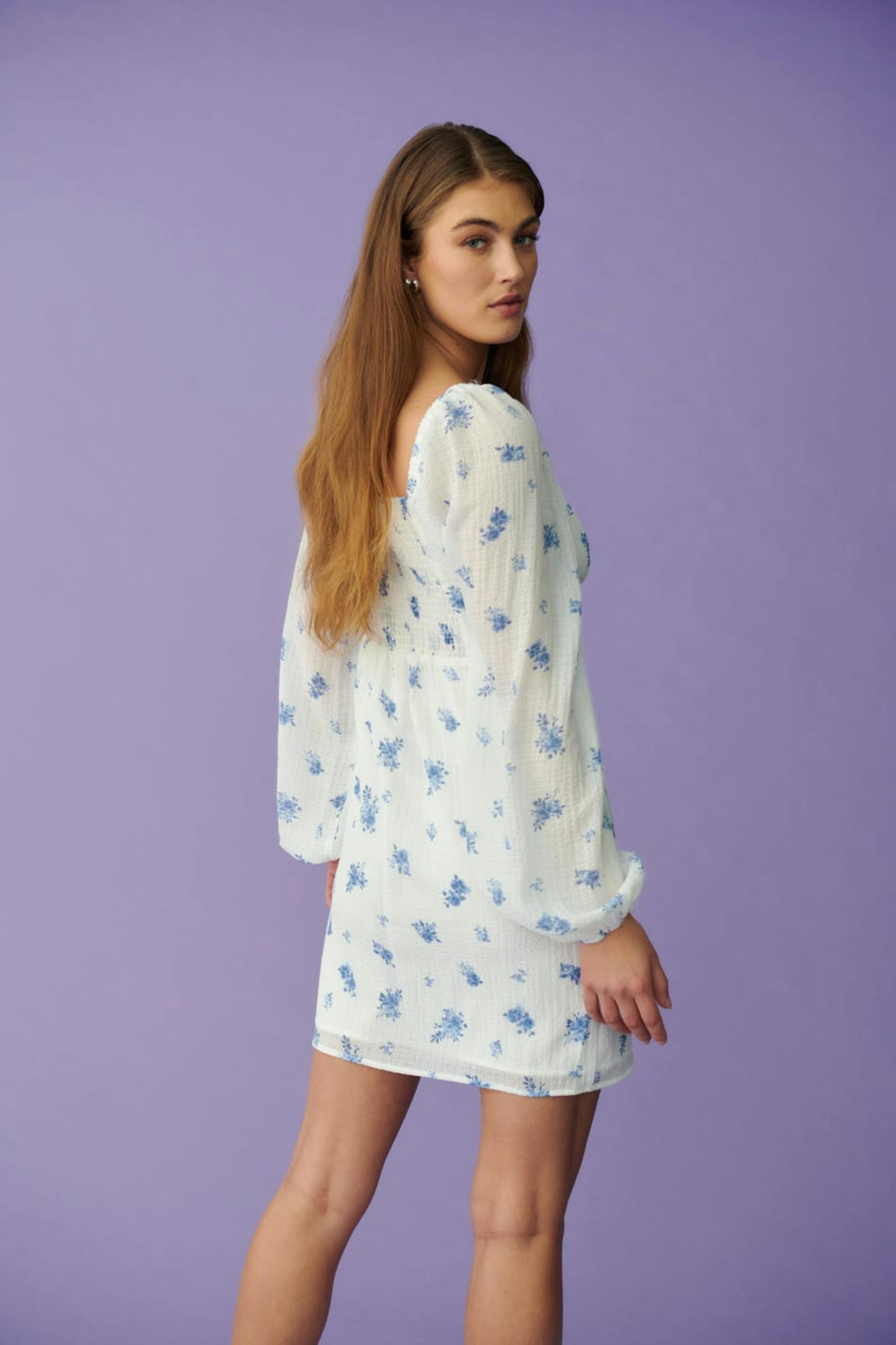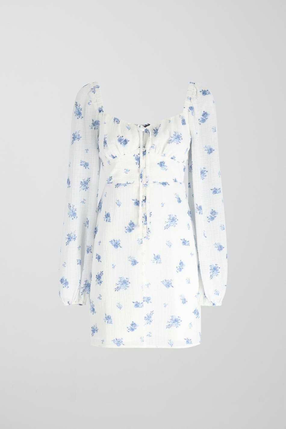 Blommig klänning i bäckebölja med knappar längs framsidan. Perfekt för festen, blå, långärmad och kort. Den har ett strukturerat material, rynkad byst, knytdetalj framtill, puffärmar och smock i ryggen.