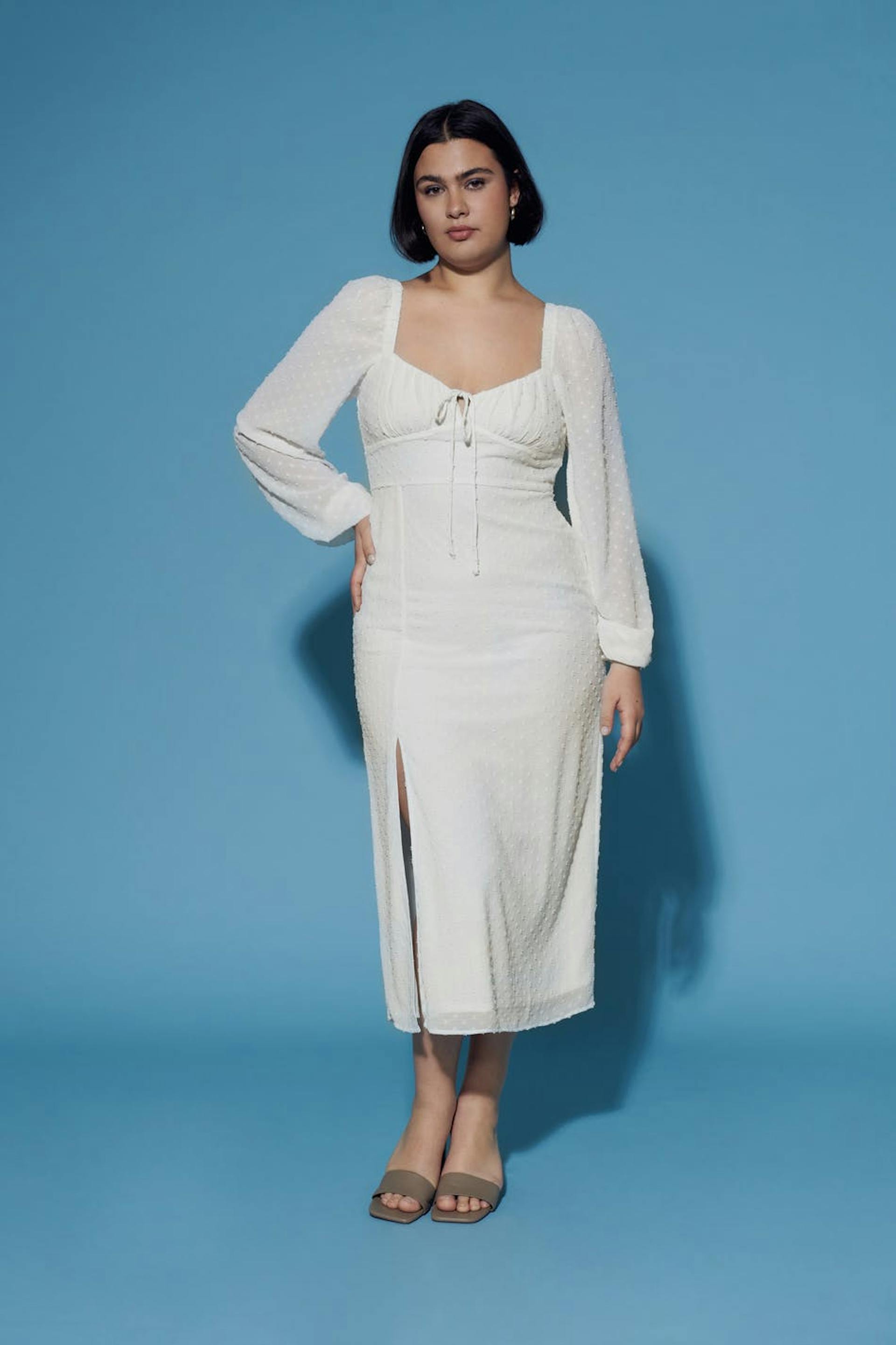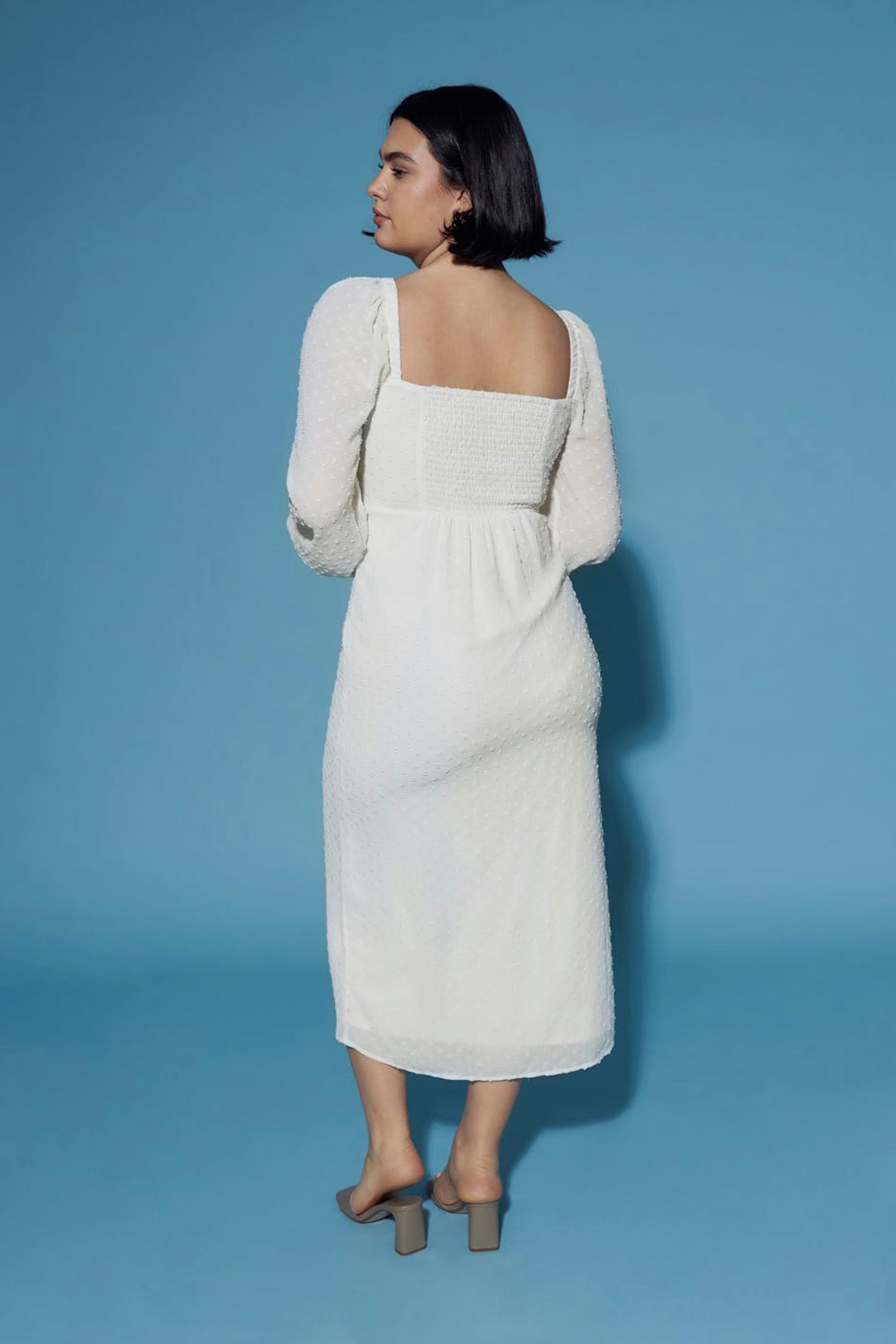 Långärmad midiklänning med slits fram. Klänningen är perfekt för festen, vit och prickig. Den har rynkad byst, smock bak, figurnära passform i midjan och vid bysten, dragkedja i sidosömmen och knytdetalj framtill.