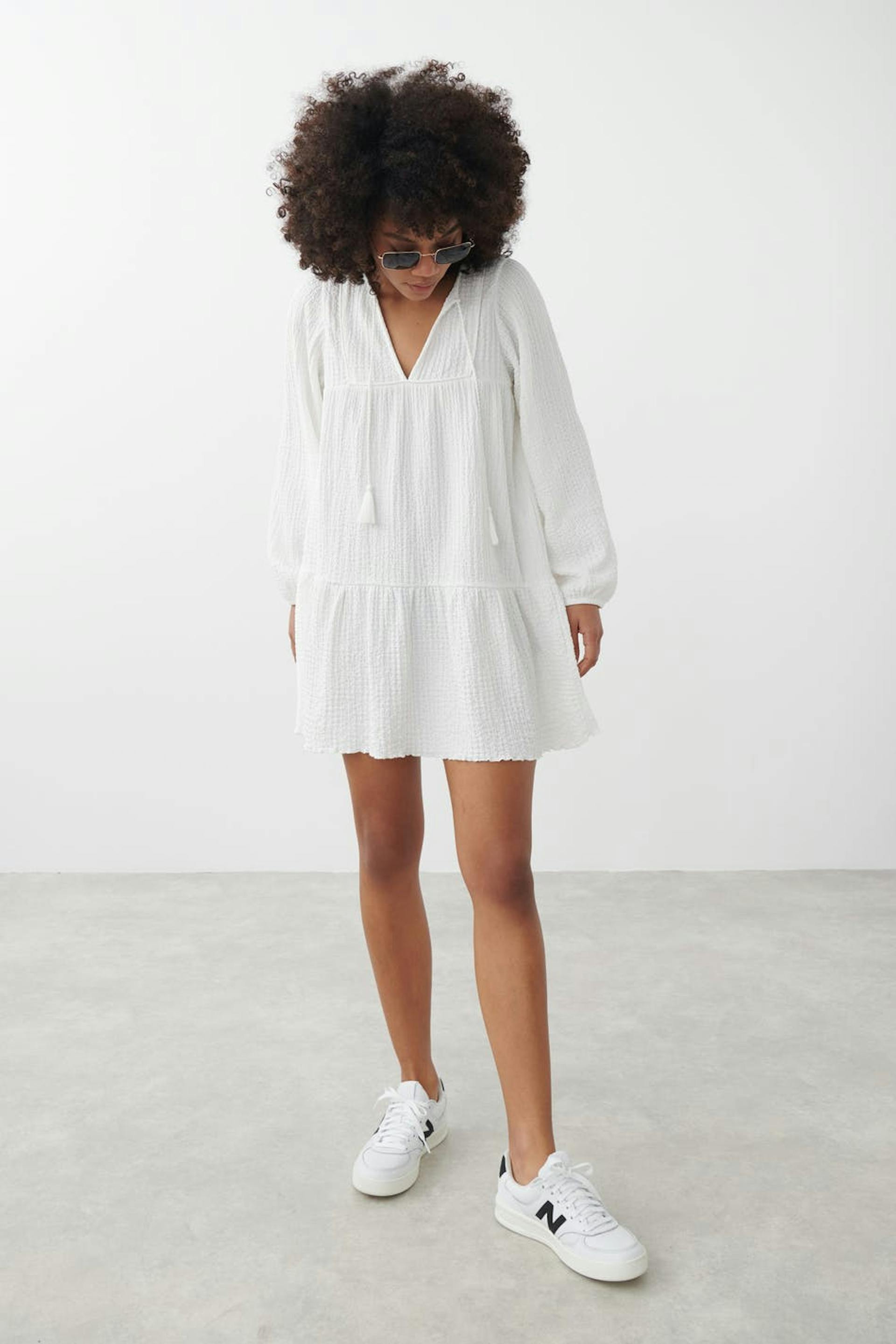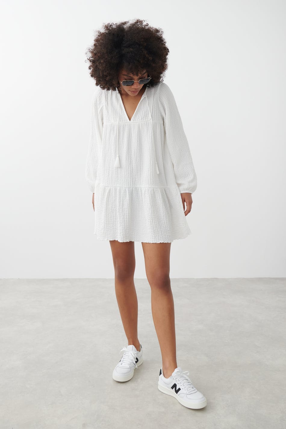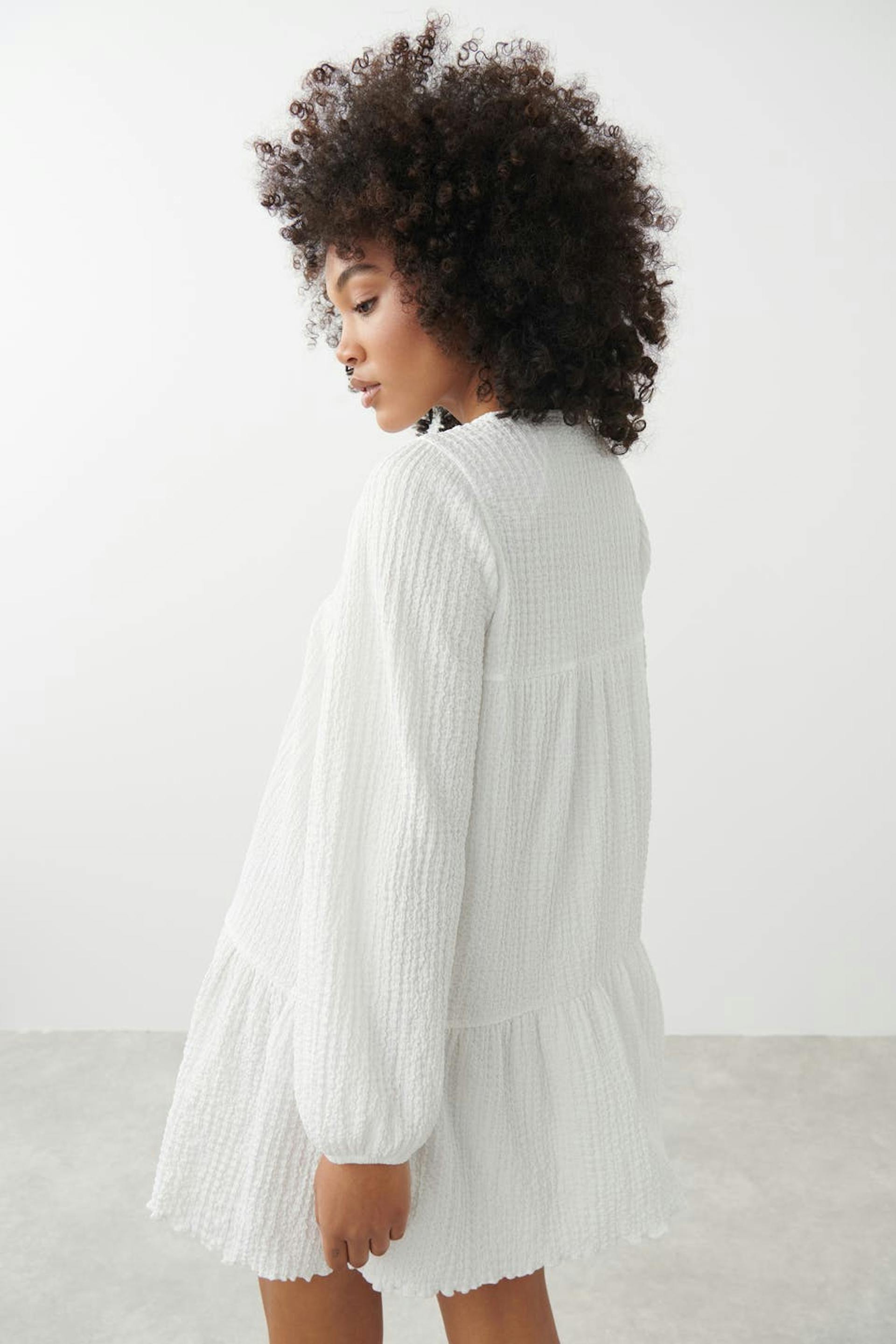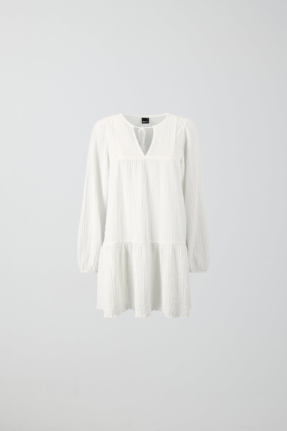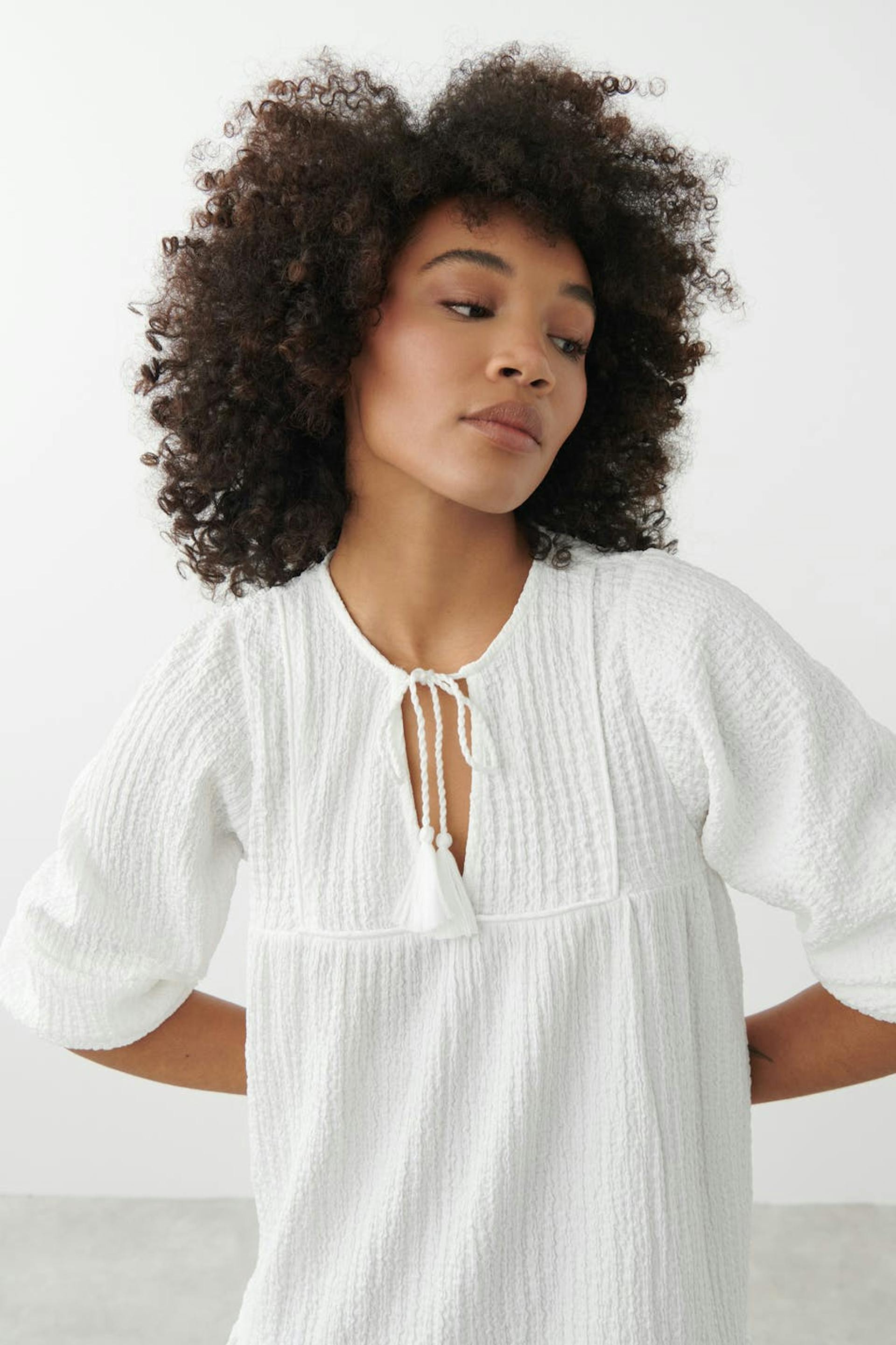 Vid klänning med oversize fit. Klänningen är vit och kort och har fluffiga, långa ärmar. Den har en knytning vid halsen och ett texturerat material.