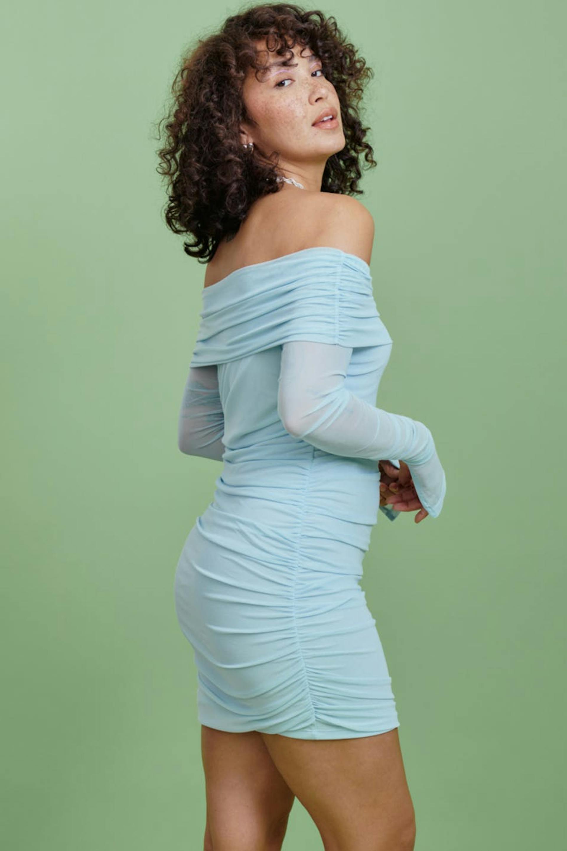 Kort off shoulder-klänning med stretchigt tyg. Klänningen är blå och har figurnära passform med rynkning på ärmarna och i sidorna. Den har långa ärmar med slits vid ärmsluten.