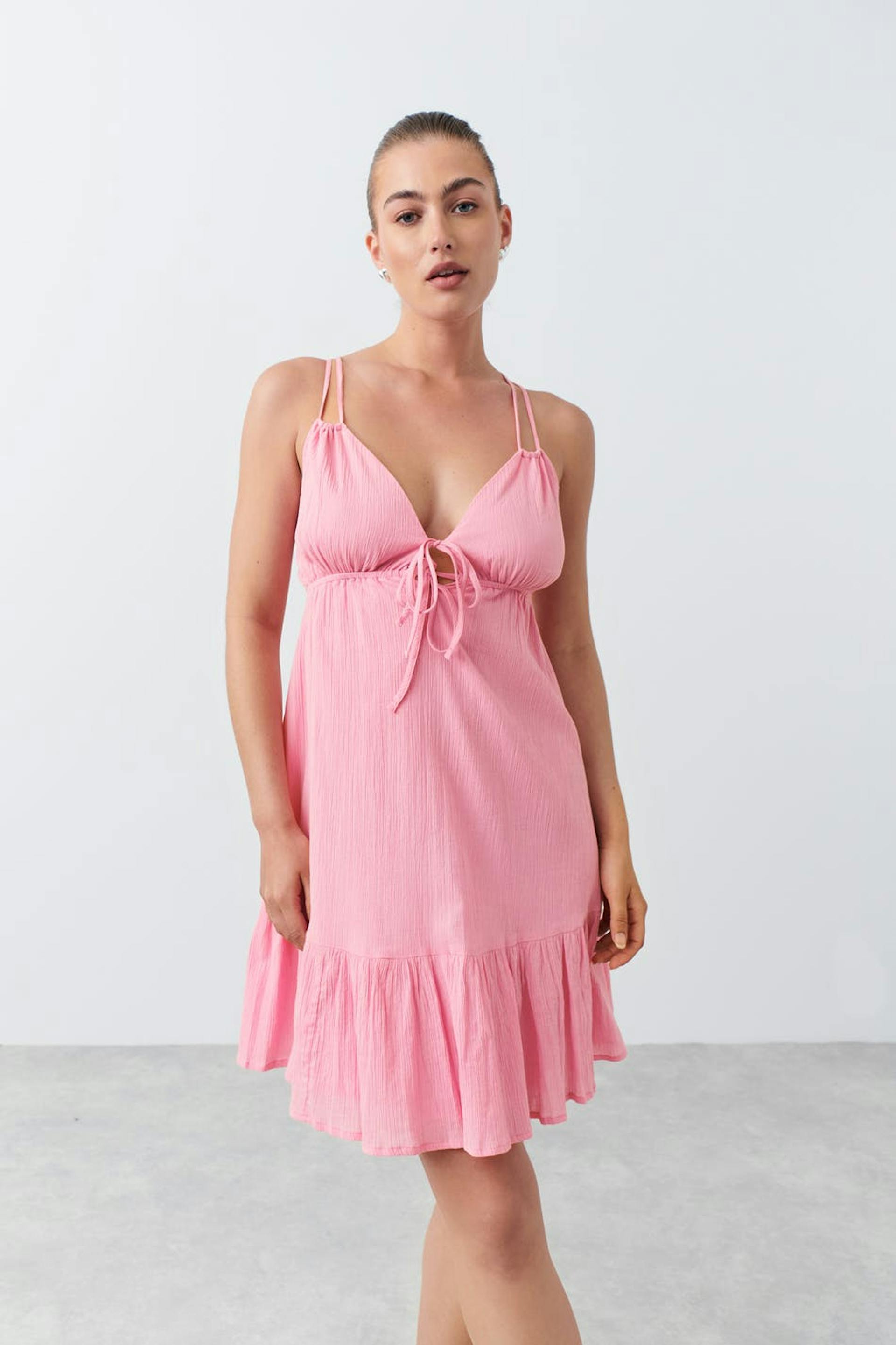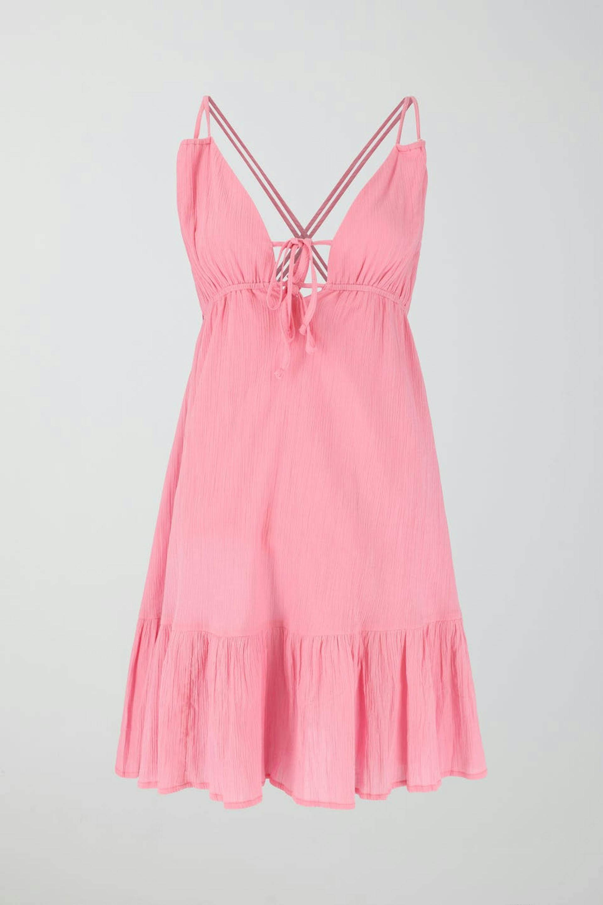 Ärmlös miniklänning med smala axelband som korsas i ryggen. Klänningen är rosa och har en krinklad bomullskvalitet. Den har knytdetalj framtill, rynkningar under bysten och volanger i nederkant.