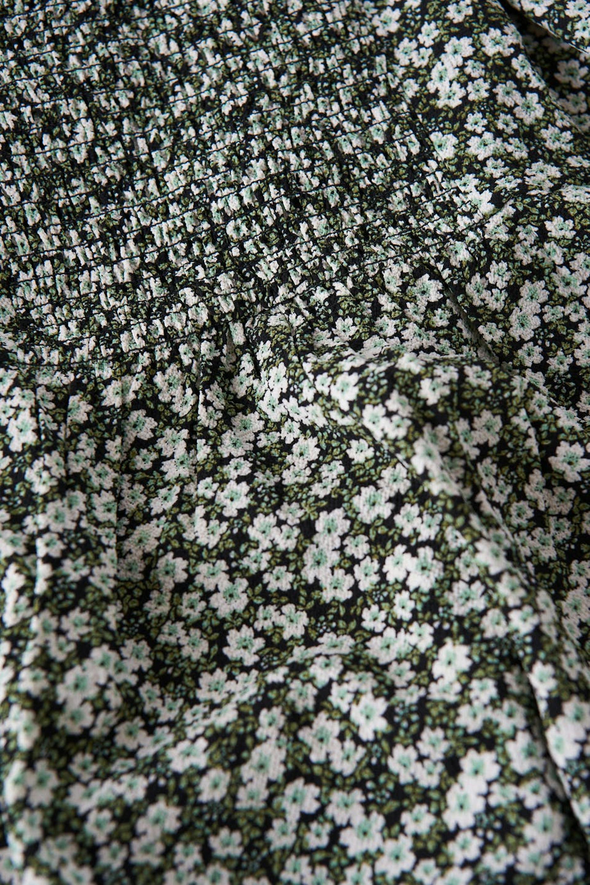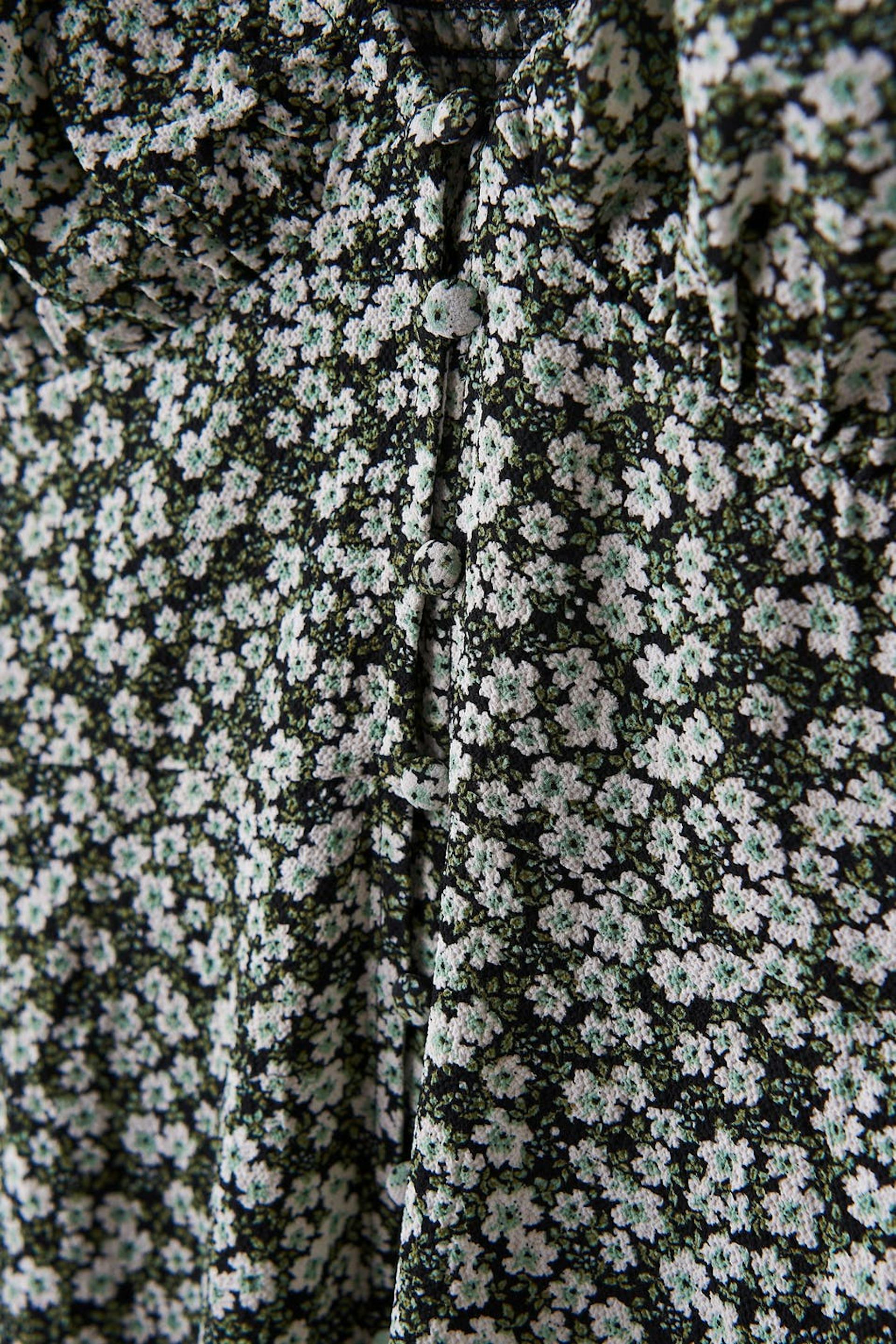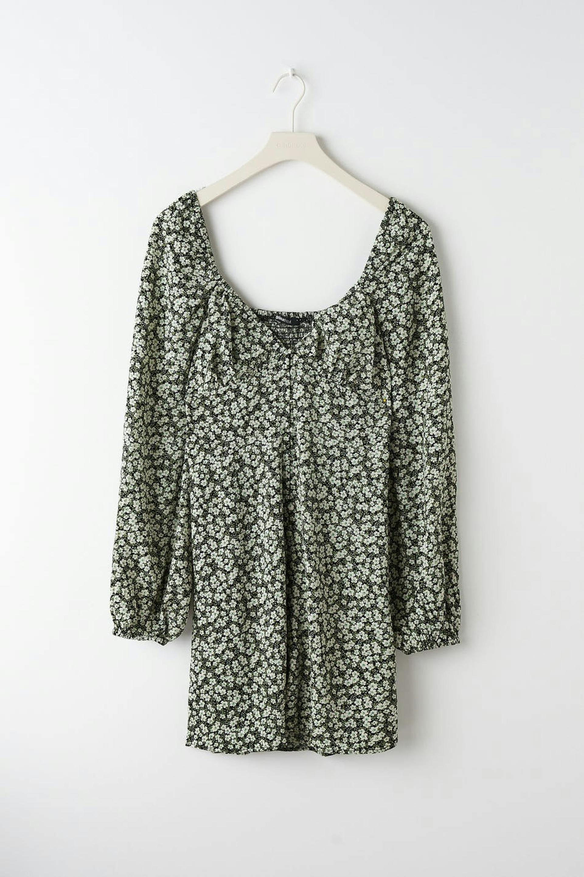 Långärmad miniklänning med knappar ner längs framsidan. Klänningen är grön och har v-ringning. Den har sömdetaljer under bysten, resårärmslut och smock i ryggen.