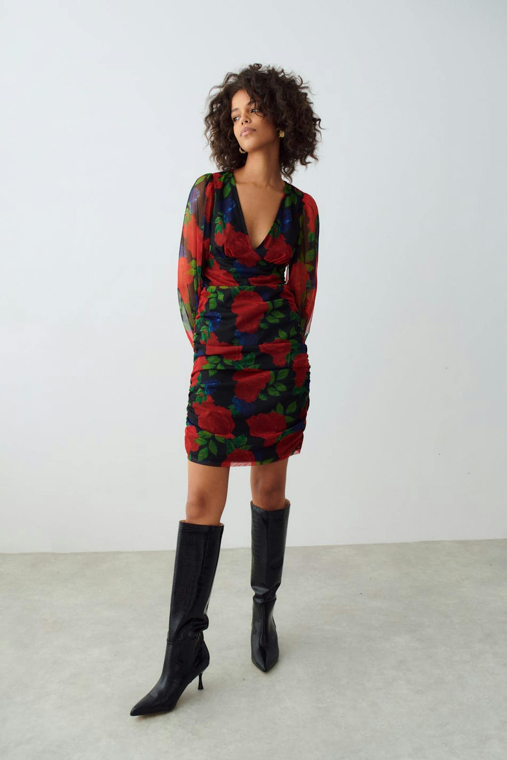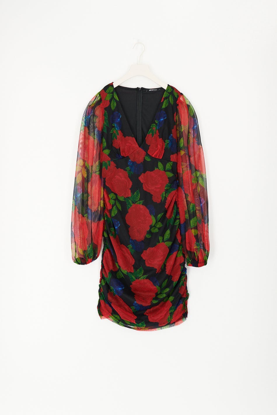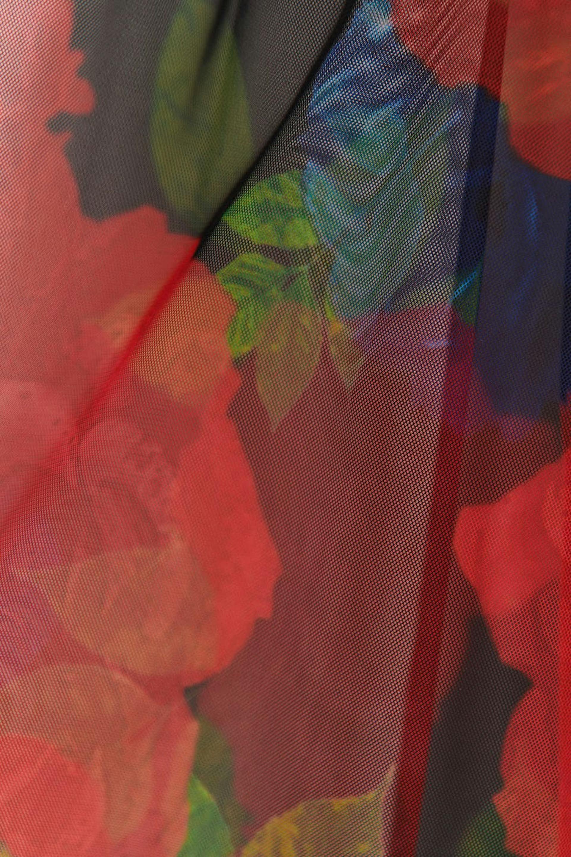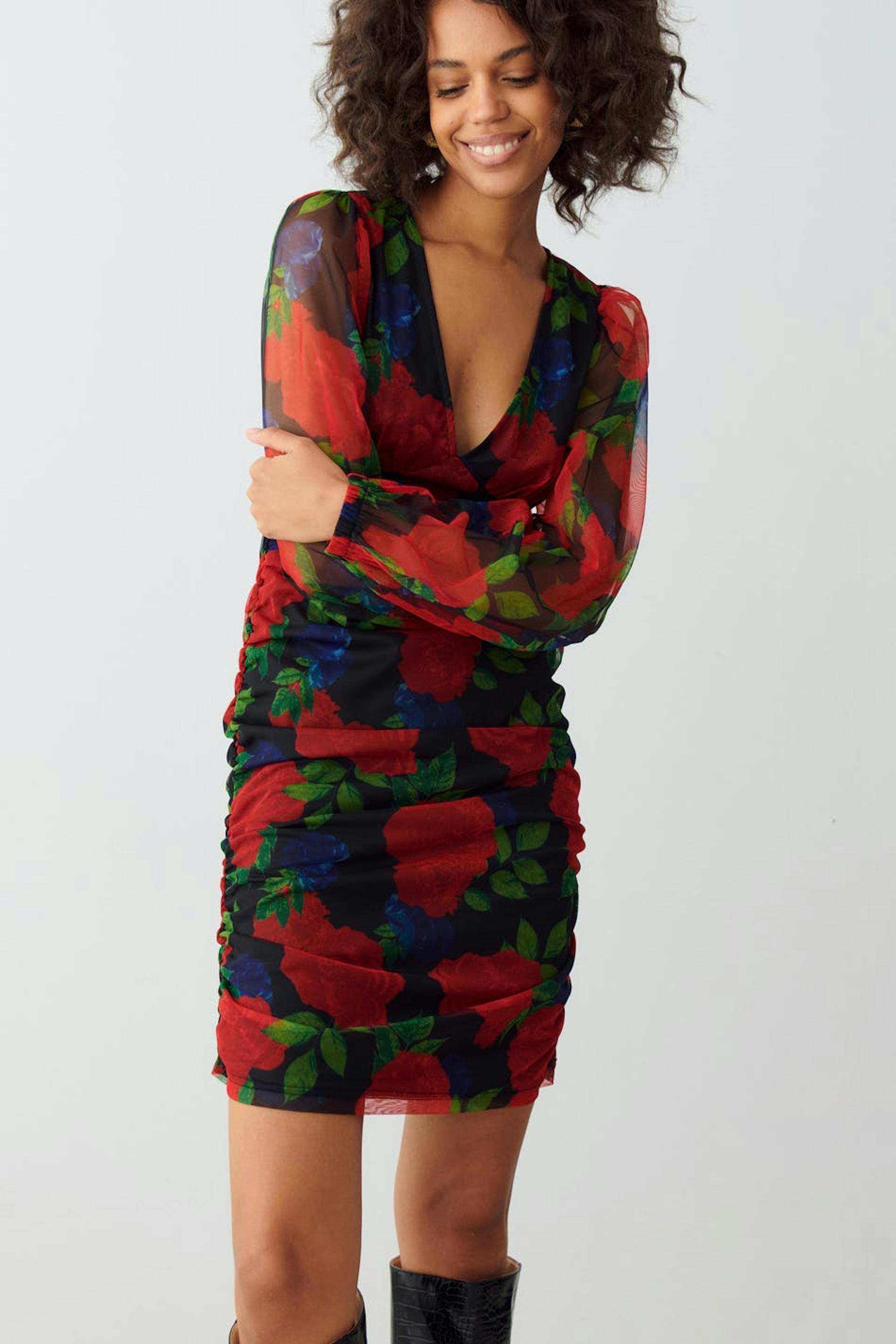 Blommig miniklänning i mesh med v-ringning. Klänningen är röd, kort och fodrad. Den har rynkad byst, långa puffärmar, dold ryggdragkedja och rynkningar i sidorna och kring axlarna.