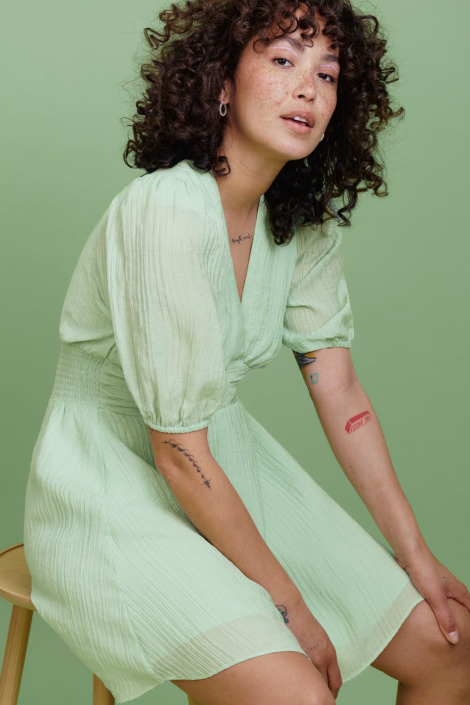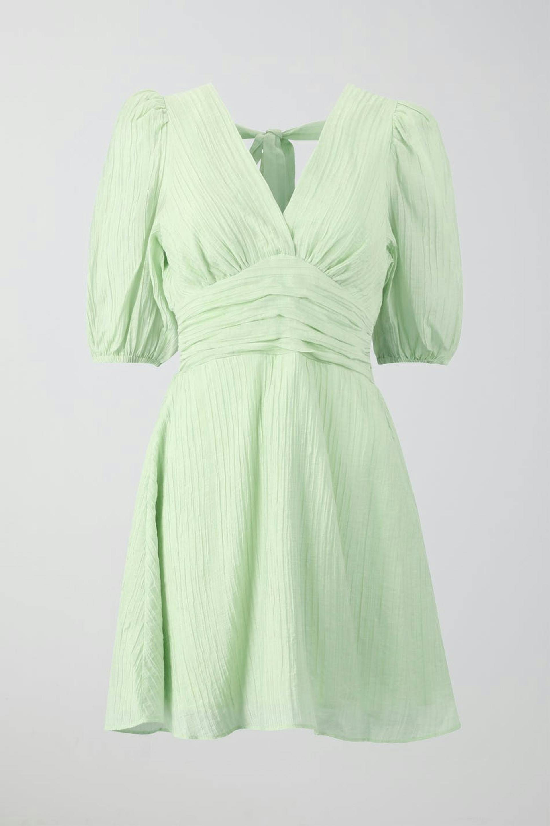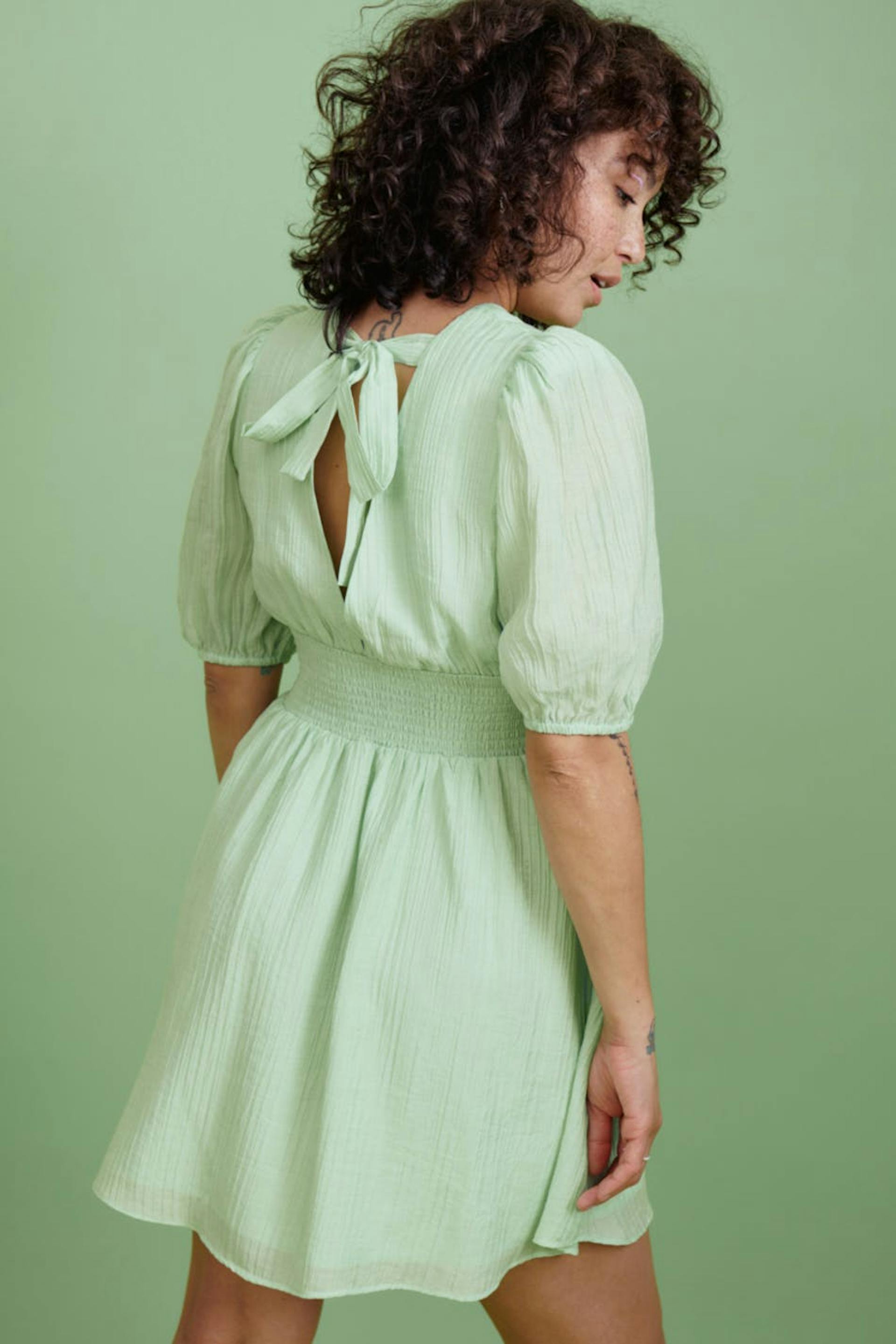 Miniklänning med voluminösa ärmar. Klänningen är grön och har v-ringning fram med knytning i ryggen. Den har smock bak.