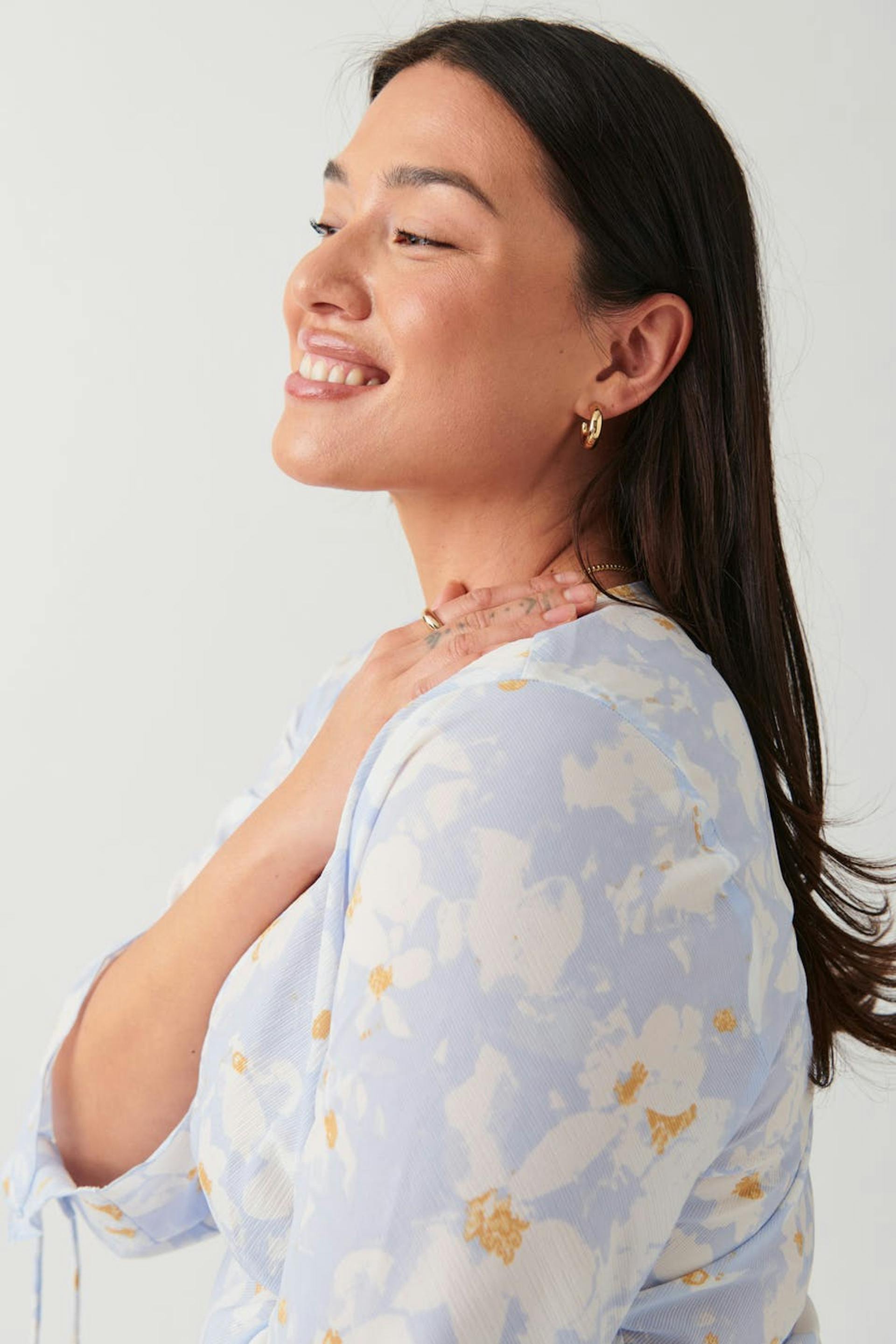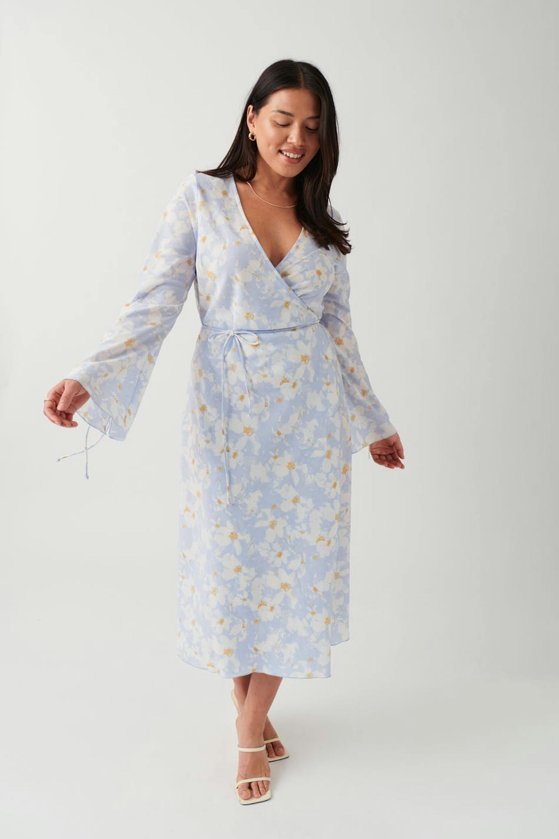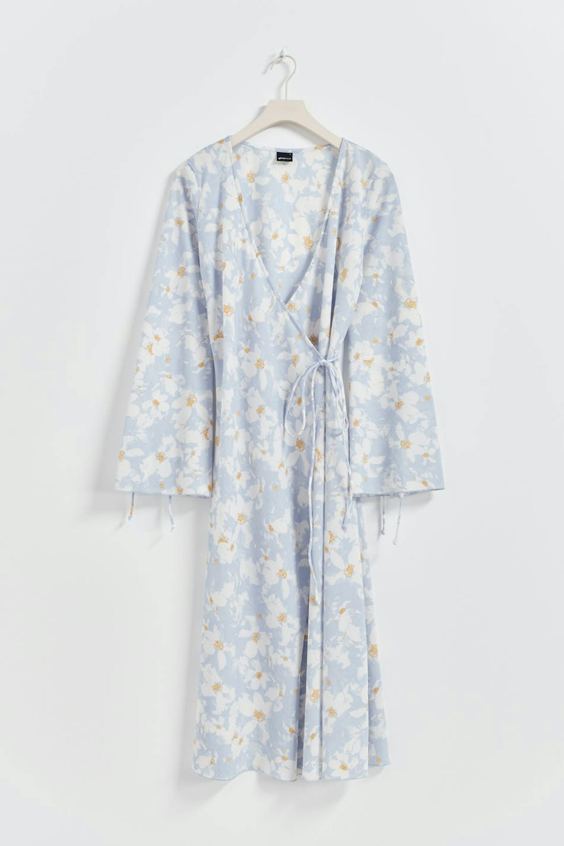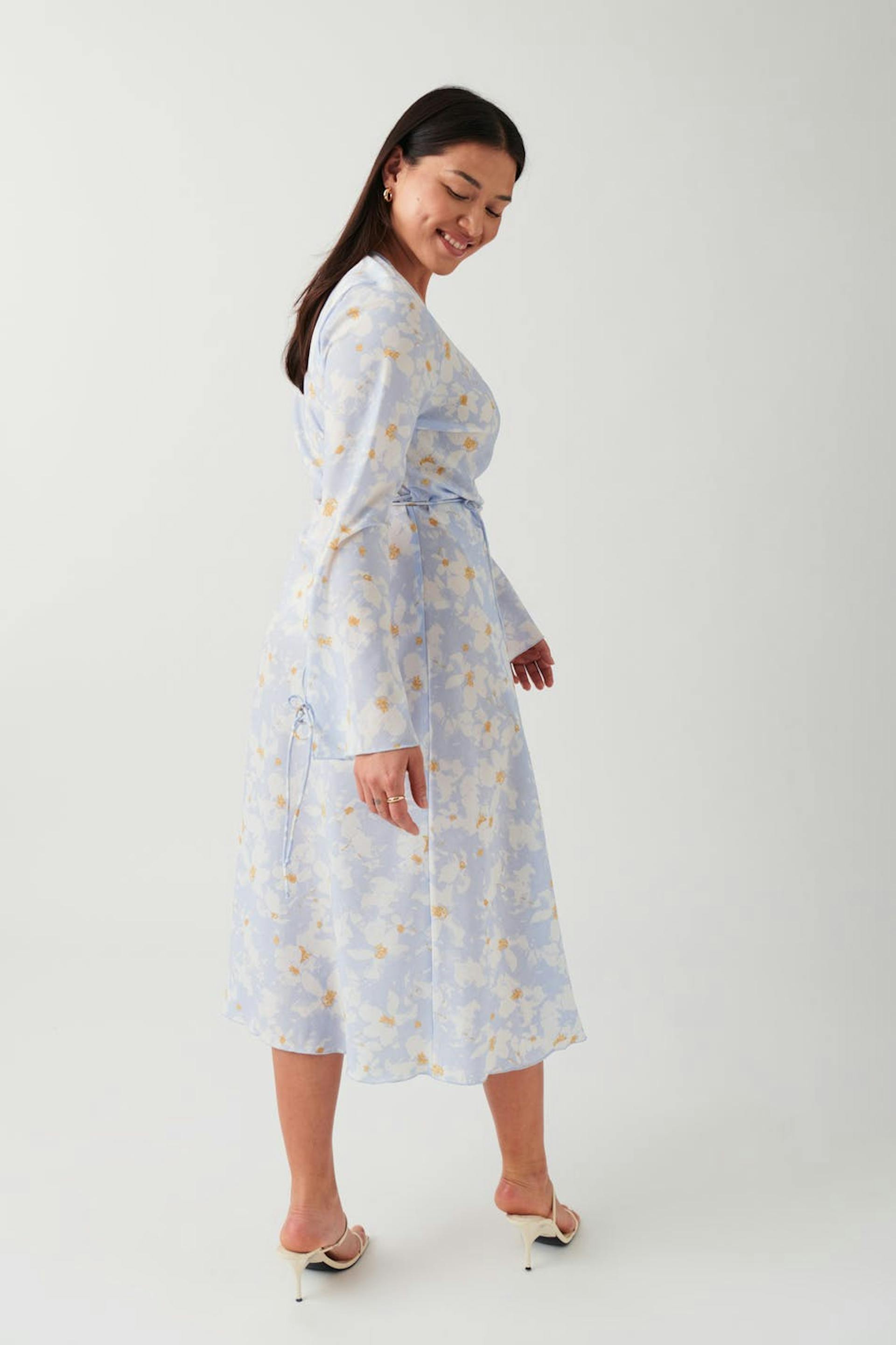 Blommig klänning med knytning i midjan. Klänningen är blå och har v-ringning. Den har midilängd och lång ärm med slits och knytdetalj.