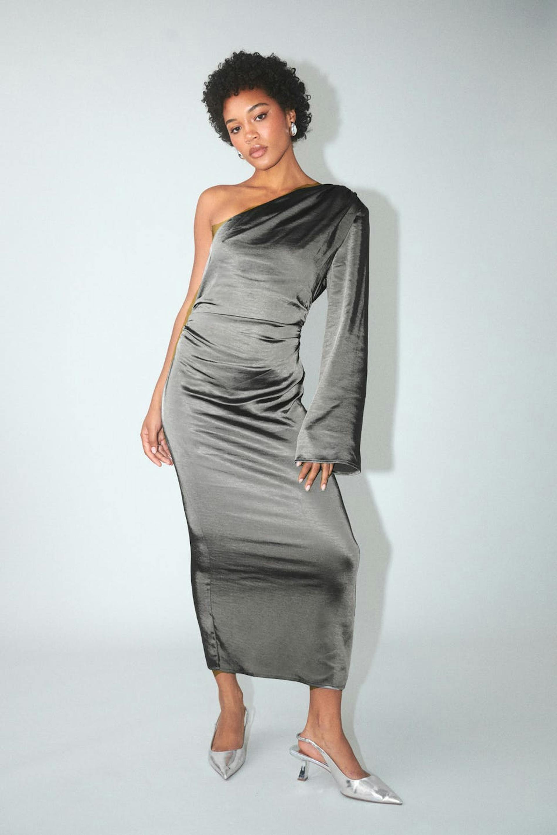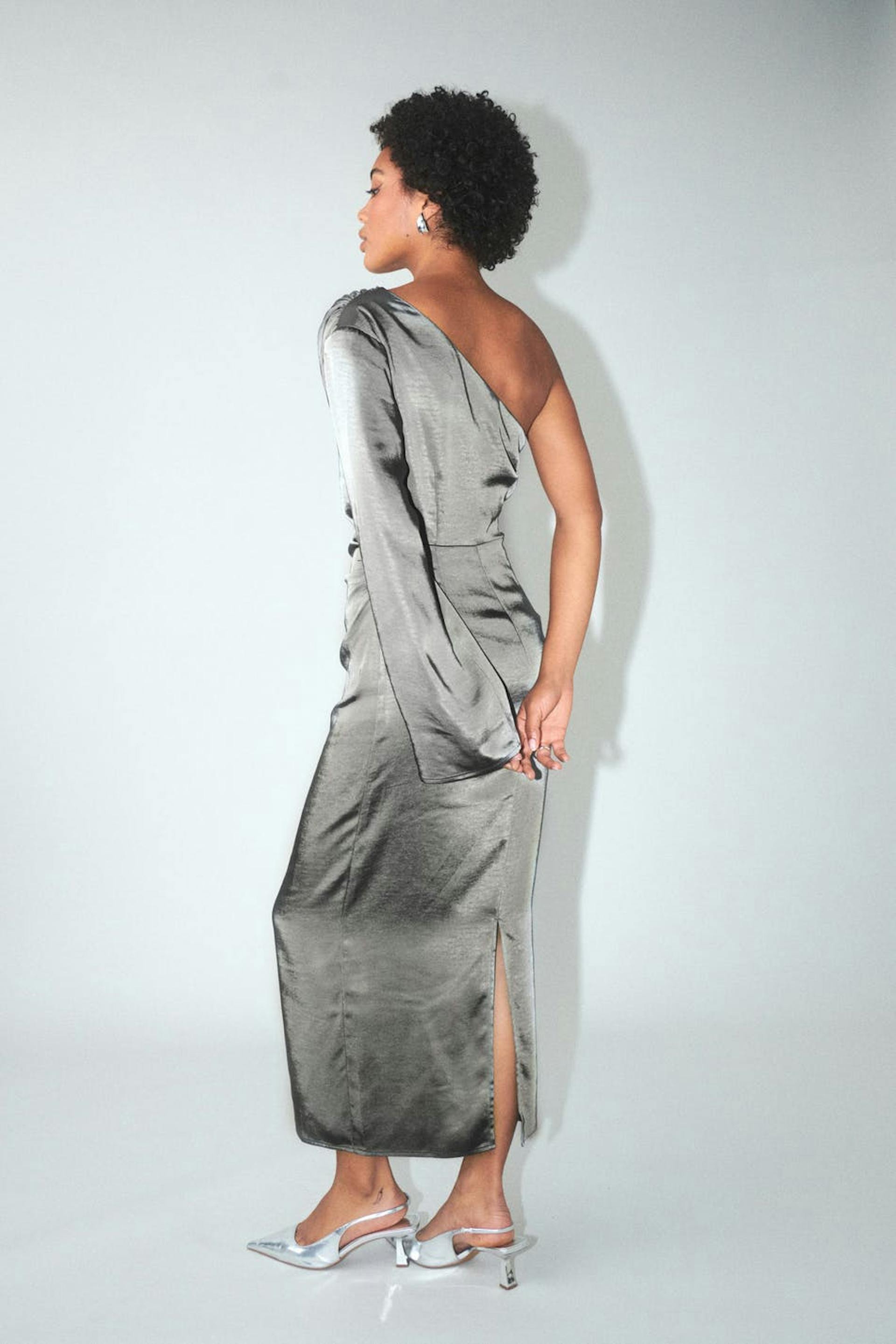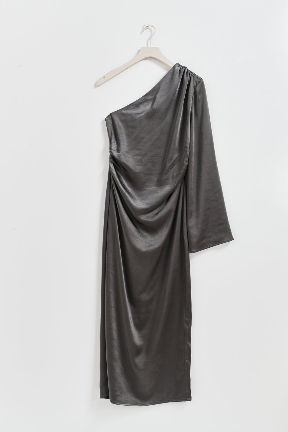 One shoulder-klänning i satin med lång ärm. Klänningen är grå och har rynkningar i midjan och på axeln. Den har dragkedja i sidosömmen och midilängd.