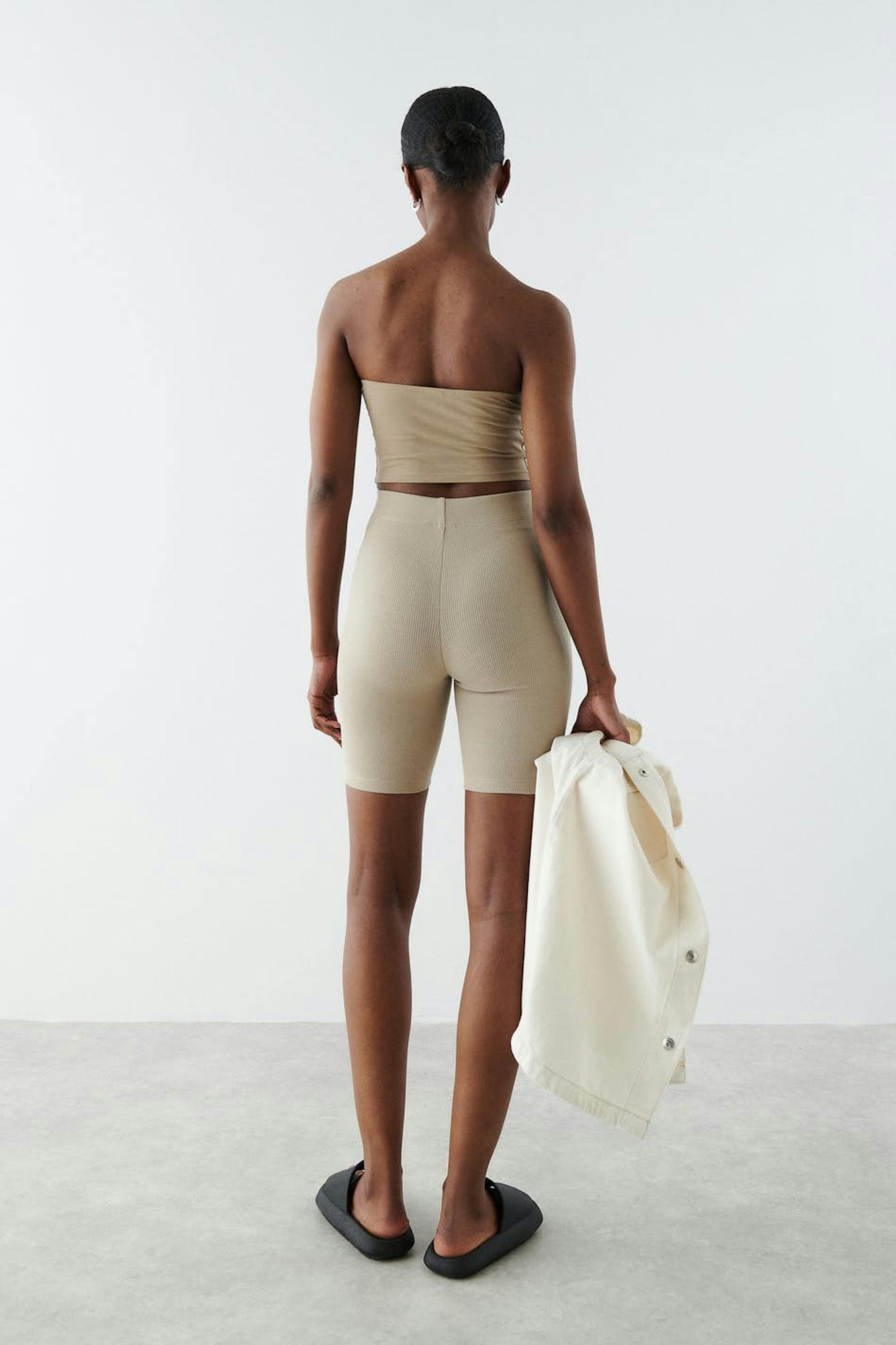 Ribbade bikershorts med en figurnära passform. Shortsen är beigea och har en resår i midjan.