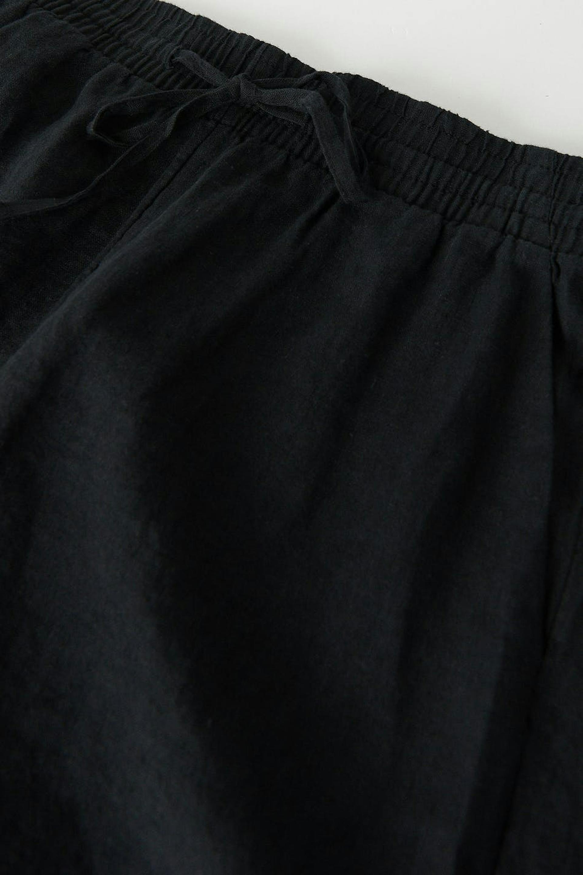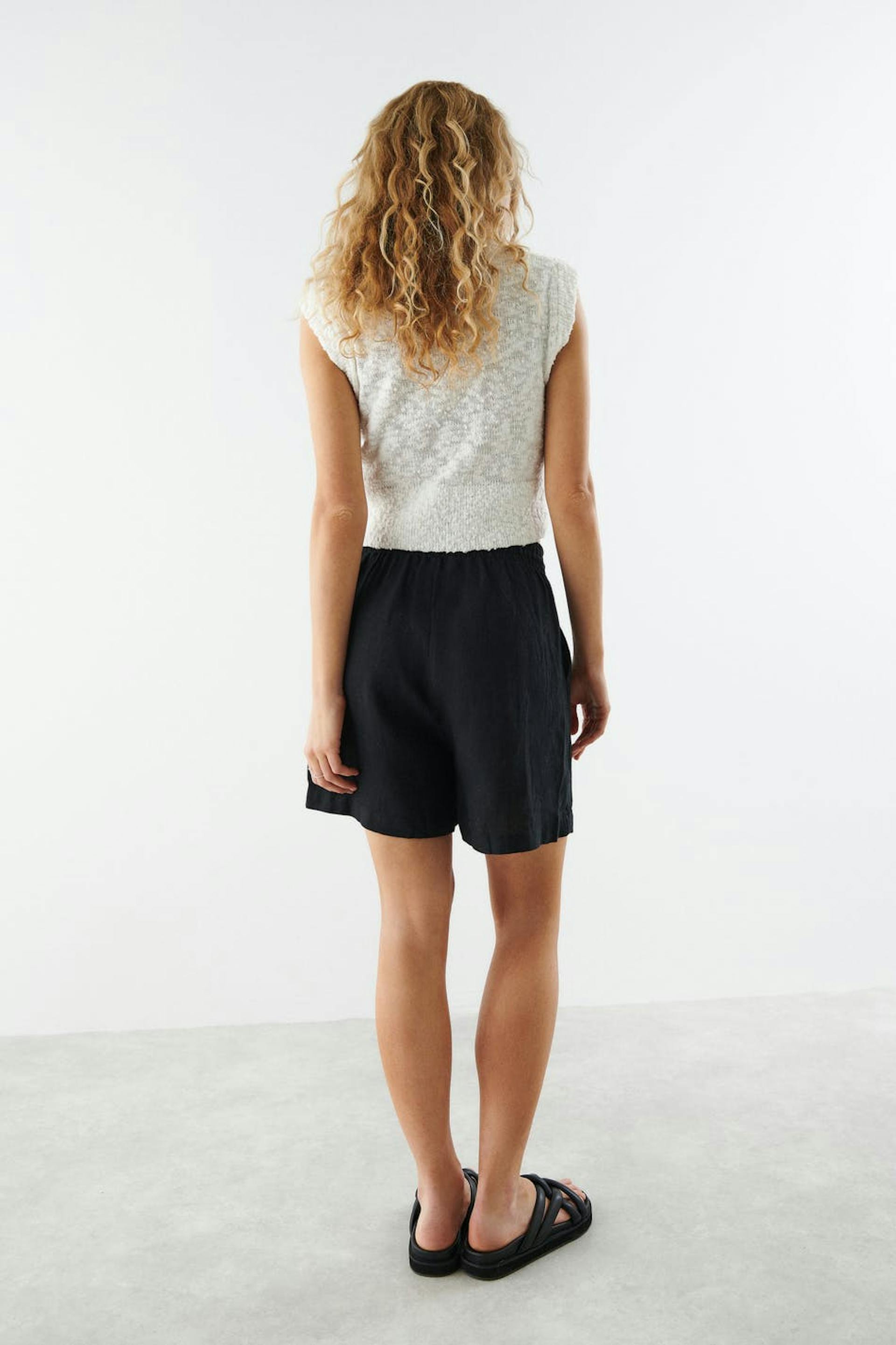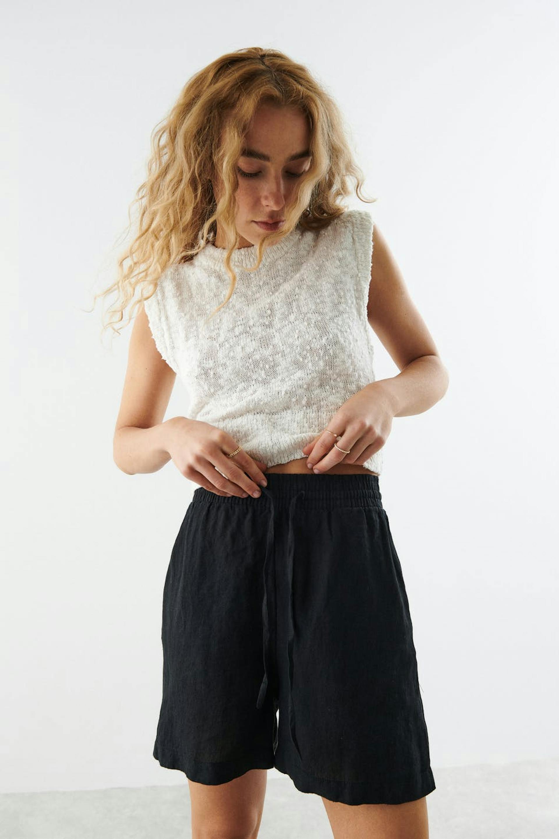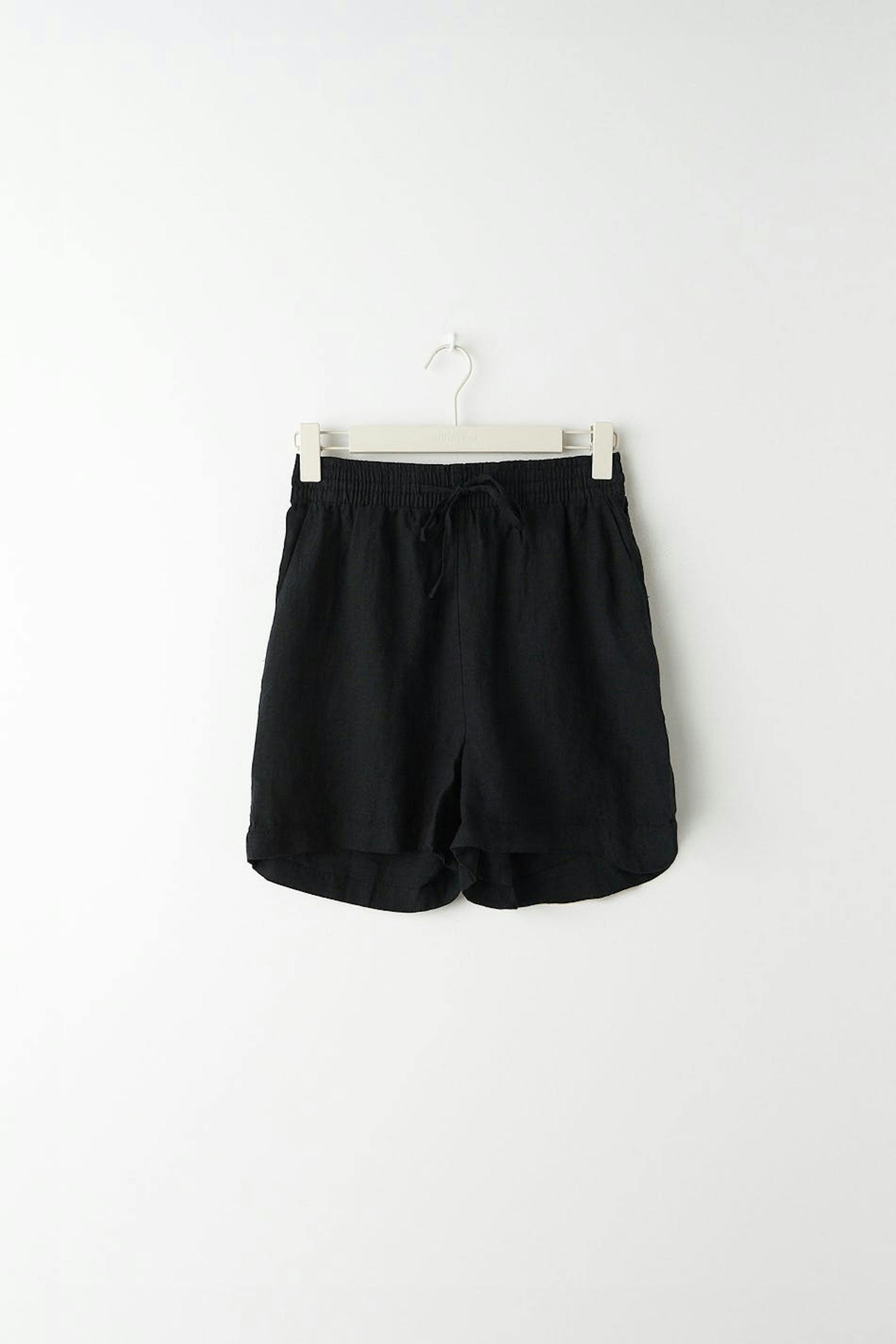 Linneshorts med hög midja. Shortsen är svarta och har fickor på sidorna. De har en vävd kvalitet i linne, resår i midjan och en justerbar dragsko med knytning framtill.