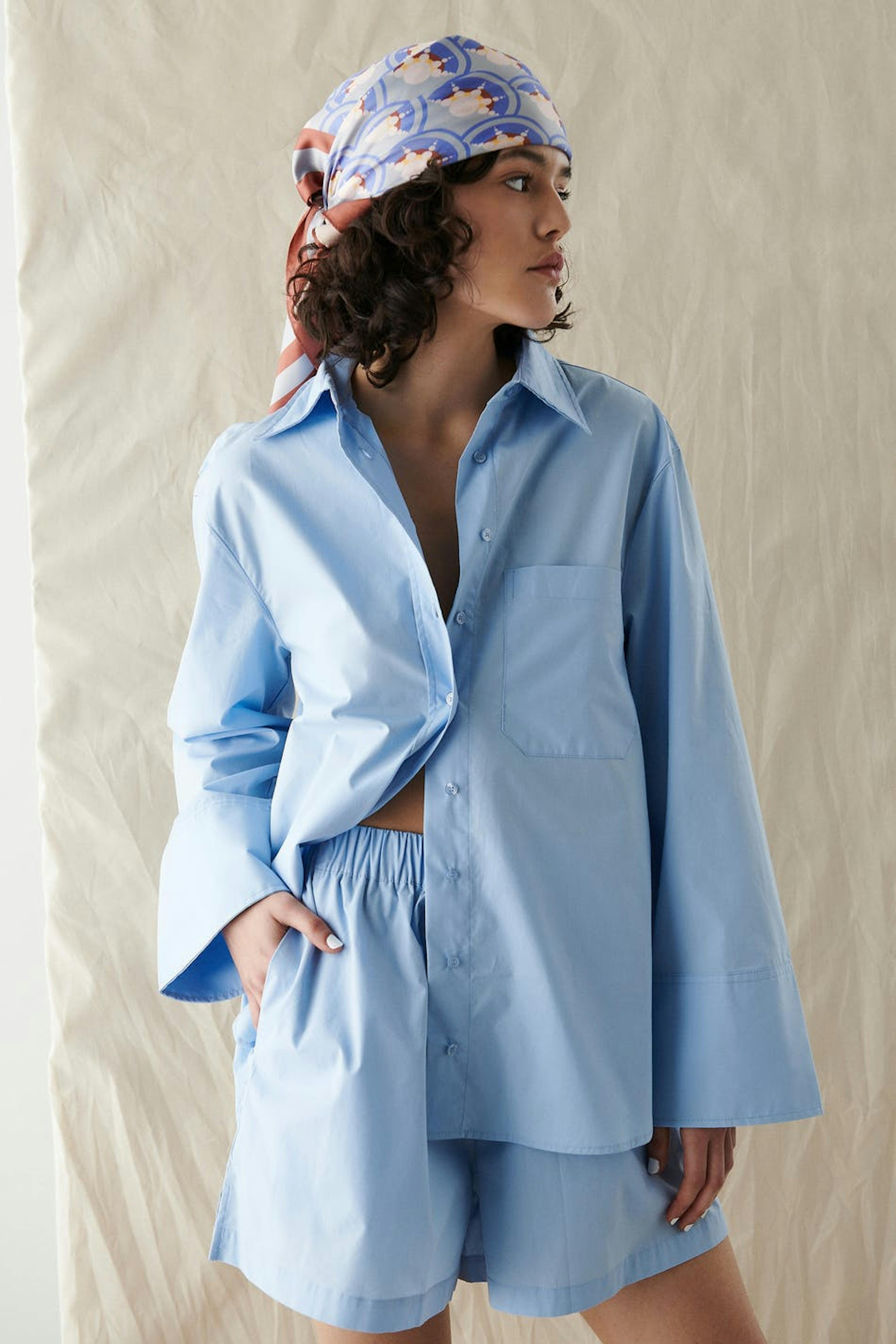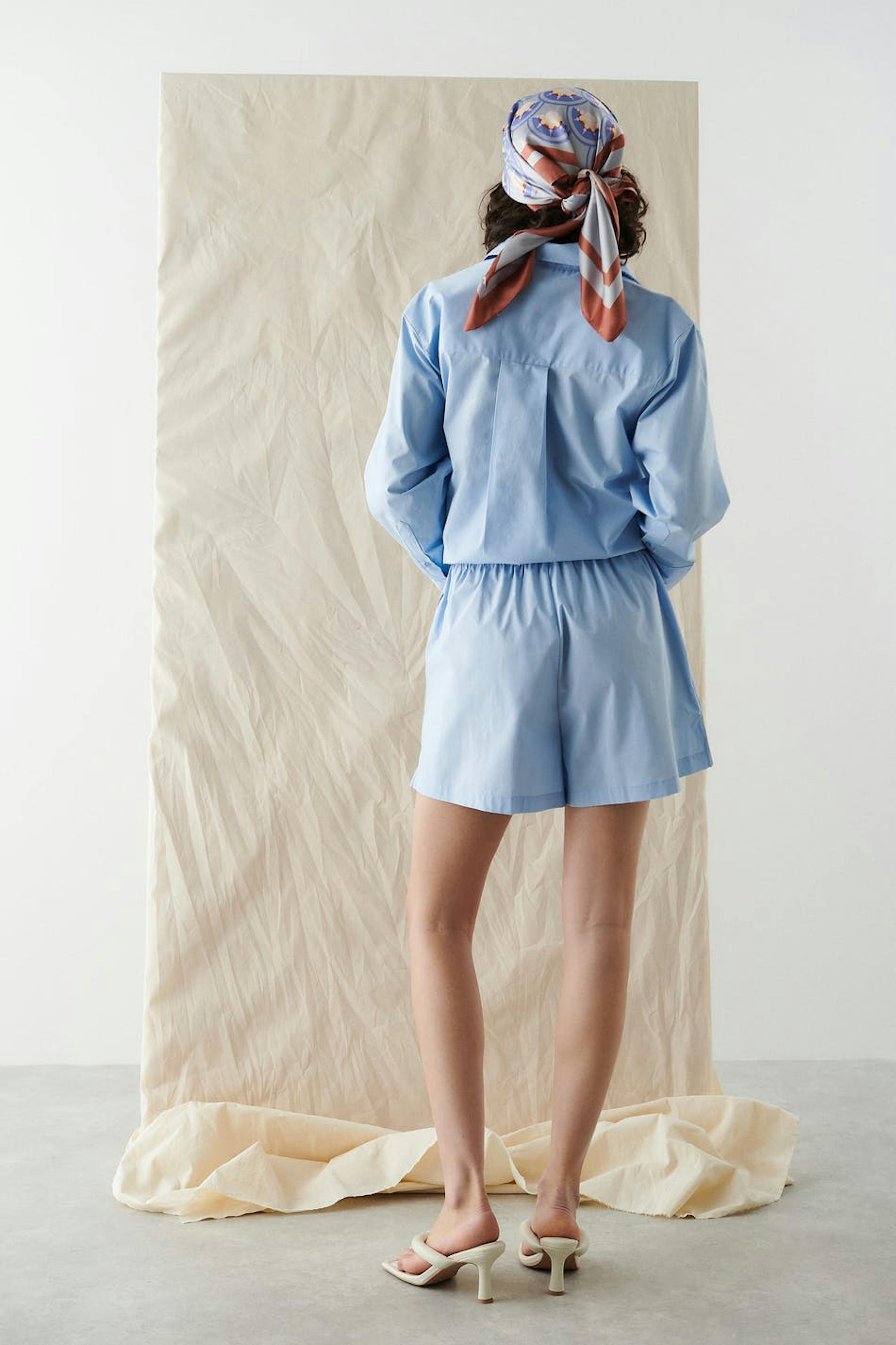 Shorts med hög midja. Shortsen är blåa och har en vävd kvalitet i bomullspoplin. De har en boxig passform, fickor på sidorna, resår i midjan och sprund i sidorna.