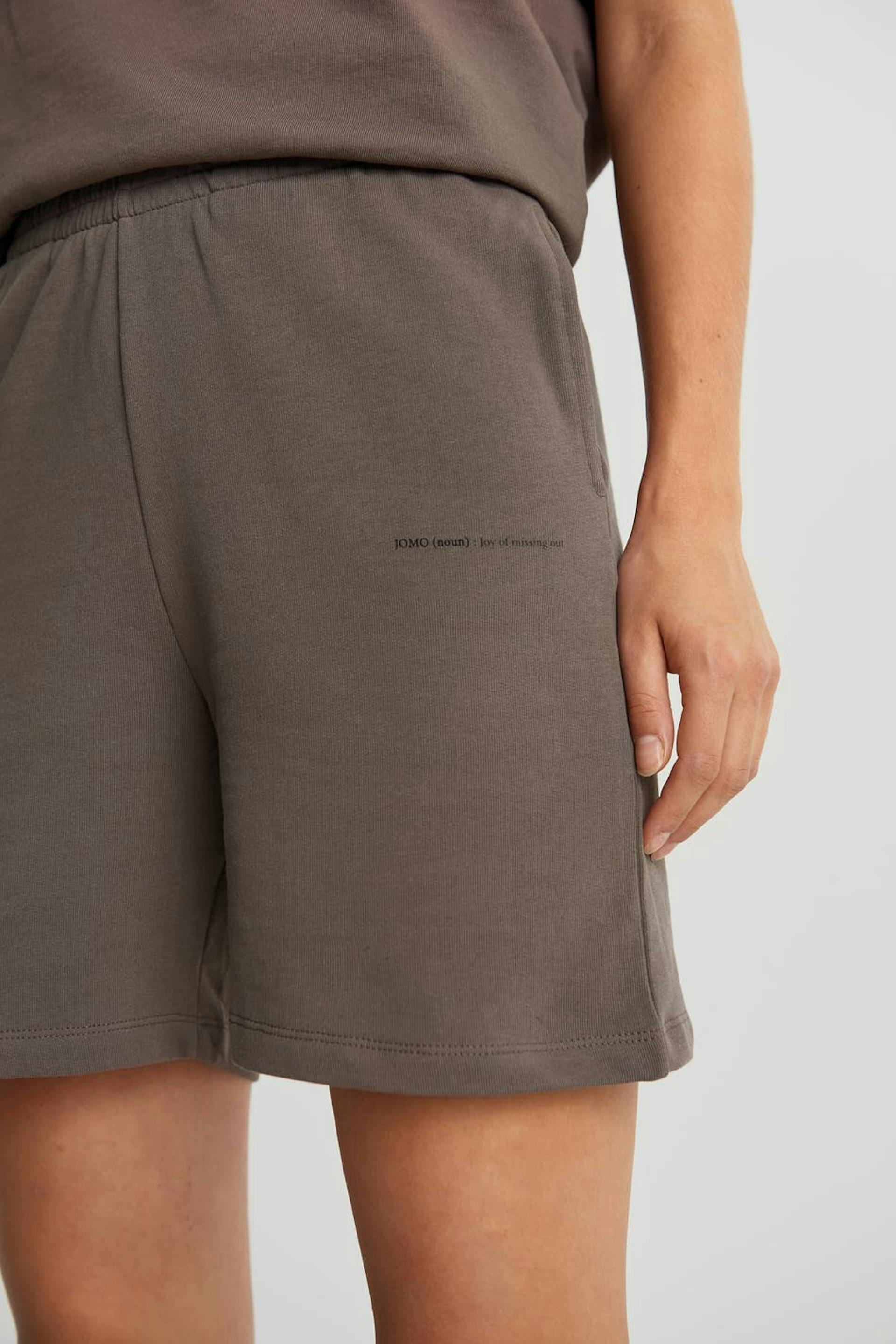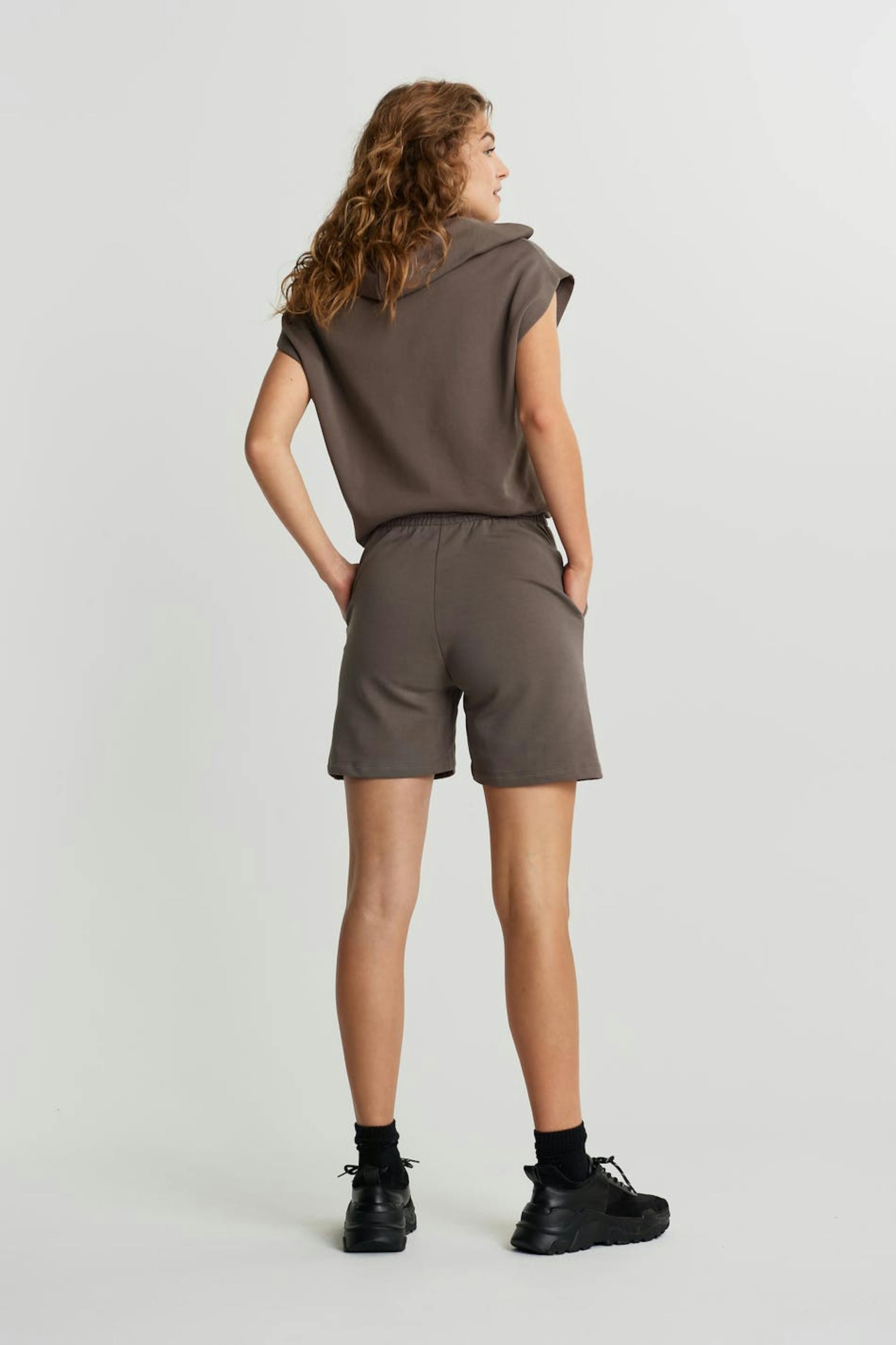 Långa shorts med en normal passform. Shortsen är bruna och har en hög midja i resår. De är gjorda av sweatshirttyg i bomull.