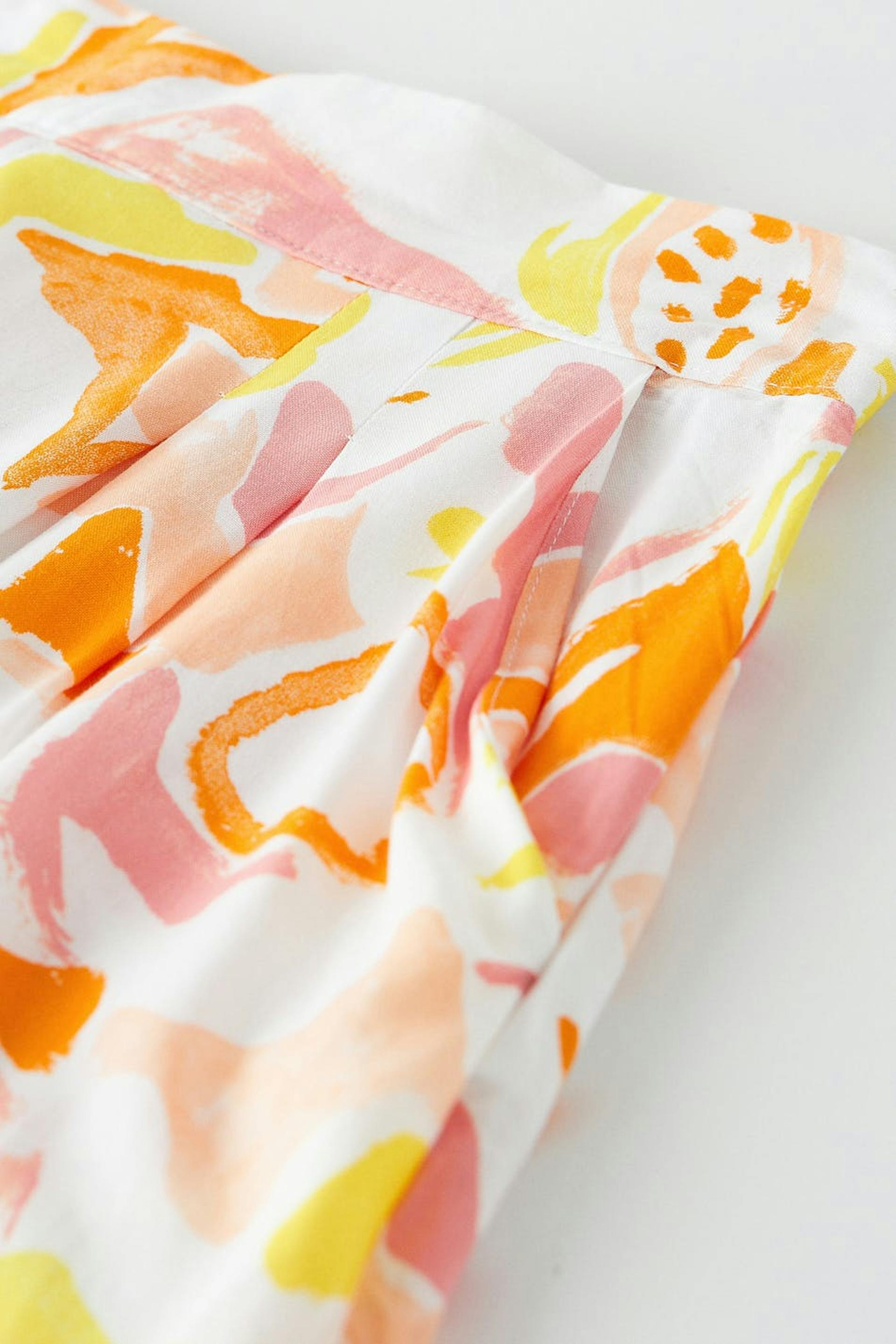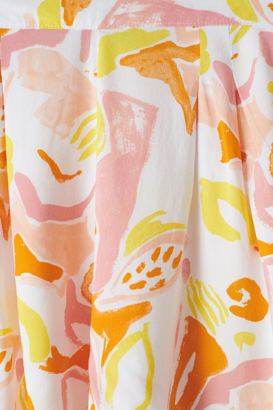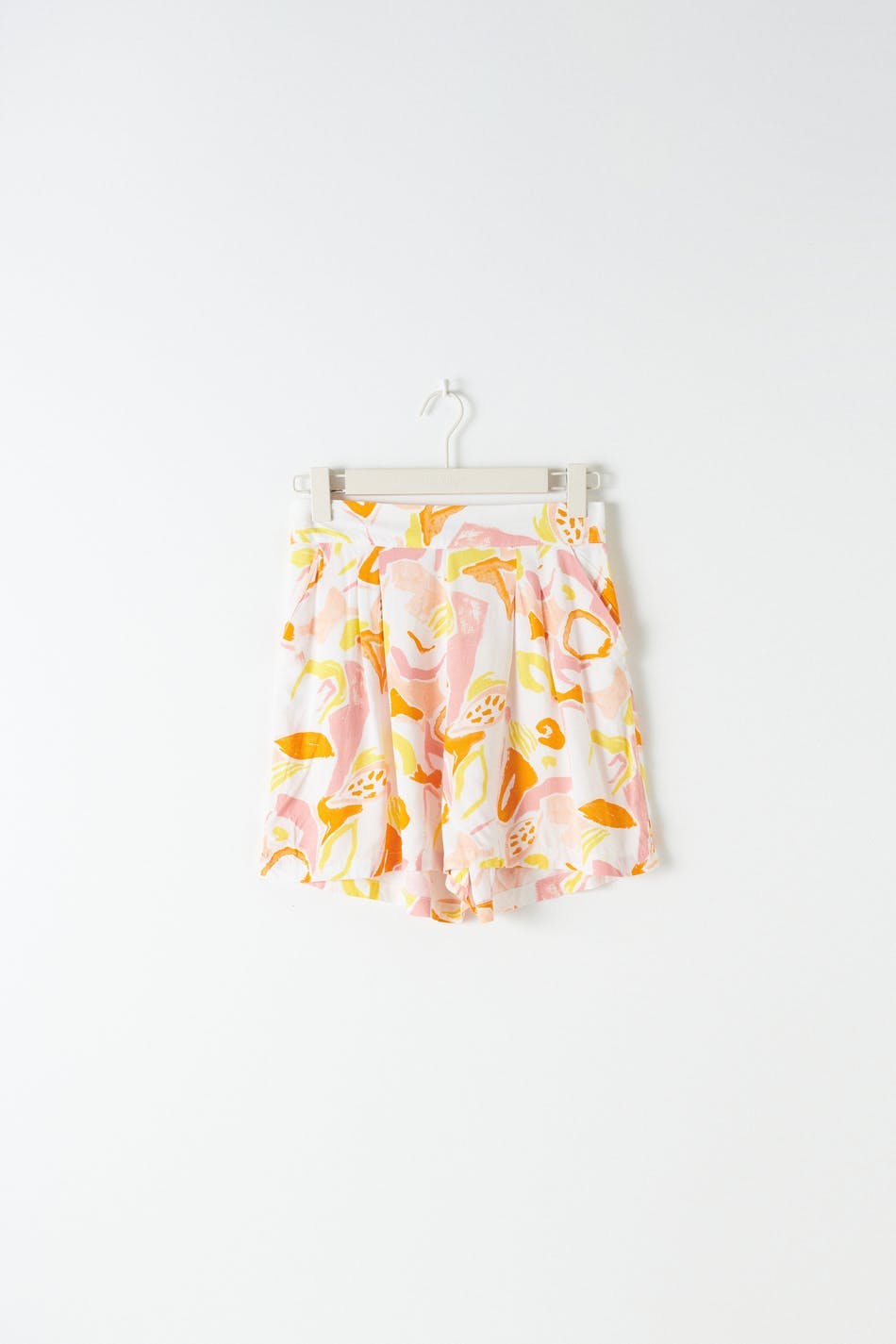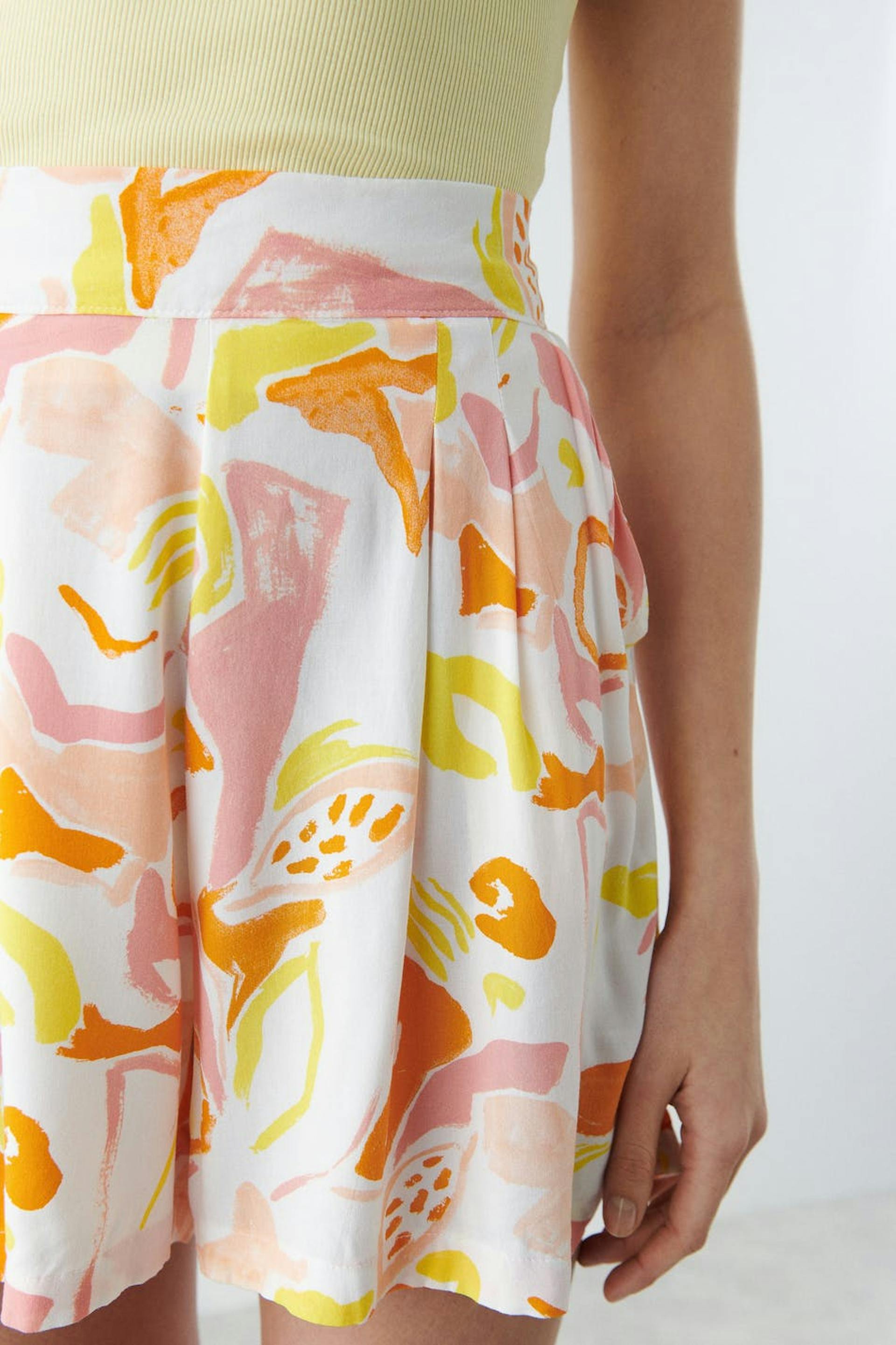 Mönstrade shorts med veck framtill. Shortsen är gula, korta och vida. De har sidofickor och en midja med en resår baktill.
