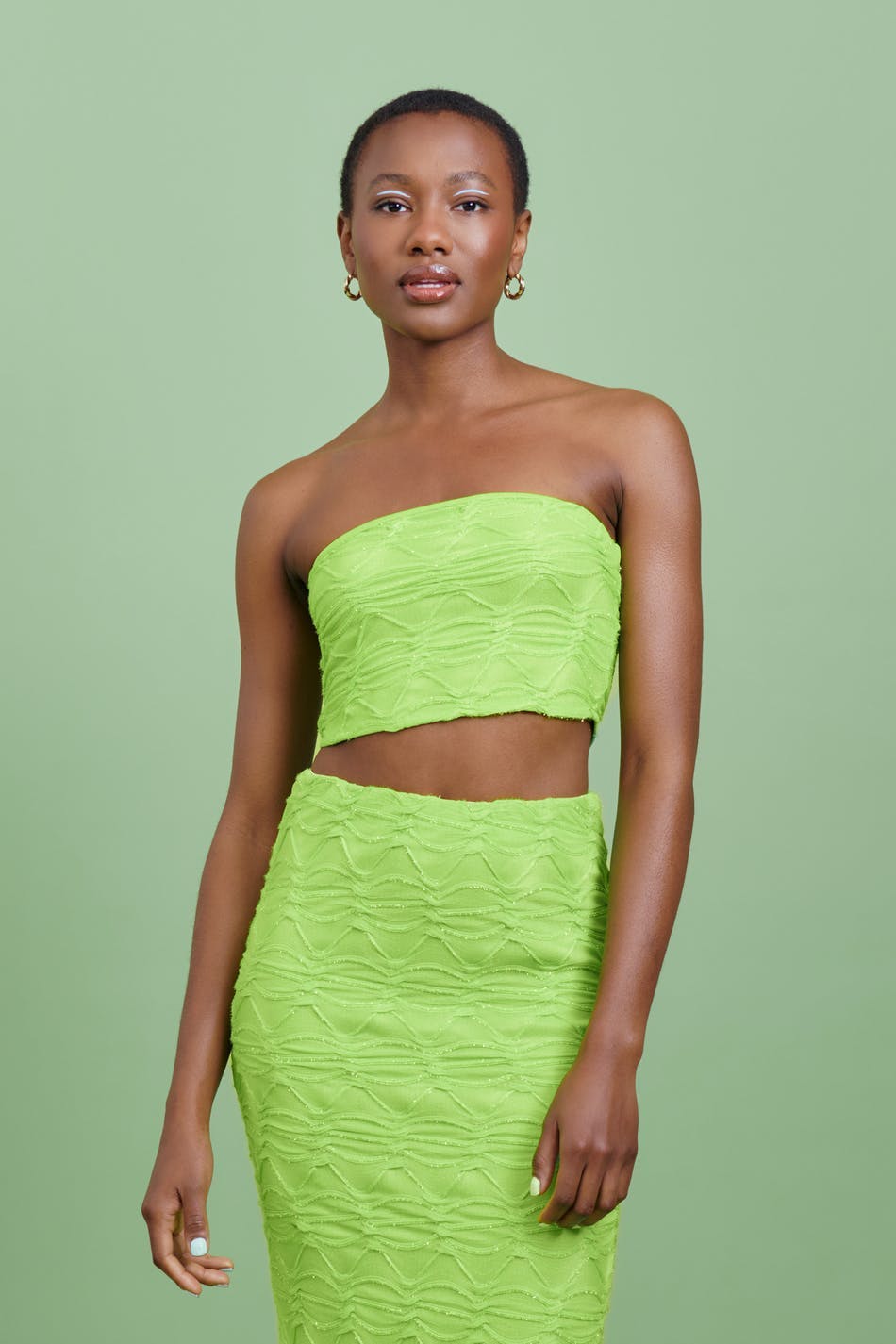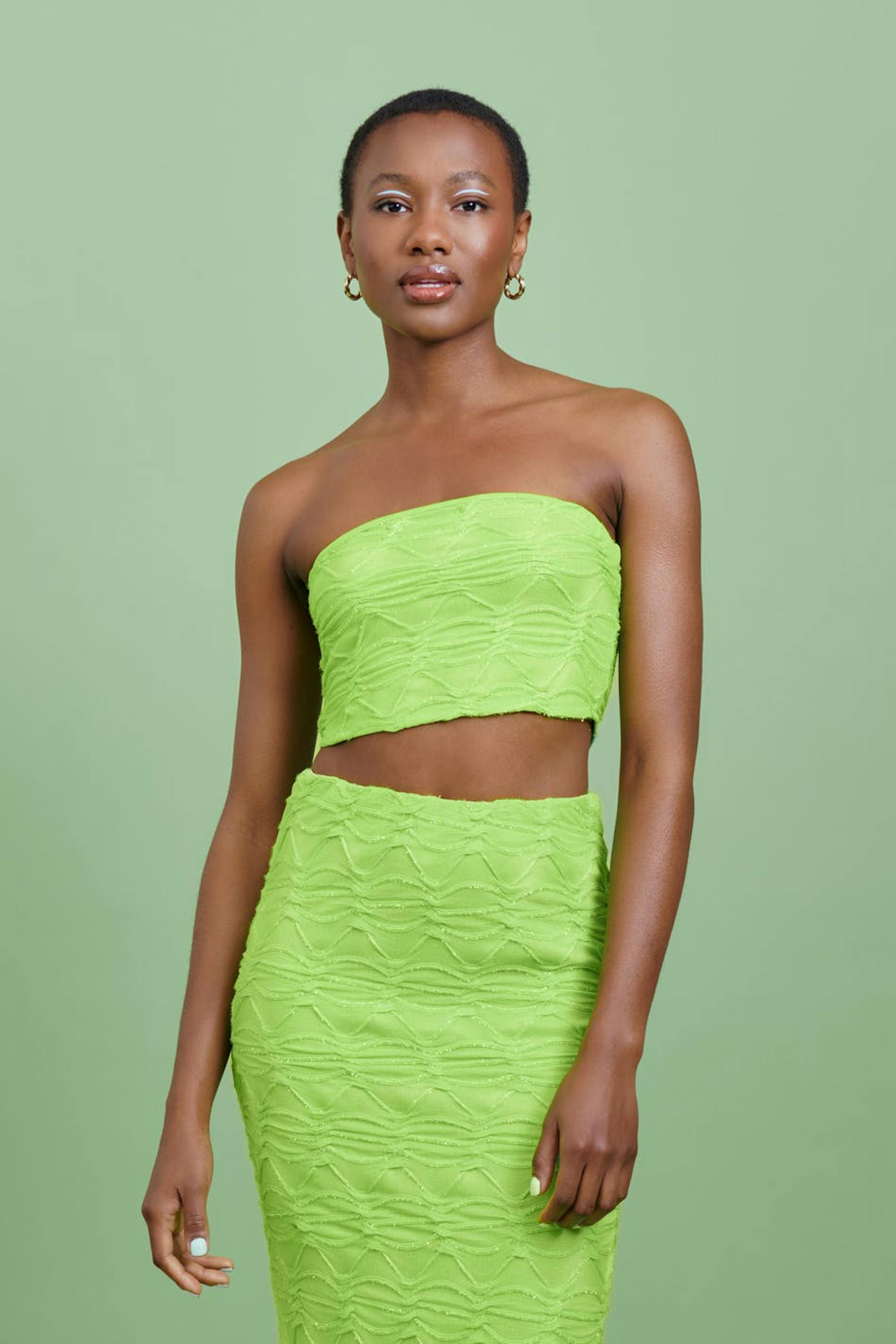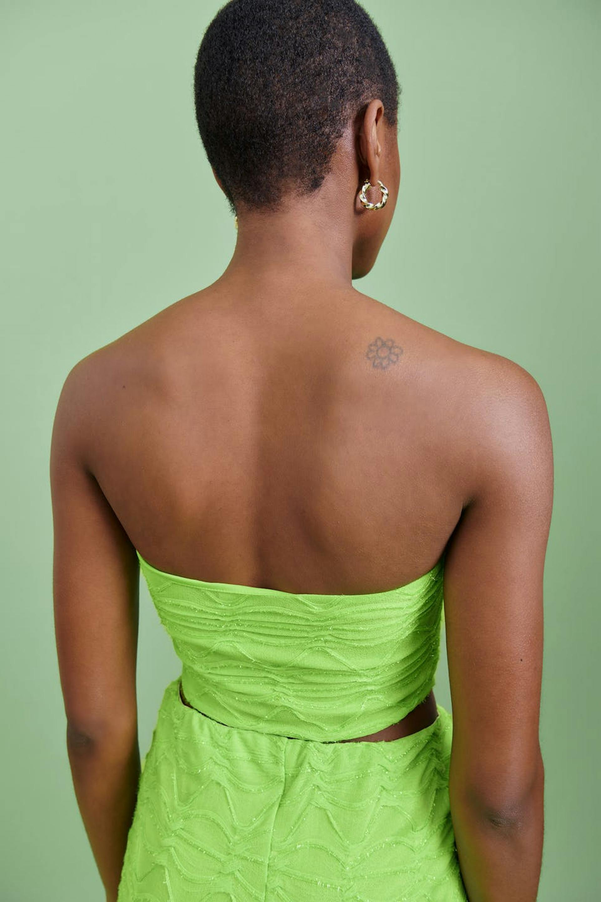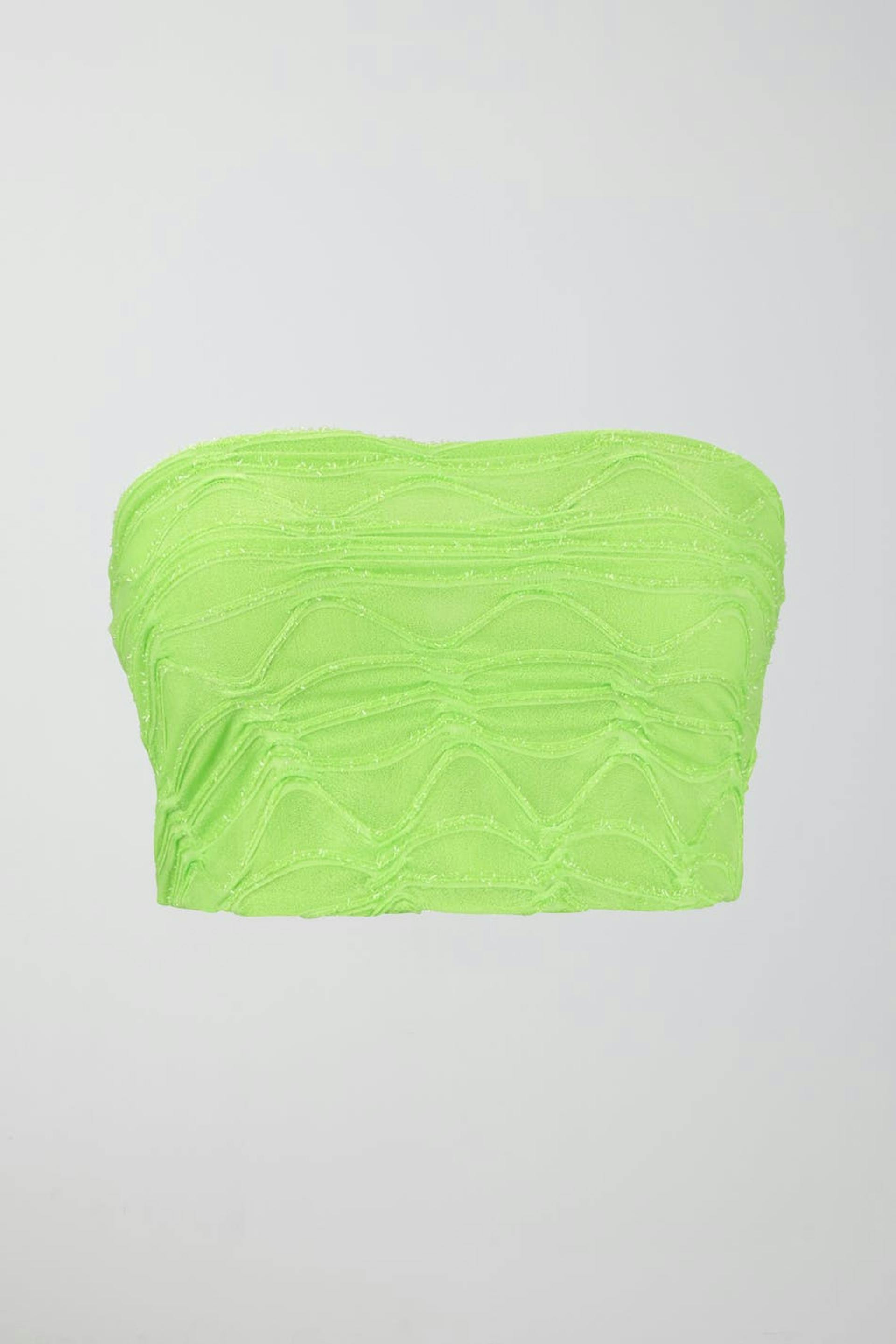 Glittrig tubtopp med figurnära passform. Toppen är grön, croppad och helfodrad. Den har strukturerad yta och stretchig kvalitet.